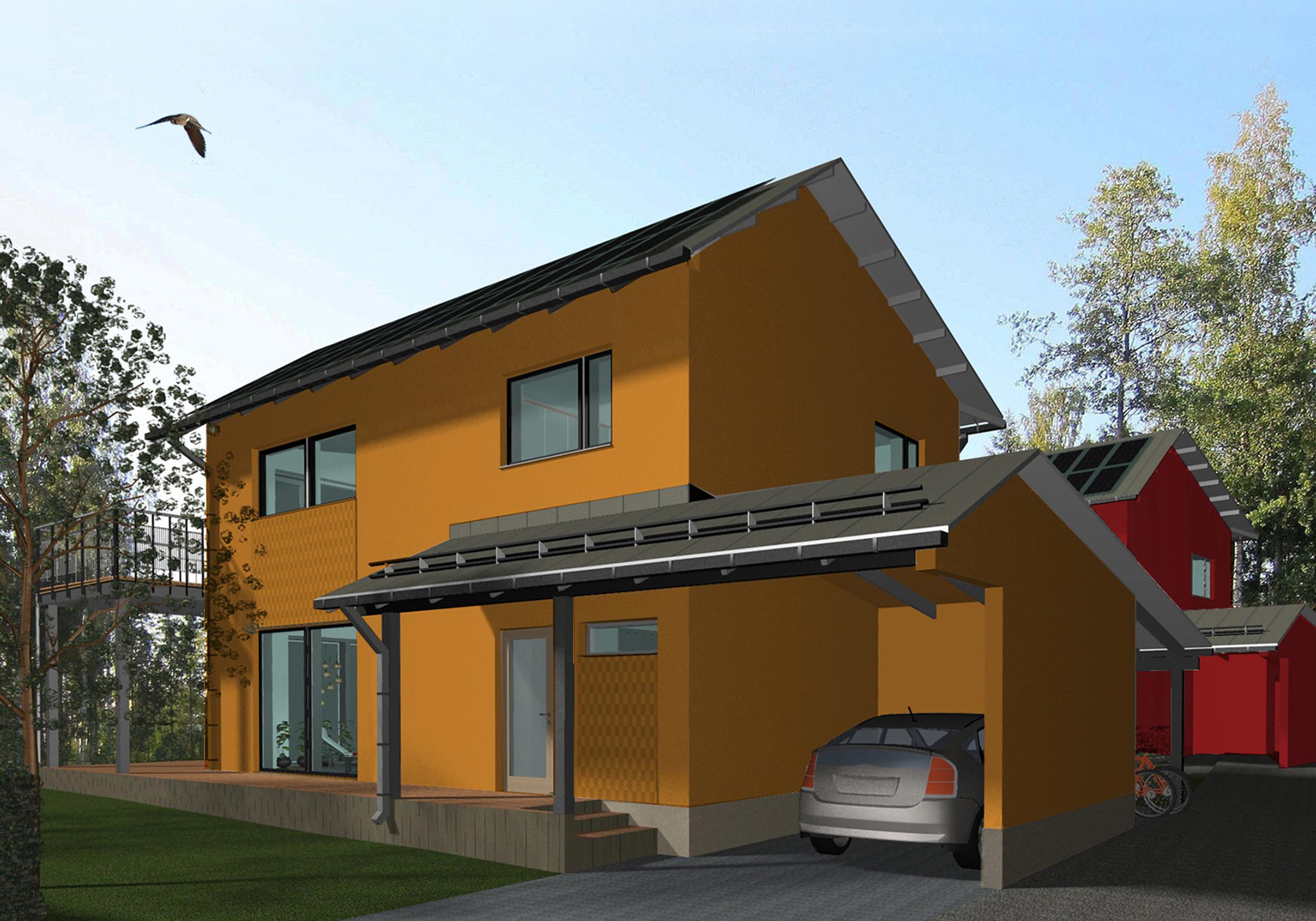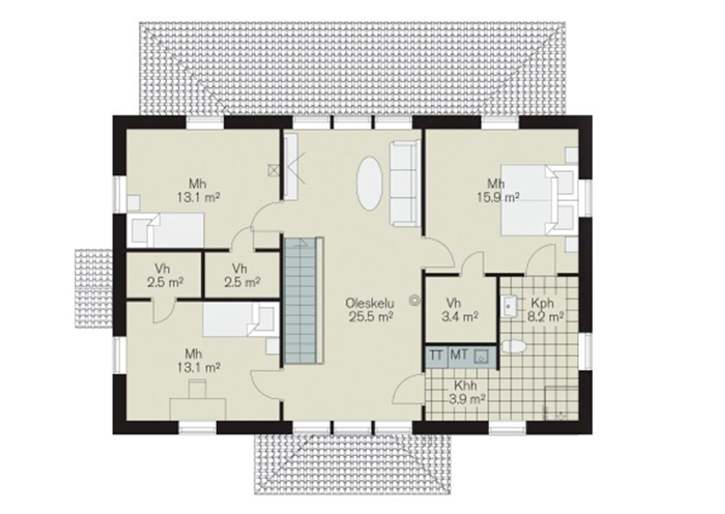 Erityistä: Kaikki makuuhuoneet on sijoitettu järkevästi yläkertaan. Vanhempien makuuhuoneesta on käynti tilavalle länteen avautuvalle parvekkeelle. Talon iso ja osittain katettu terassi on sijoitettu oleskelupihan suuntaan. Taloon on asennettu kotiautomaatiojärjestelmä.