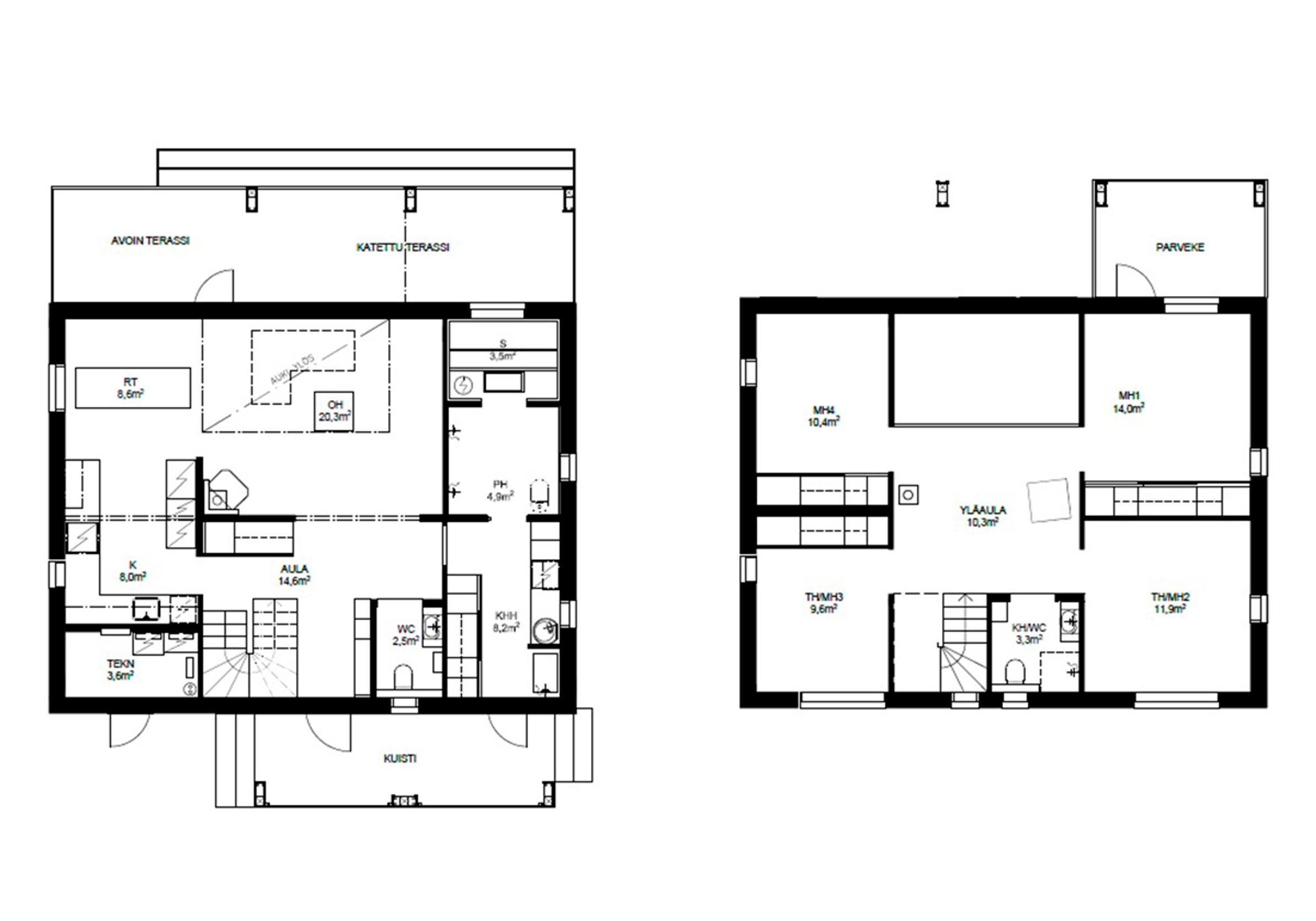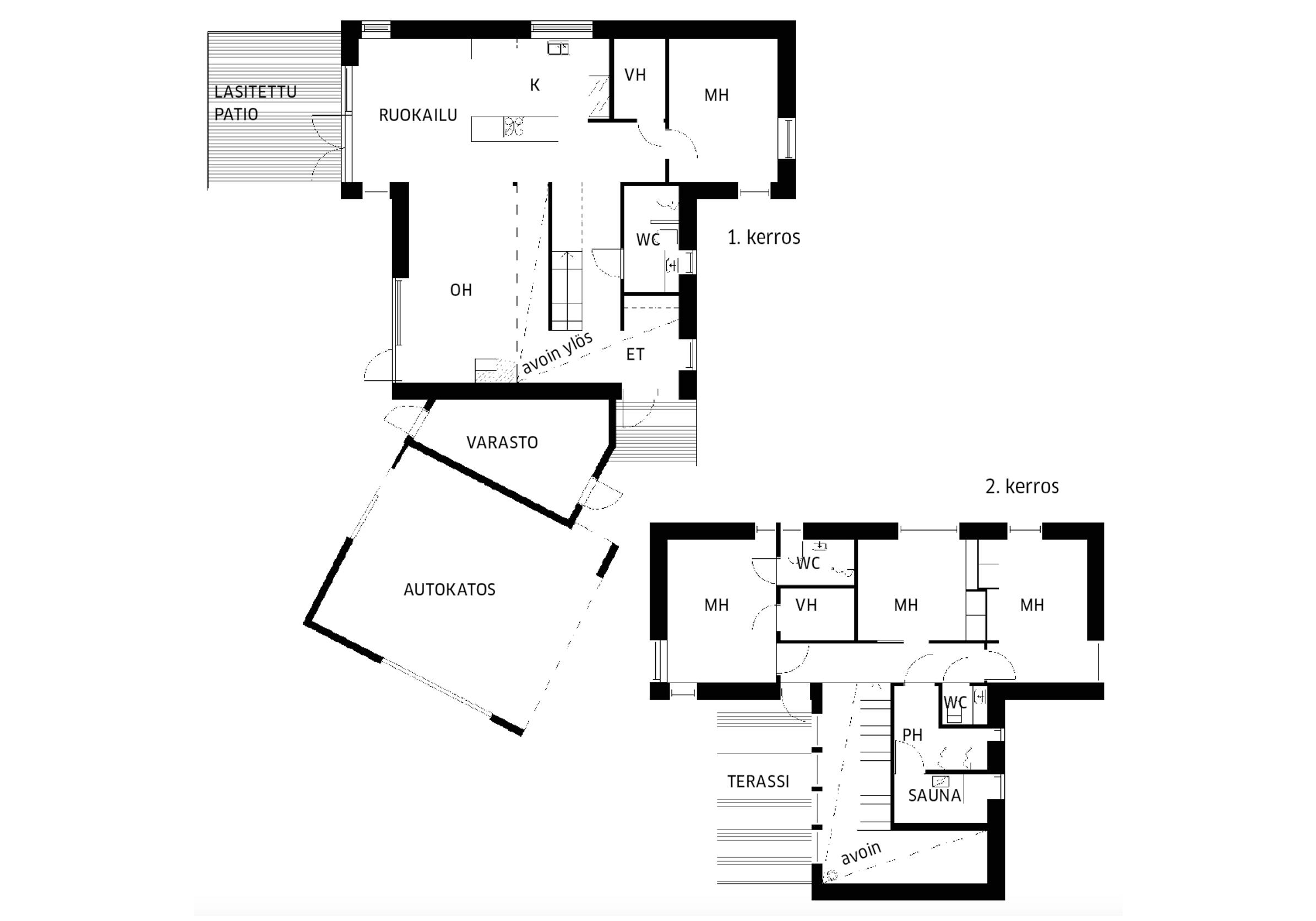 Erityistä: Suunnittelun lähtökohtana on ollut arjen toiminnallisuus. Taloon haluttiin tilan tuntua, sisääntulo on korkeaa valoisaa tilaa, josta avautuvat näkymät ylä- ja alakertaan ja isolle terassille. Jokaisen makuuhuoneen yhteydessä on wc suihkutiloineen. Säilytystilaa on runsaasti ja molemmissa kerroksissa on kodinhoitotilat.