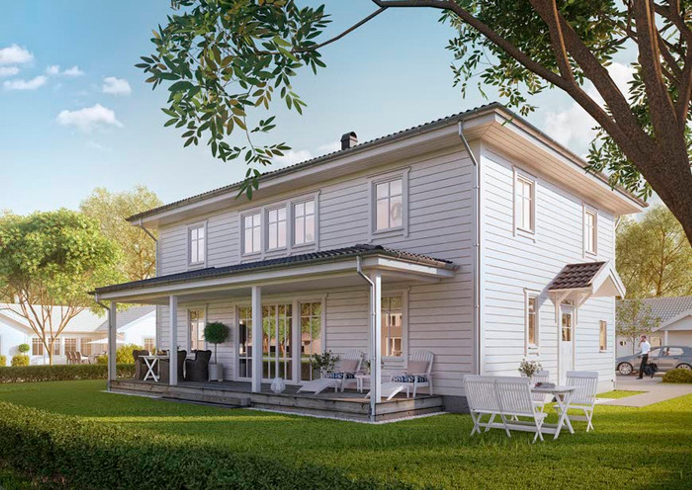 Erityistä: Ruotsalaisen talotehtaan New England -vaikutteisessa talossa on kolmen makuuhuoneen yhteydessä myös vaatehuone. Suurimman makuuhuoneen yhteydessä on myös oma kylpyhuone.