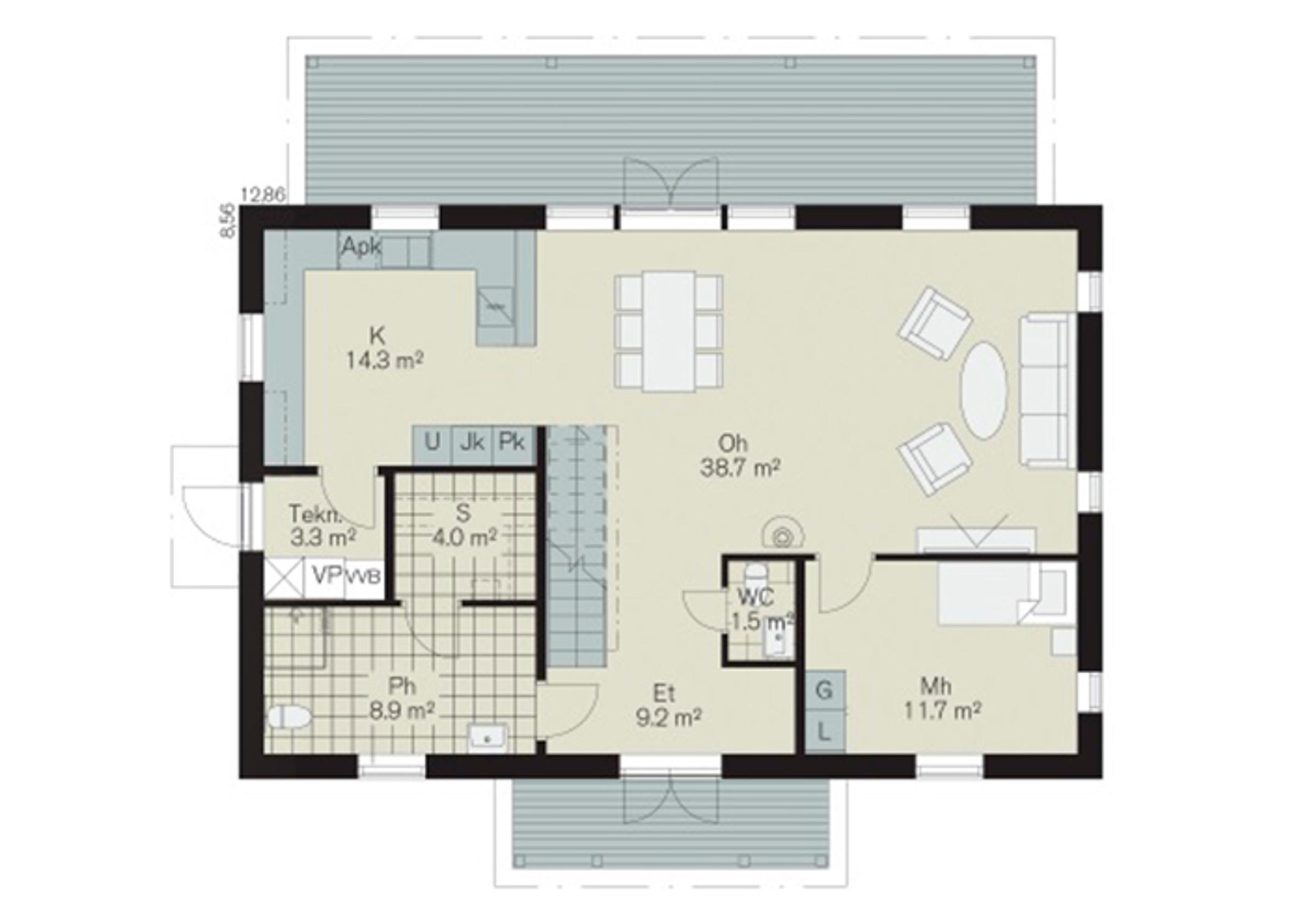 Näytteilleasettaja: Muurametalot Arkkitehti: Mikko Mella-Aho, Suunnittelutyö Tilatoive Energialuokka: B E-luku: 135 Arvioitu lämmitysenergiankulutus (kWh/vuosi): 11 418 Runkomateriaali: puu, tilaelementti Lämmitysjärjestelmä: maalämpö