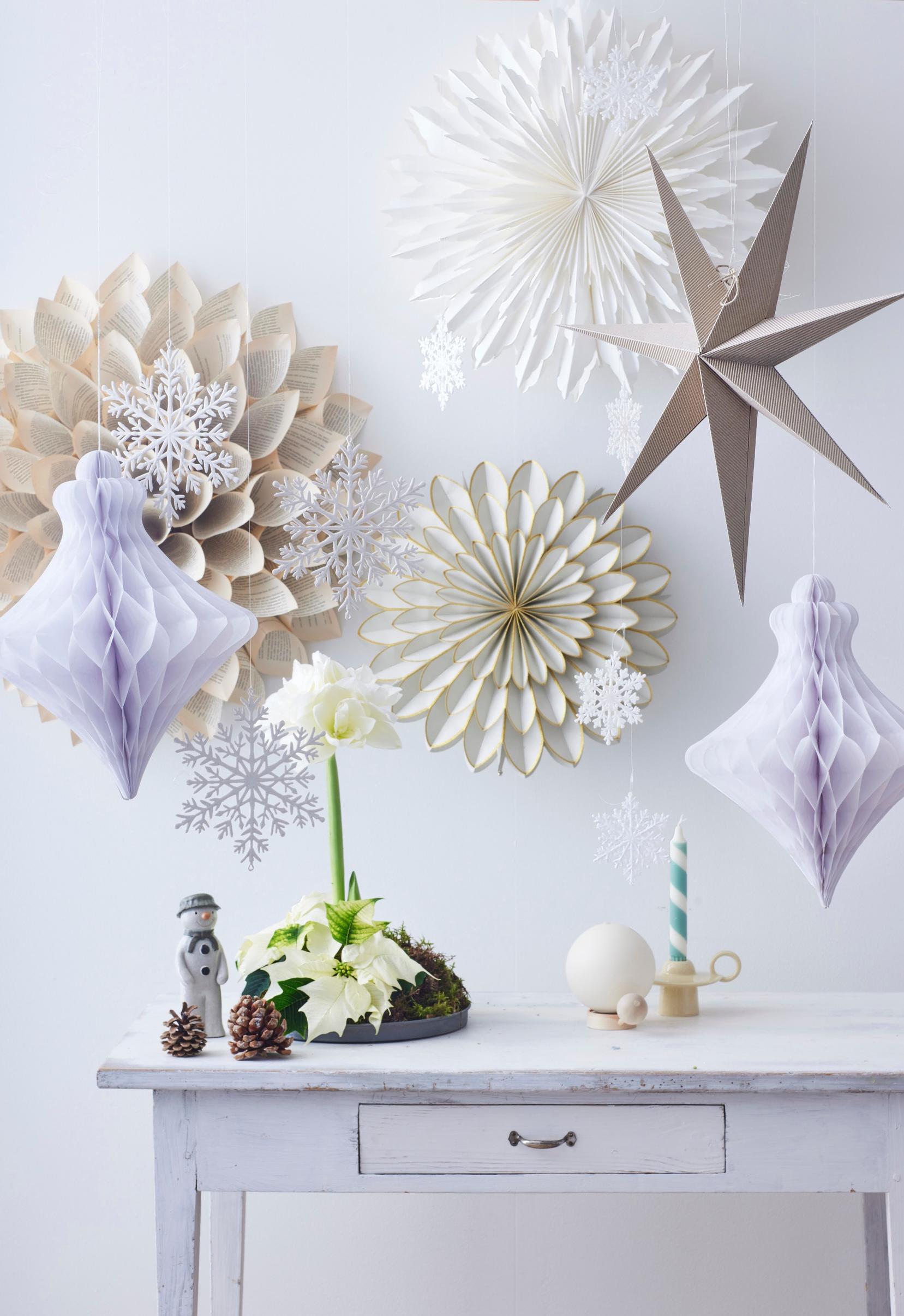Ujuta tähtien lomaan lumihiutalekoristeita ja ripusta ne siiman avulla. Kierrätä vanhan kirjan sivut upeaksi seinäkoristeeksi. Tee amarylliksista ja joulutähdestä asetelma kosteutta kestävälle vadille. Laita joulutähden varsi vesiputkiloon ja työnnä se sammaleeseen.