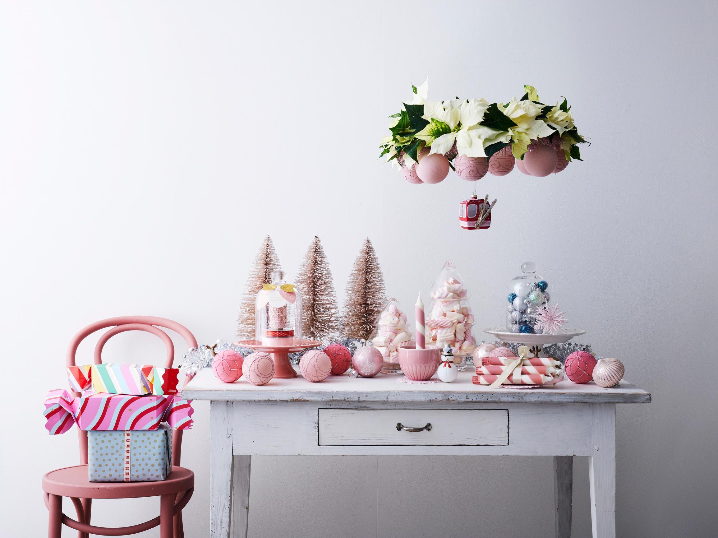 Huurteinen vaaleanpunainen on joulun uusi suosikki. Rakenna asetelmaan korkeuseroja. Täytä lasikupu pienemmillä koristepalloilla tai pinoa sisään joulun kauneimmat koristenauhat.