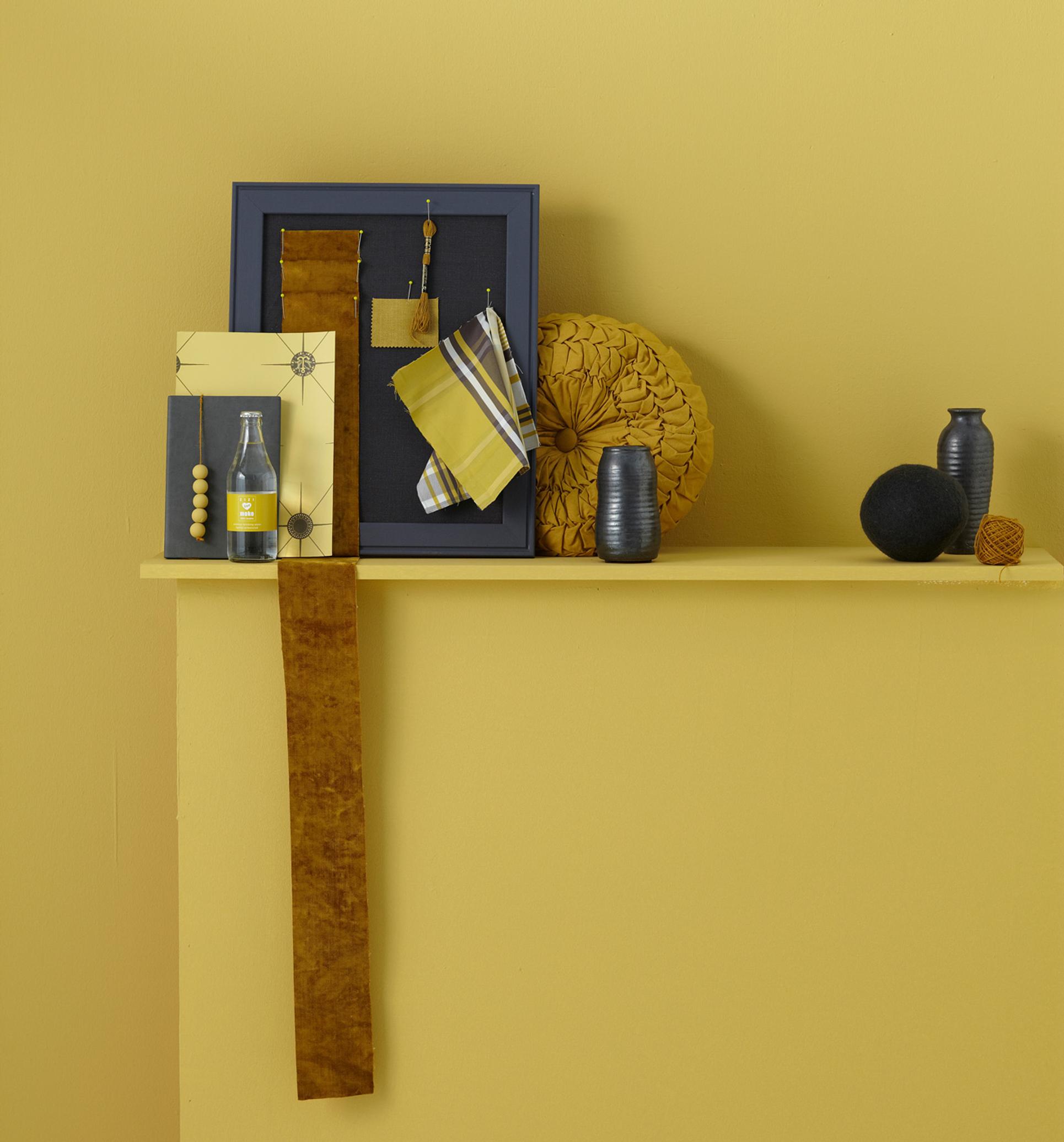 Näin käytät ja yhdistelet harmaata ja sinapinkeltaista väriä eri pinnoilla.