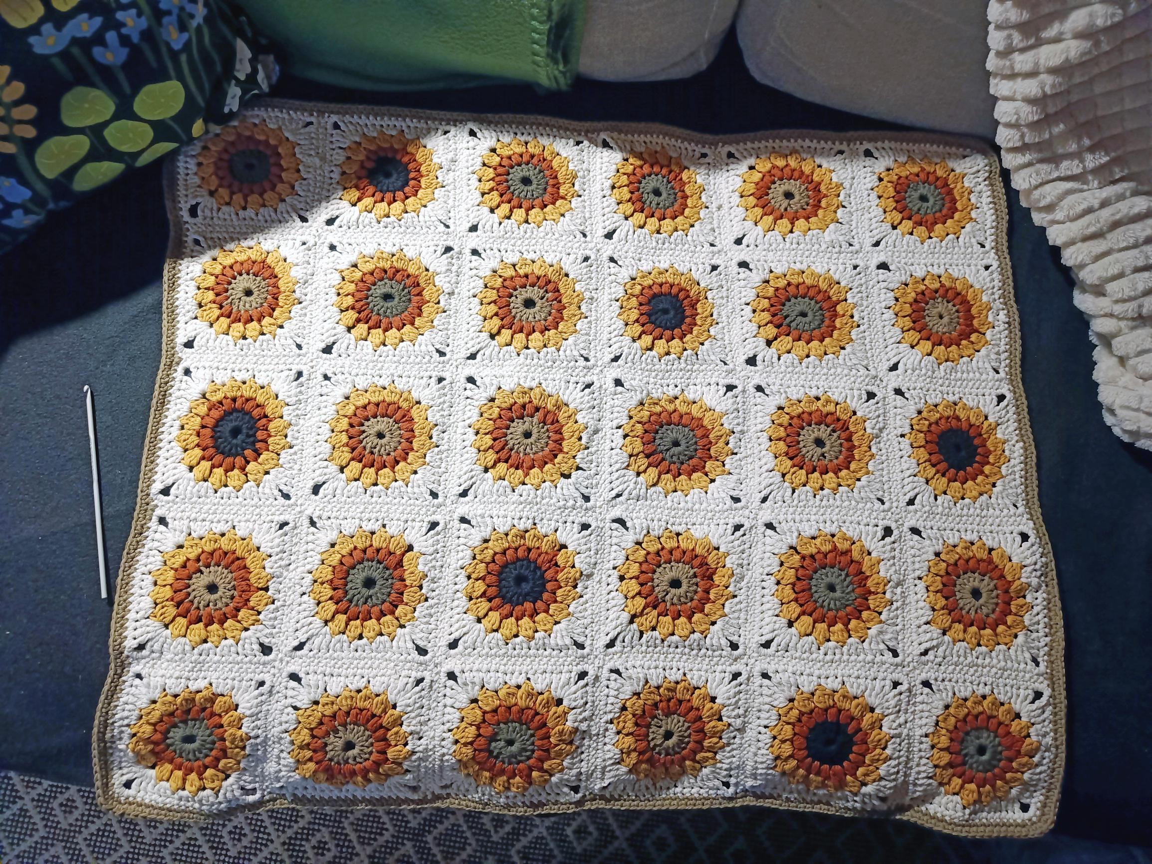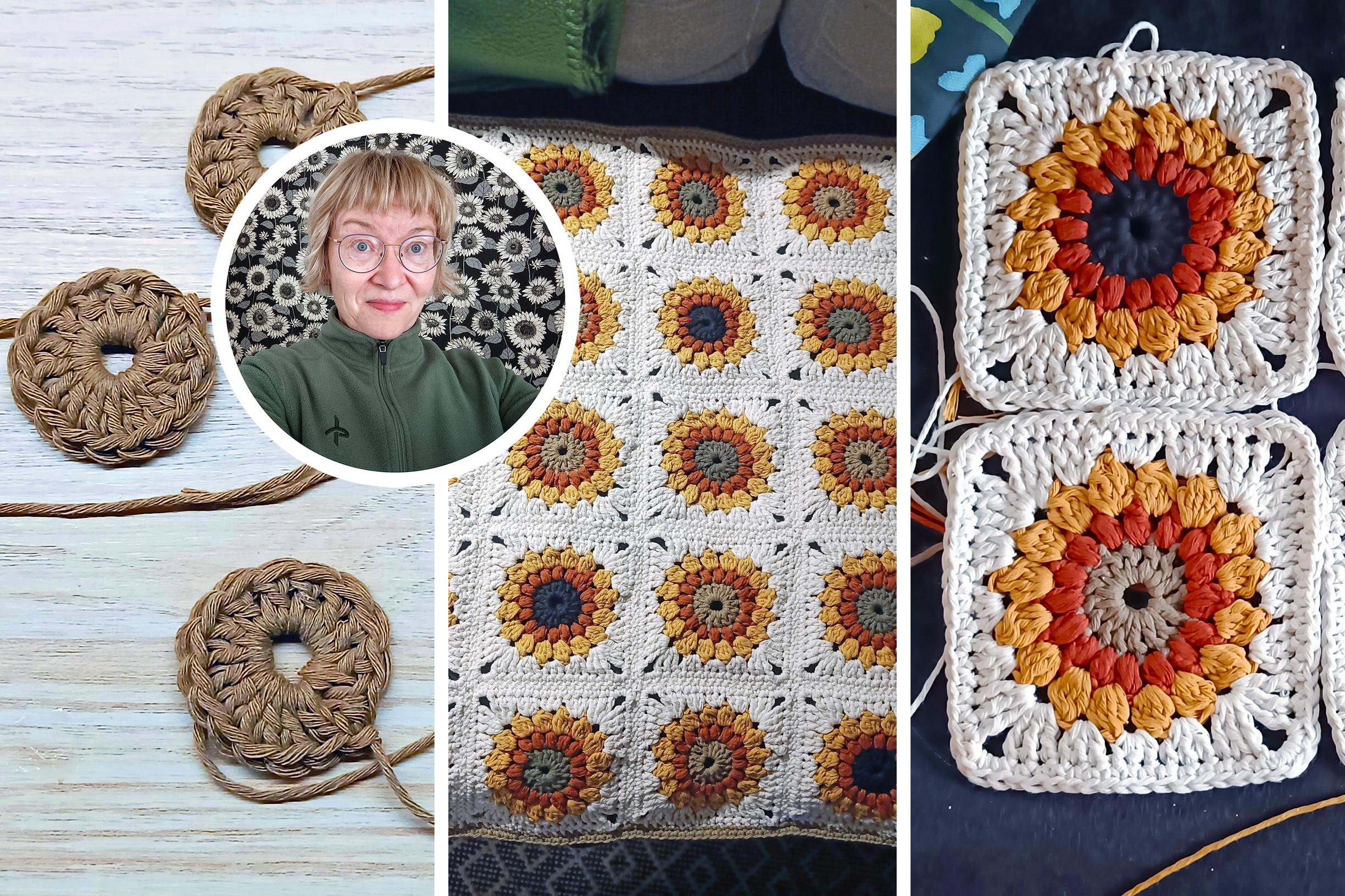 Sari innostui auringonkukkaneliöistä ja pian valmistui peitto työkaverin vauvalle! ”Kolahti heti”