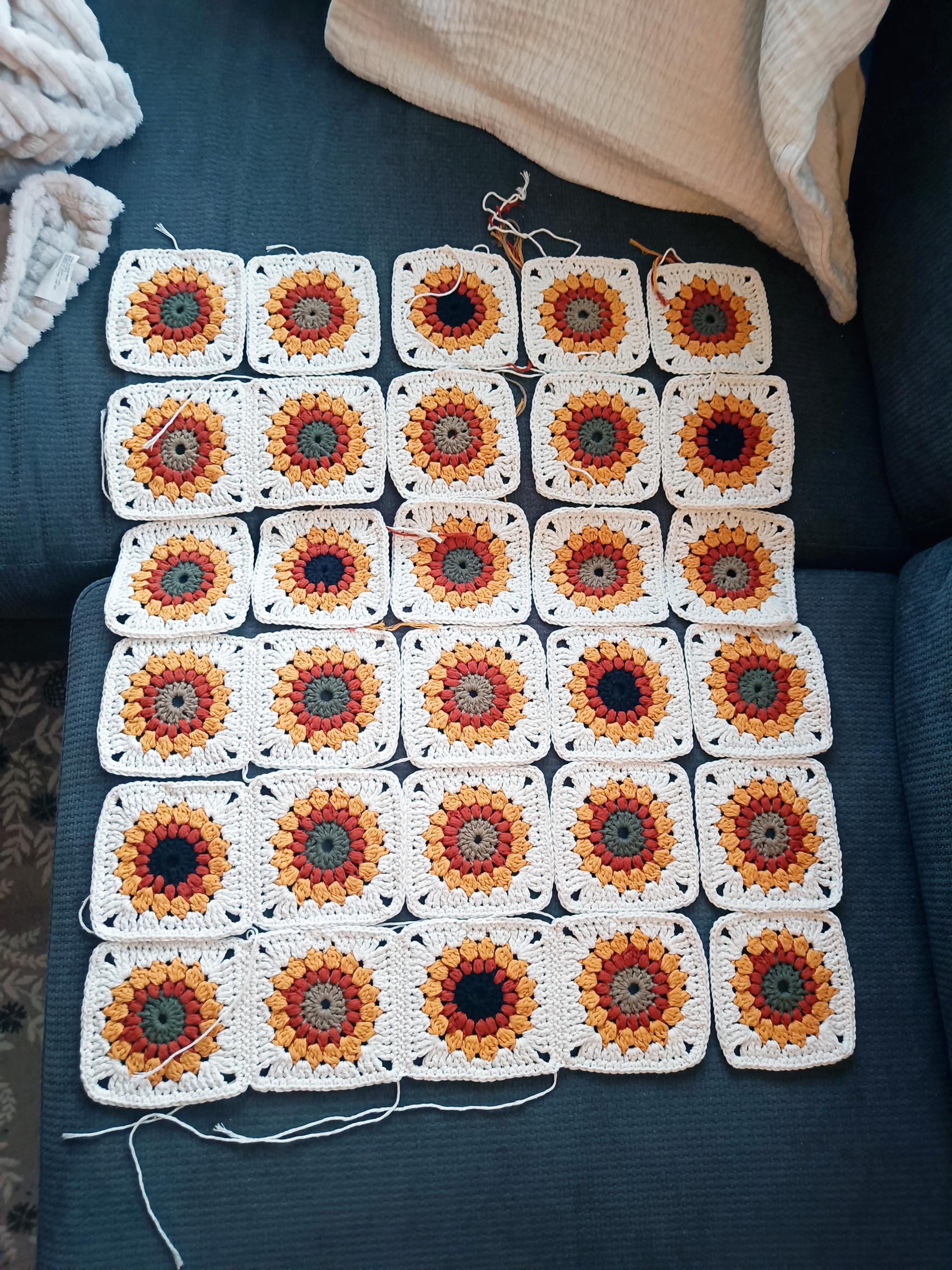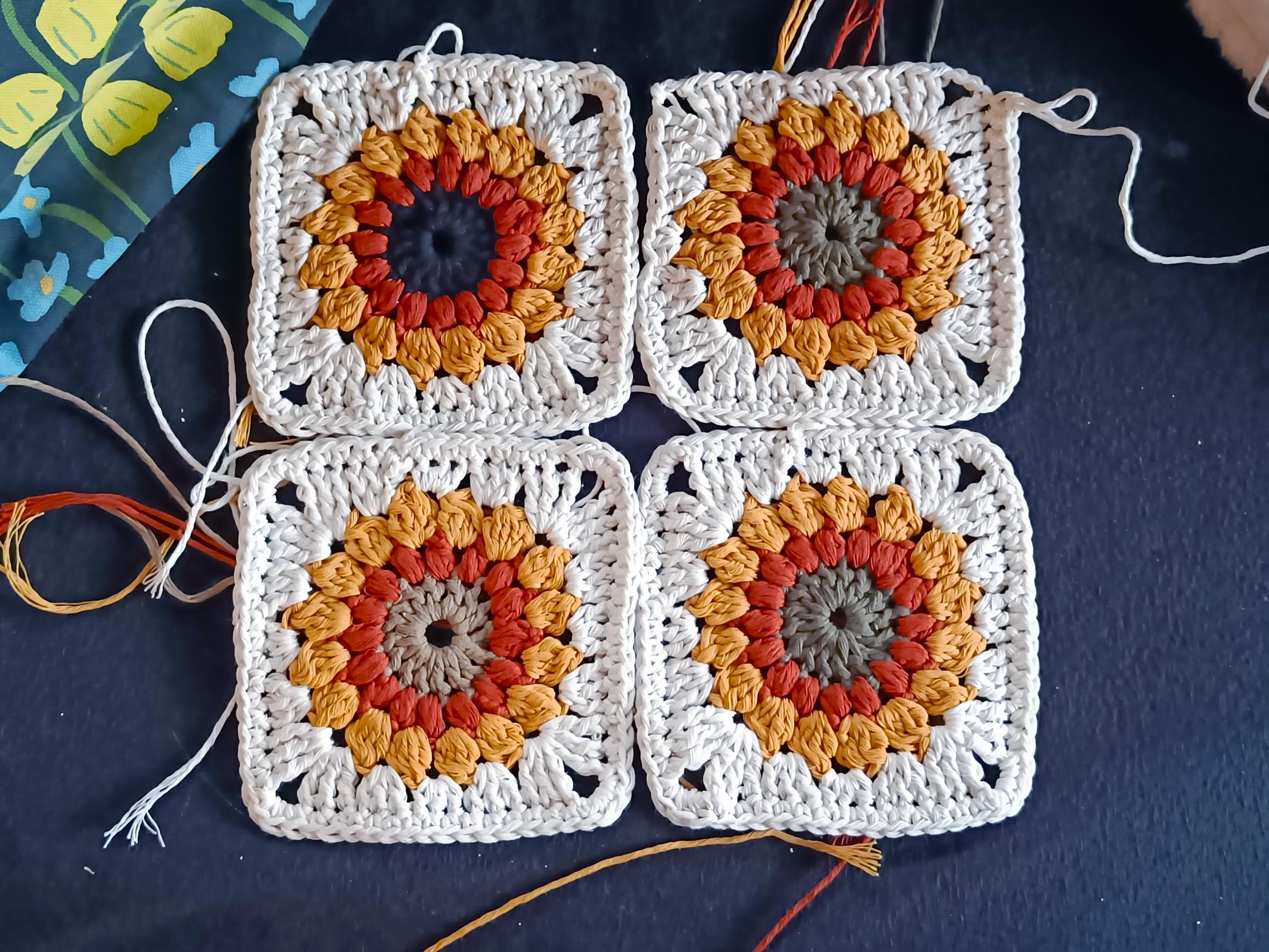 Nyt olen tehnyt muutaman auringonkukkaneliön toisesta langasta. Tarkoitus on tehdä isompi torkku- tai päiväpeitto. Eli jonkinlainen ikuisuusprojekti meneillään!