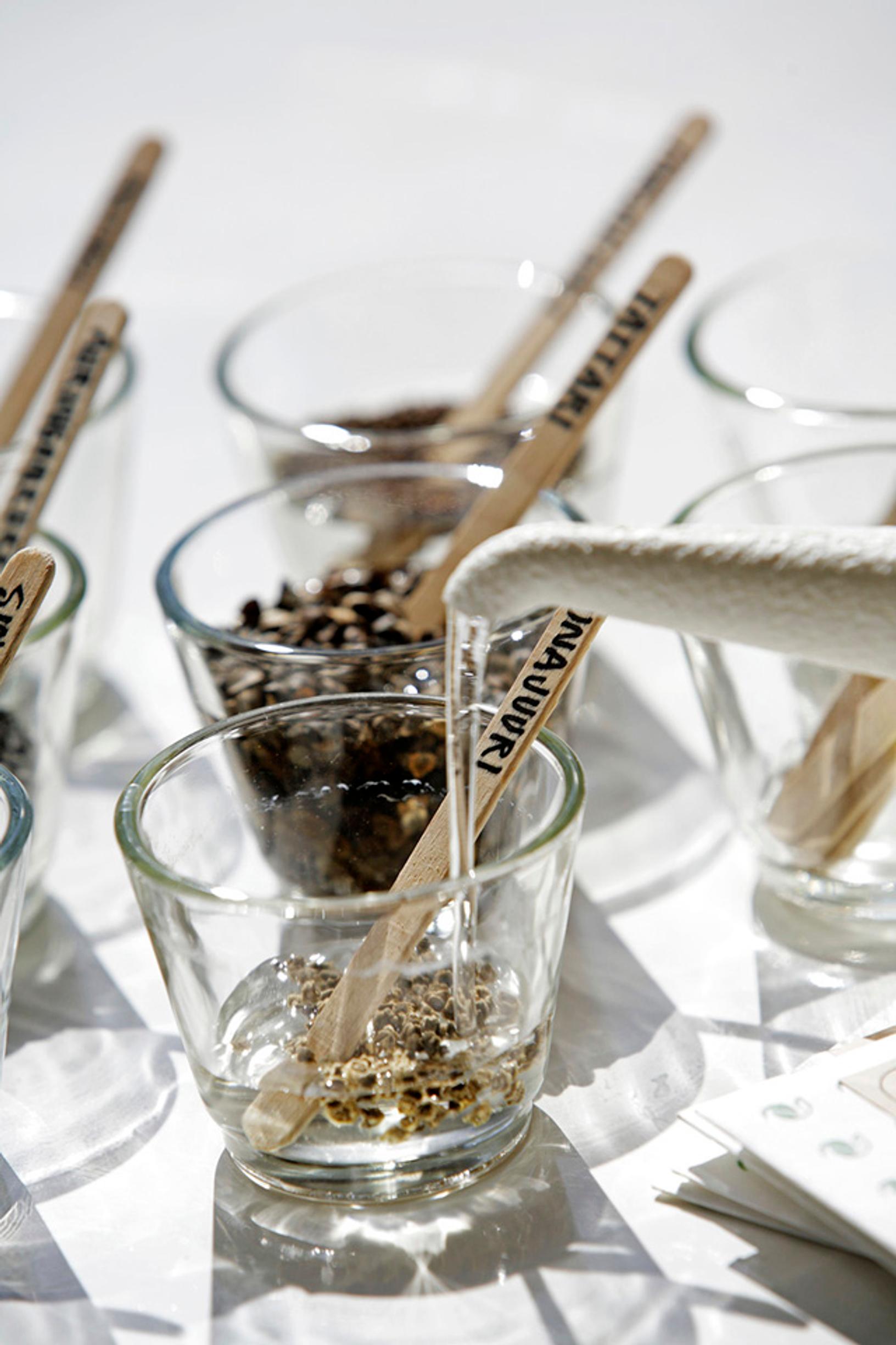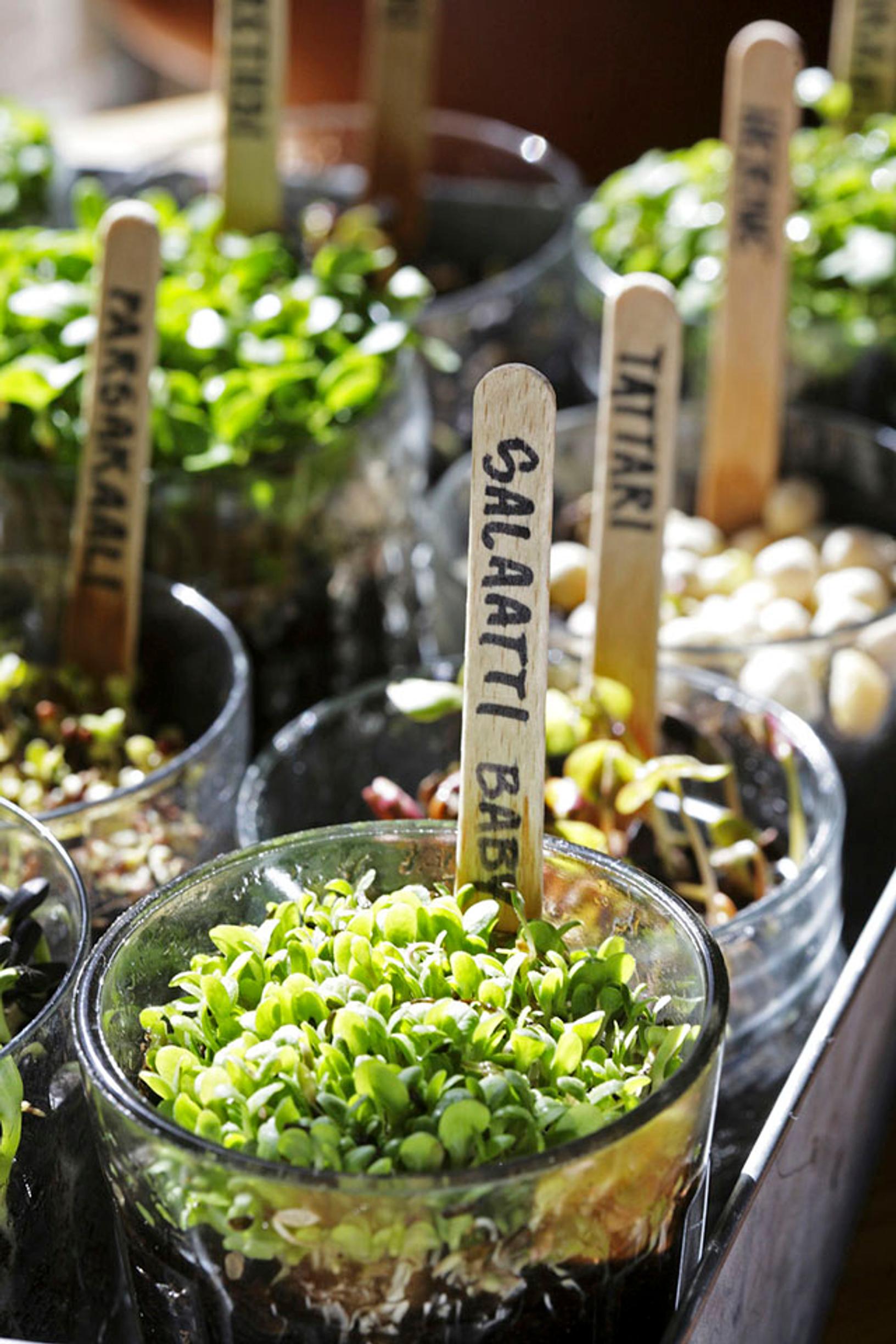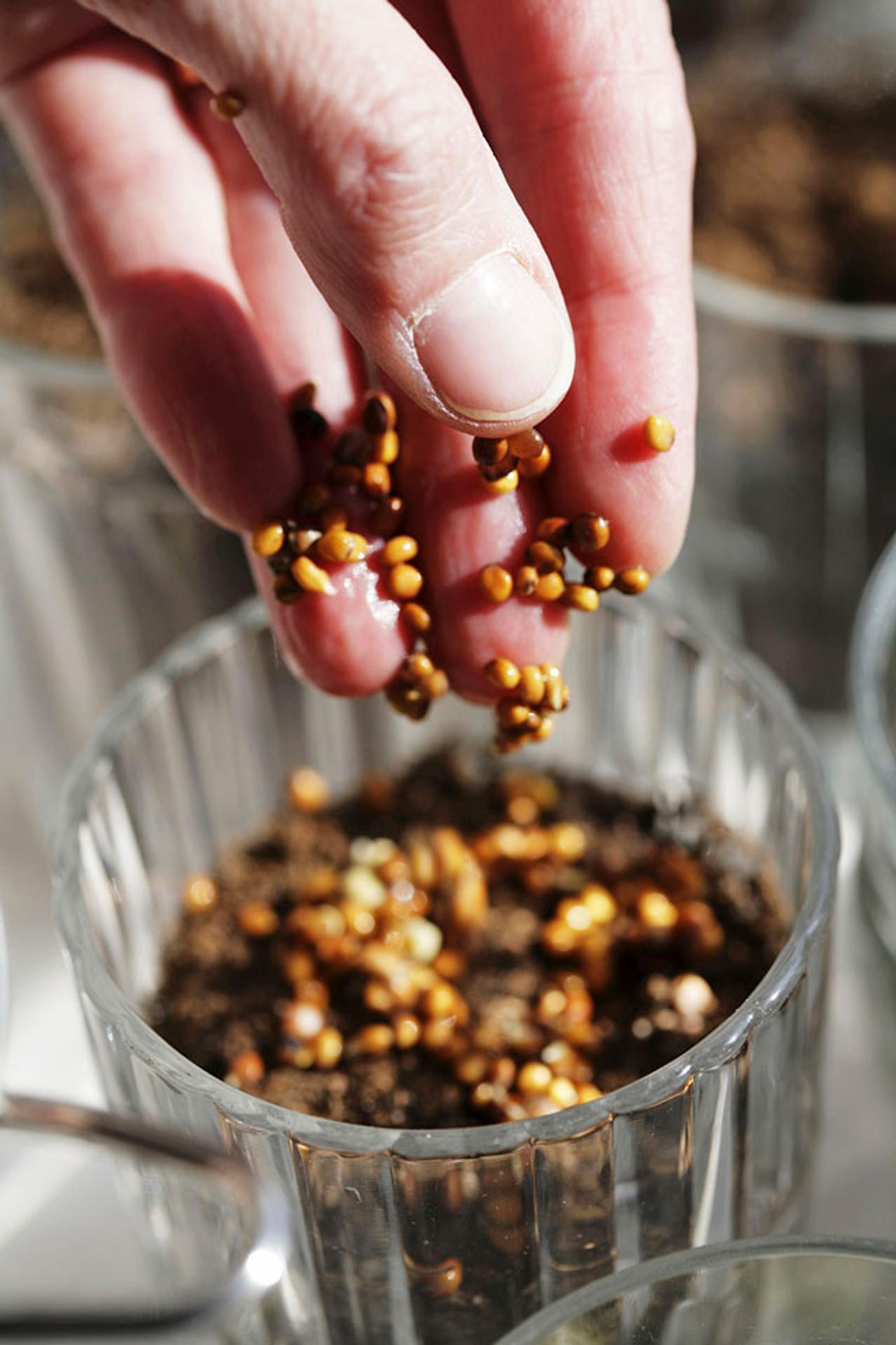 - Täytä lasit puolilleen kostealla mullalla. Huuhtele liotetut siemenet ja ripottele niitä tiheästi kostealle mullalle. Laita laseihin nimikyltit, sillä siemenet muistuttavat erehdyttävästi toisiaan. Jopa versoinakin niiden tunnistaminen voi olla vaikeaa. Peitä kylvös löyhästi tummalla jätesäkillä ja nosta lasit muutamaksi päiväksi lämpimään paikkaan.