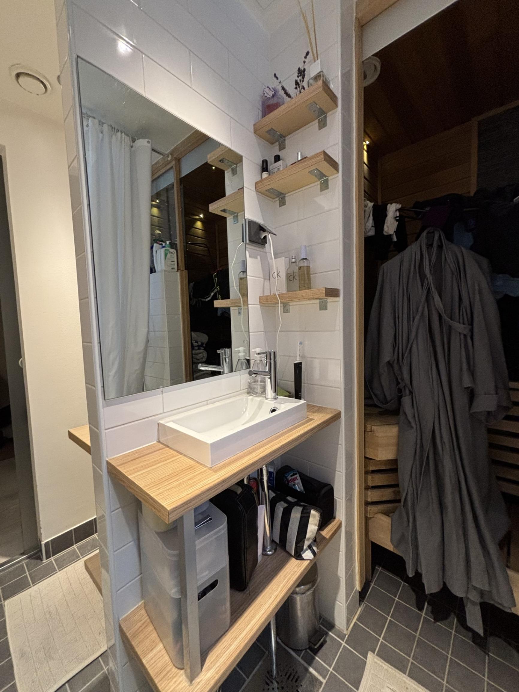 Sauna purettiin ja suihku siirrettiin siitä vapautuneeseen tilaan. Amme poistettiin ja sen paikalle rakennettiin kaapisto pyykille ja pesukoneelle. Vain koteloitu wc jäi alkuperäiselle paikalle. Koteloinnin päälle jäävään syvennykseen sijoitettiin säilytyskaappi ja sen viereen peili, jonka mitat ovat samat kuin kaapin. Myös allaskaapin asentaminen toi lisää säilytystilaa. Kaikki tammiviiluiset kalusteet teki puuseppä.