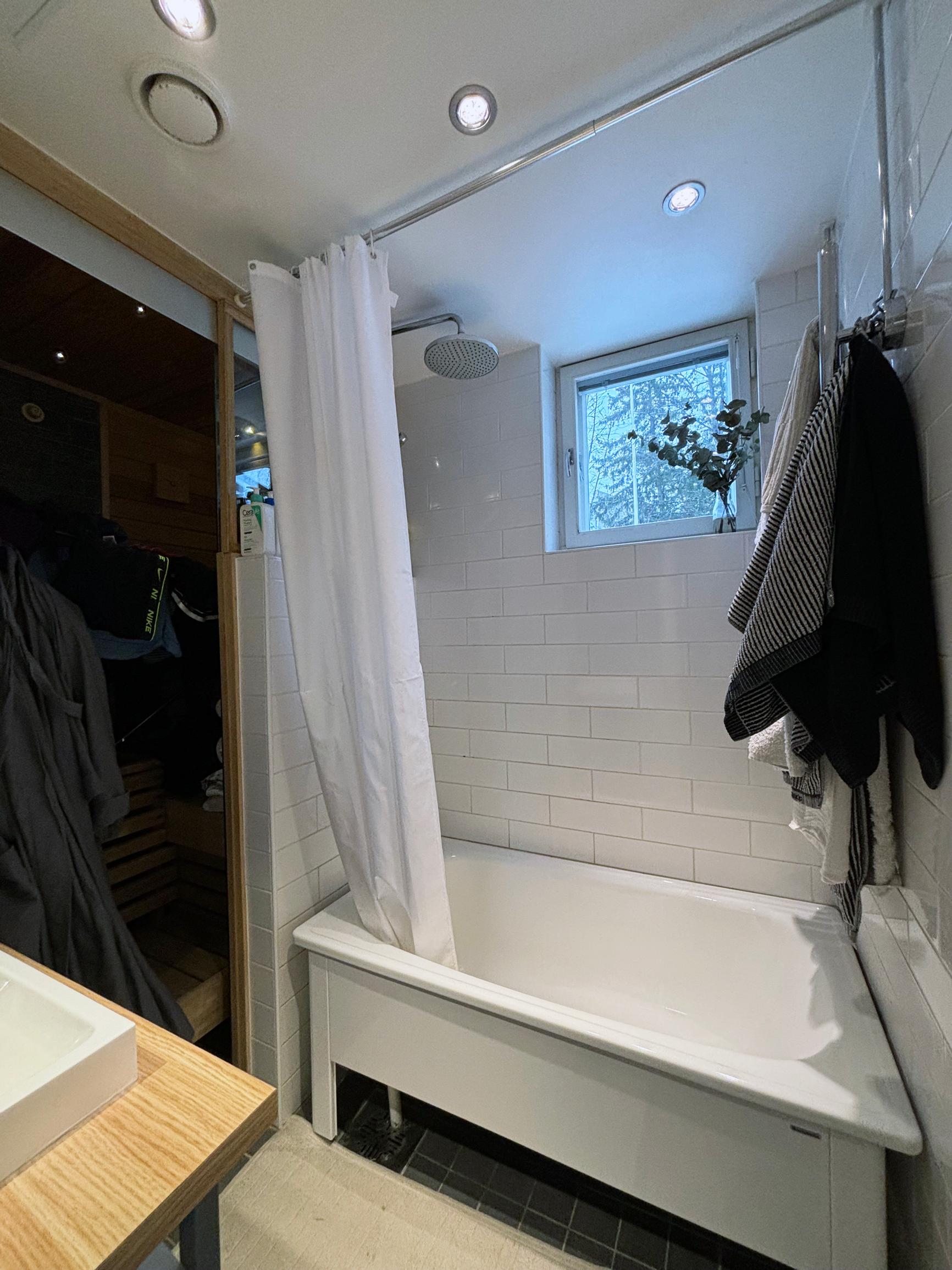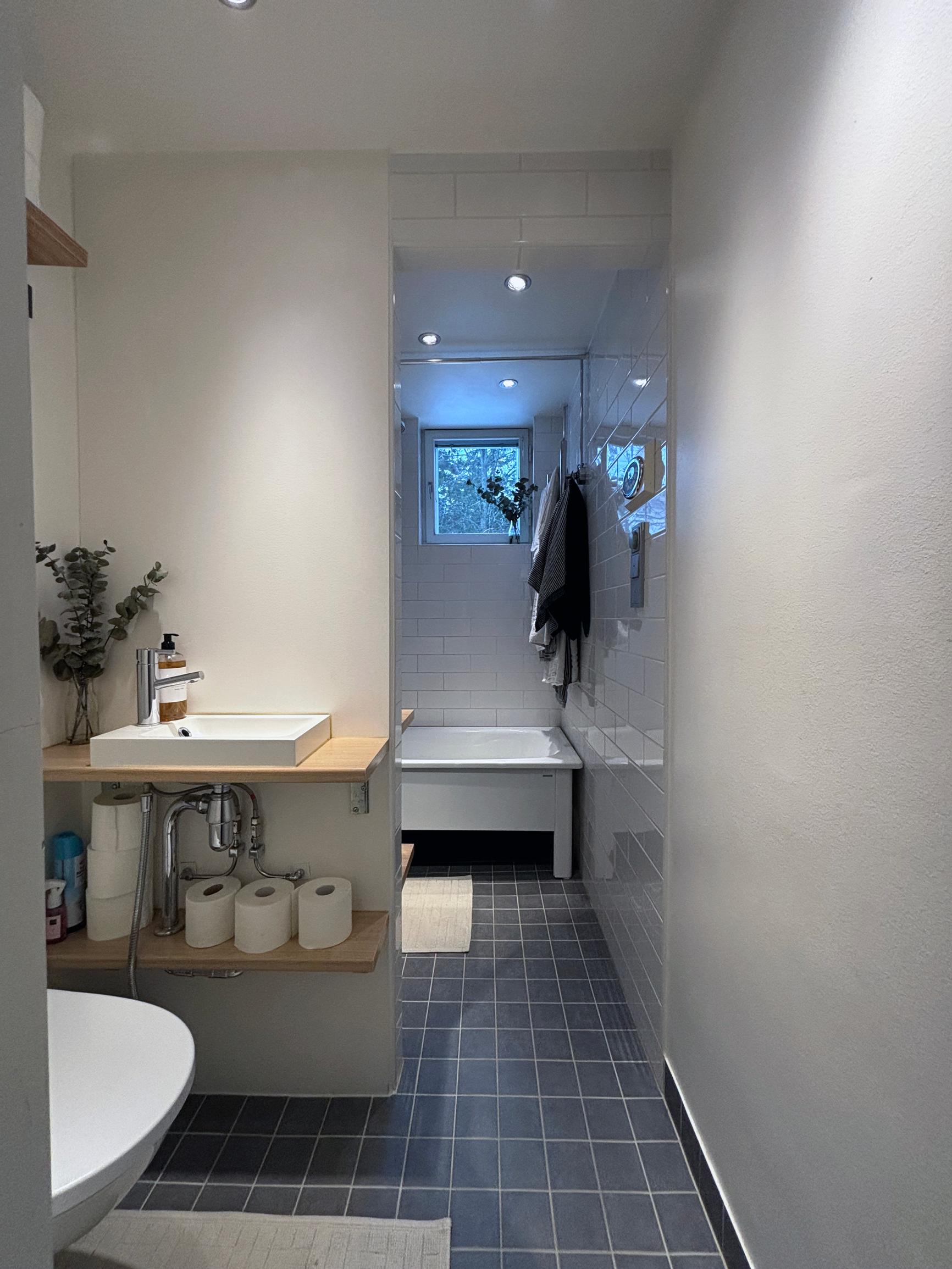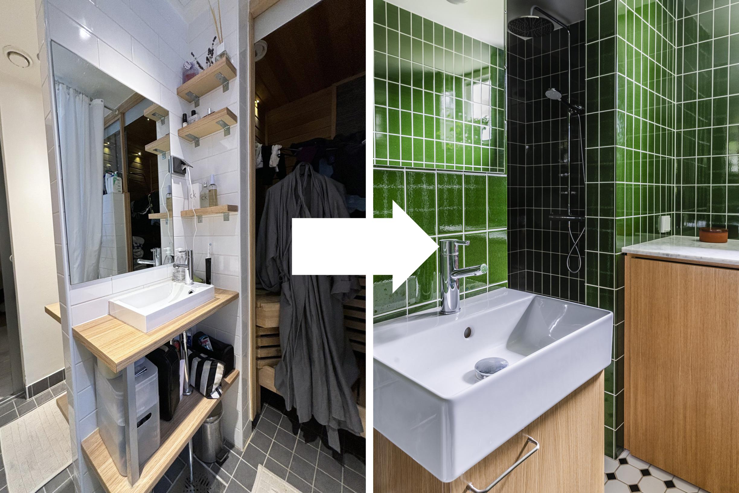 Reilut kymmenen vuotta sitten remontoidun viiden neliön kylpyhuoneen pinnat olivat siistit, mutta tilanjako epäkäytännöllinen. Säilytys- ja laskutilaa oli hyvin vähän, ja pienille avohyllyille sijoitetut tarvikkeet saivat huoneen näyttämään aina vähän sotkuiselta. Suihkuun piti kiivetä ammeen kautta, ja neliöitä söi yhden hengen sauna, jota kukaan viisihenkisen perheen jäsenistä ei halunnut käyttää. Tilaan oli sijoitettu kaksi pesuallasta, vaikka yksikin olisi riittänyt mainiosti.