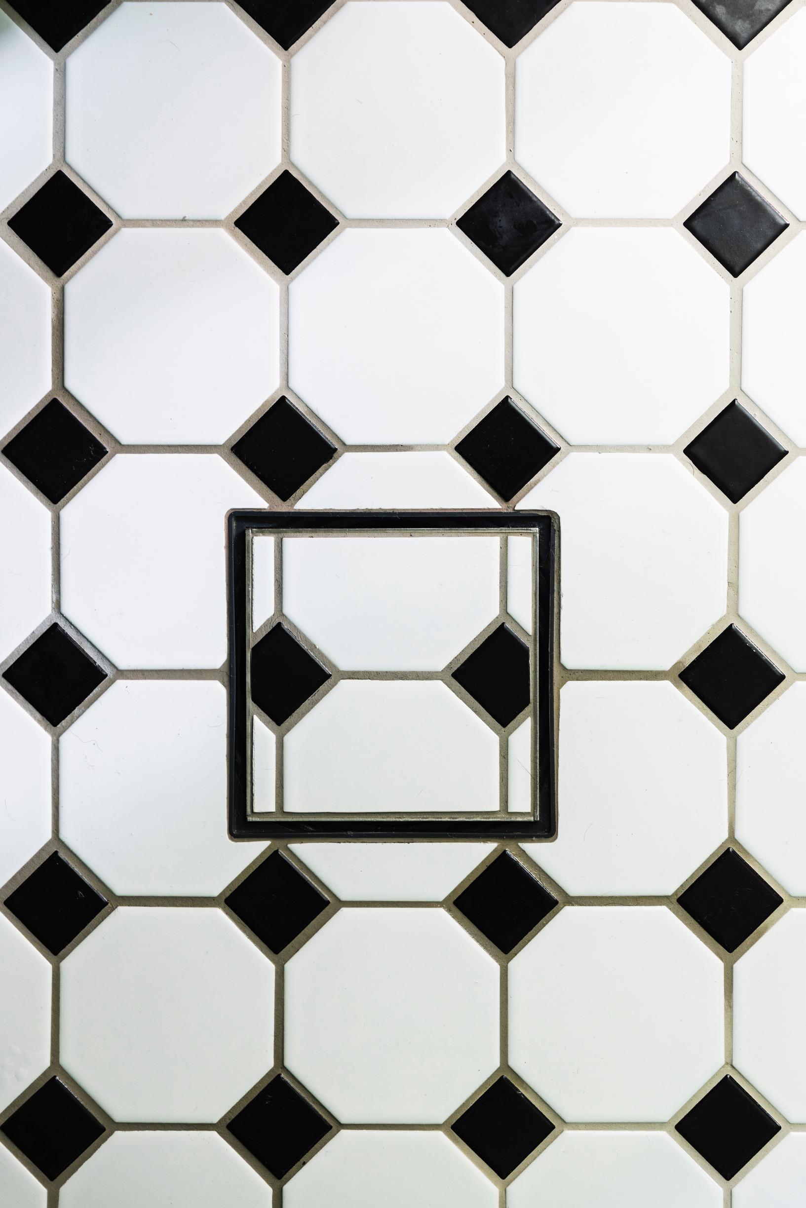 Uusi laatoitus tehtiin todella tarkasti, koska sen onnistuminen oli kriittistä koko tunnelman luomisessa. Vanhojen talojen seinät ovat harvoin suorassa, ja pienet heitot korostuvat helposti, kun käytetään pienikokoisia laattoja. Taitava laatoittaja onneksi teki hyvät pohjatyöt, minkä ansiosta seinien lievää vinoutta saatiin hieman häivytettyä.