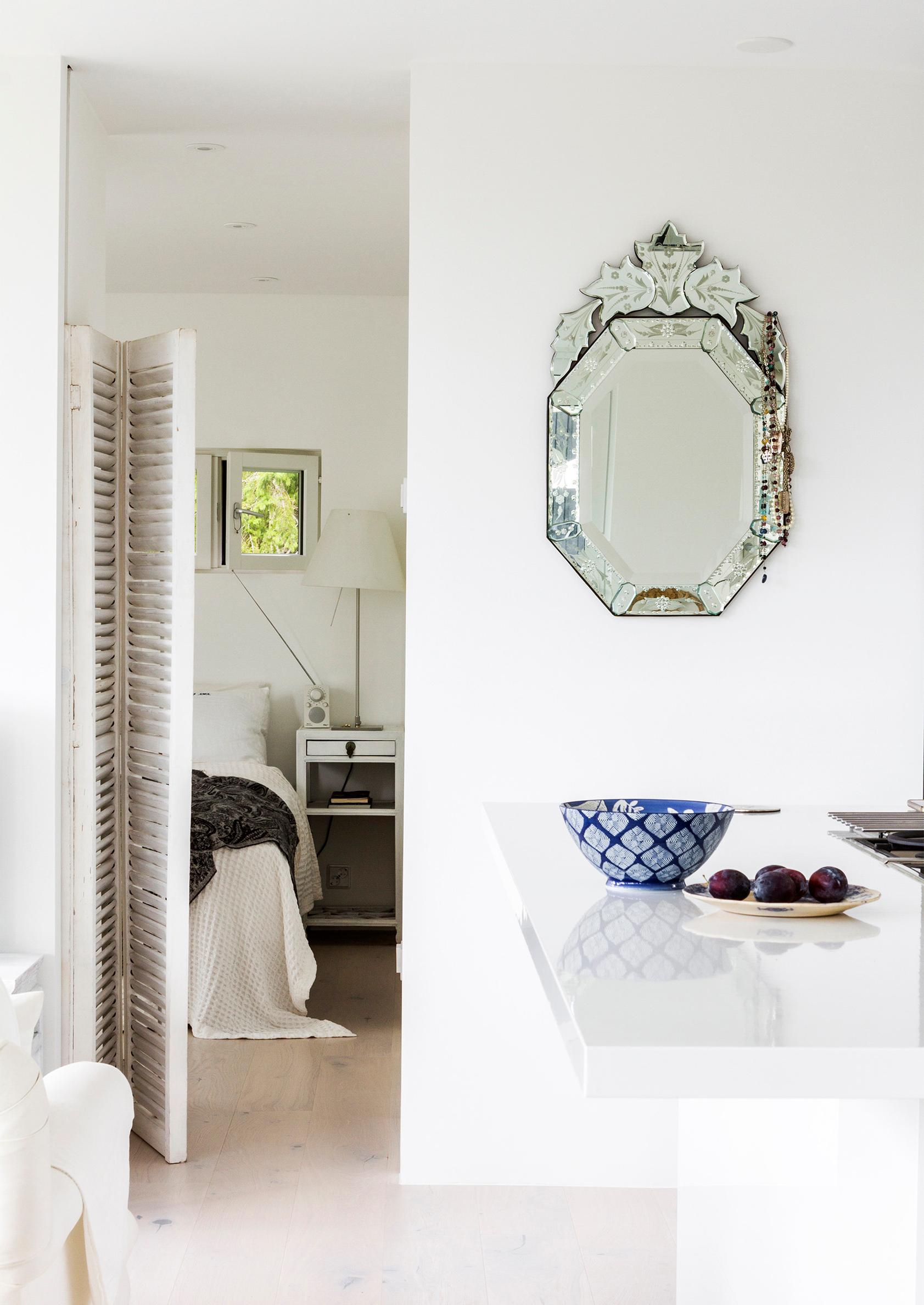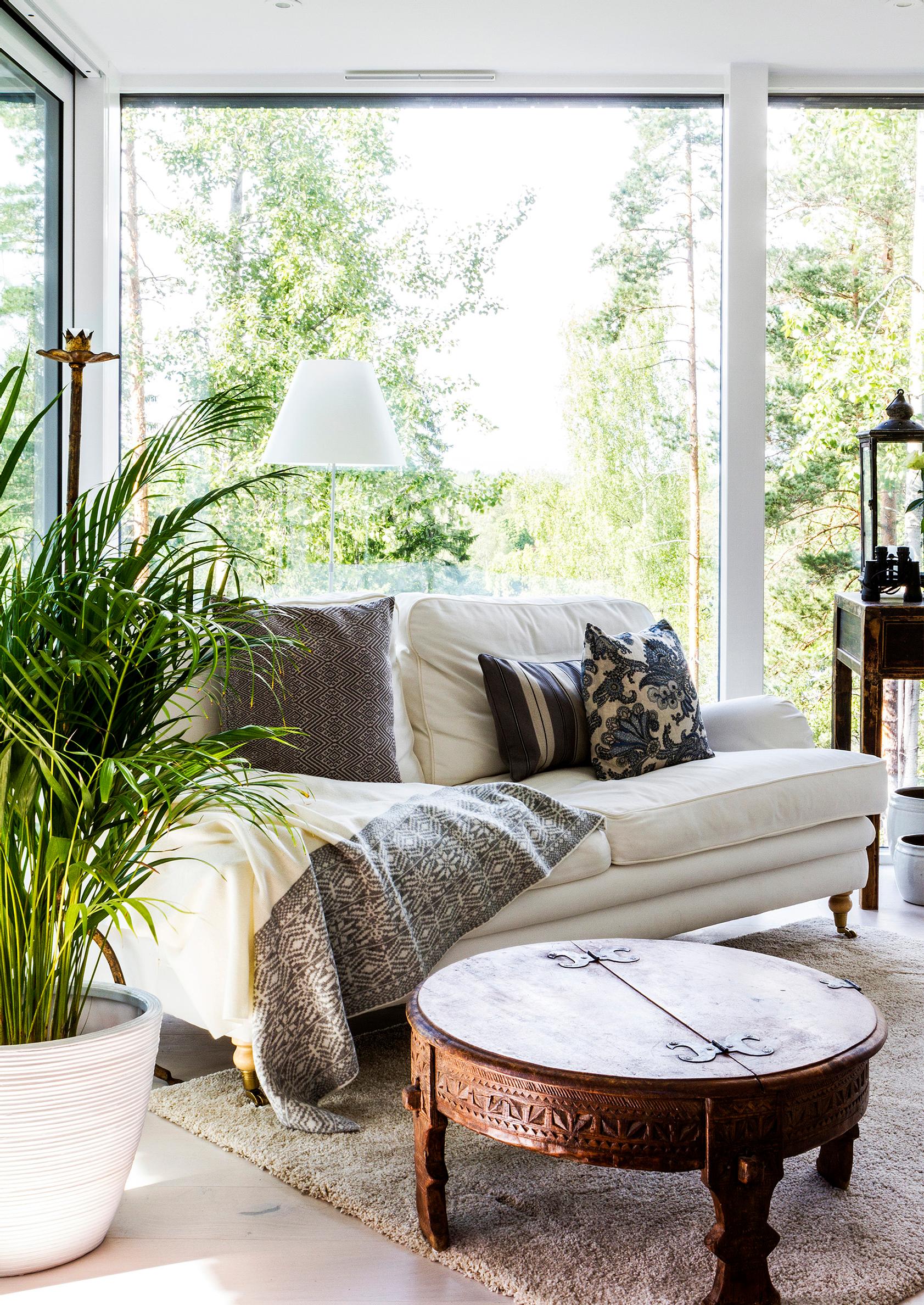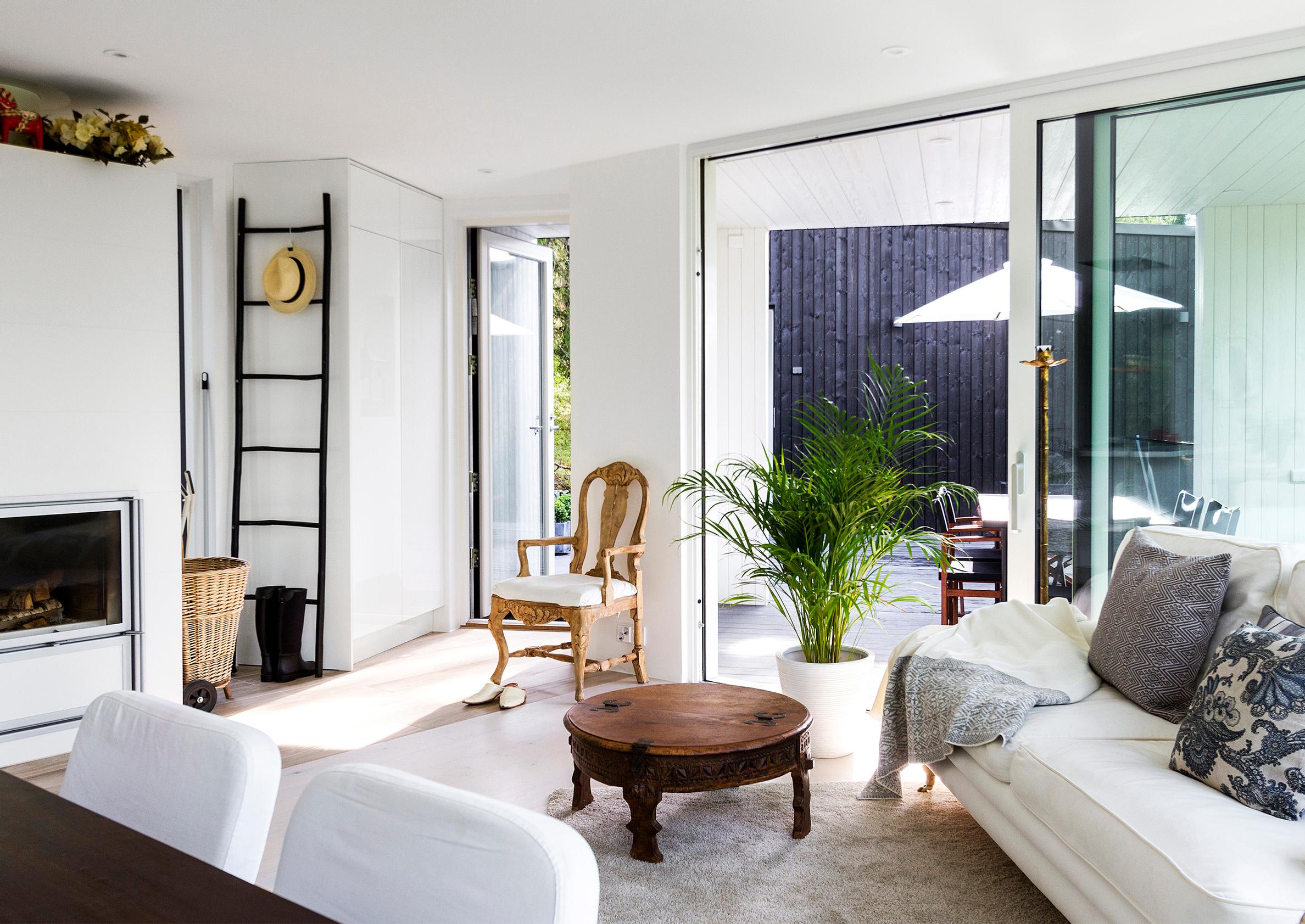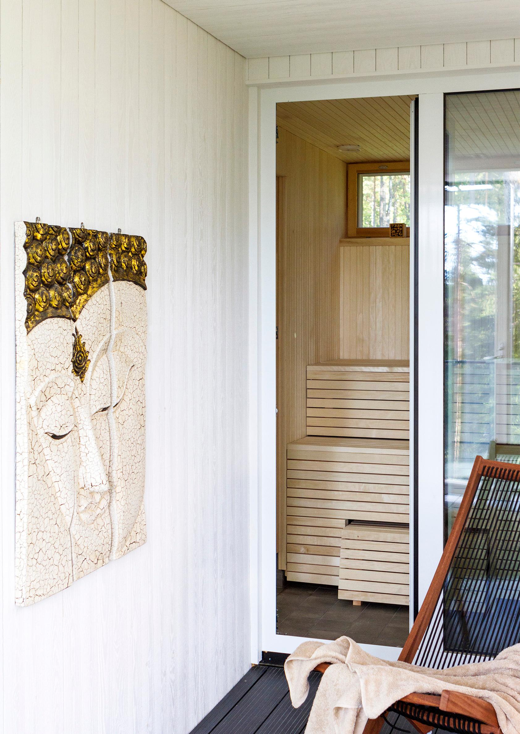 – Sanoin suunnitteluvaiheen aluksi talon arkkitehdille Heikki Viirille, että hänen pitää löytää paikka valkoiselle sohvalle ja nojatuolille, kullatulle Buddha-patsaalle ja venetsialaispeilille. Heikki kehotti miettimään huonekalujen paikkoja vasta sitten, kun talo on valmis, mutta minä pysyin tiukkana, Ulla-Maija toteaa.