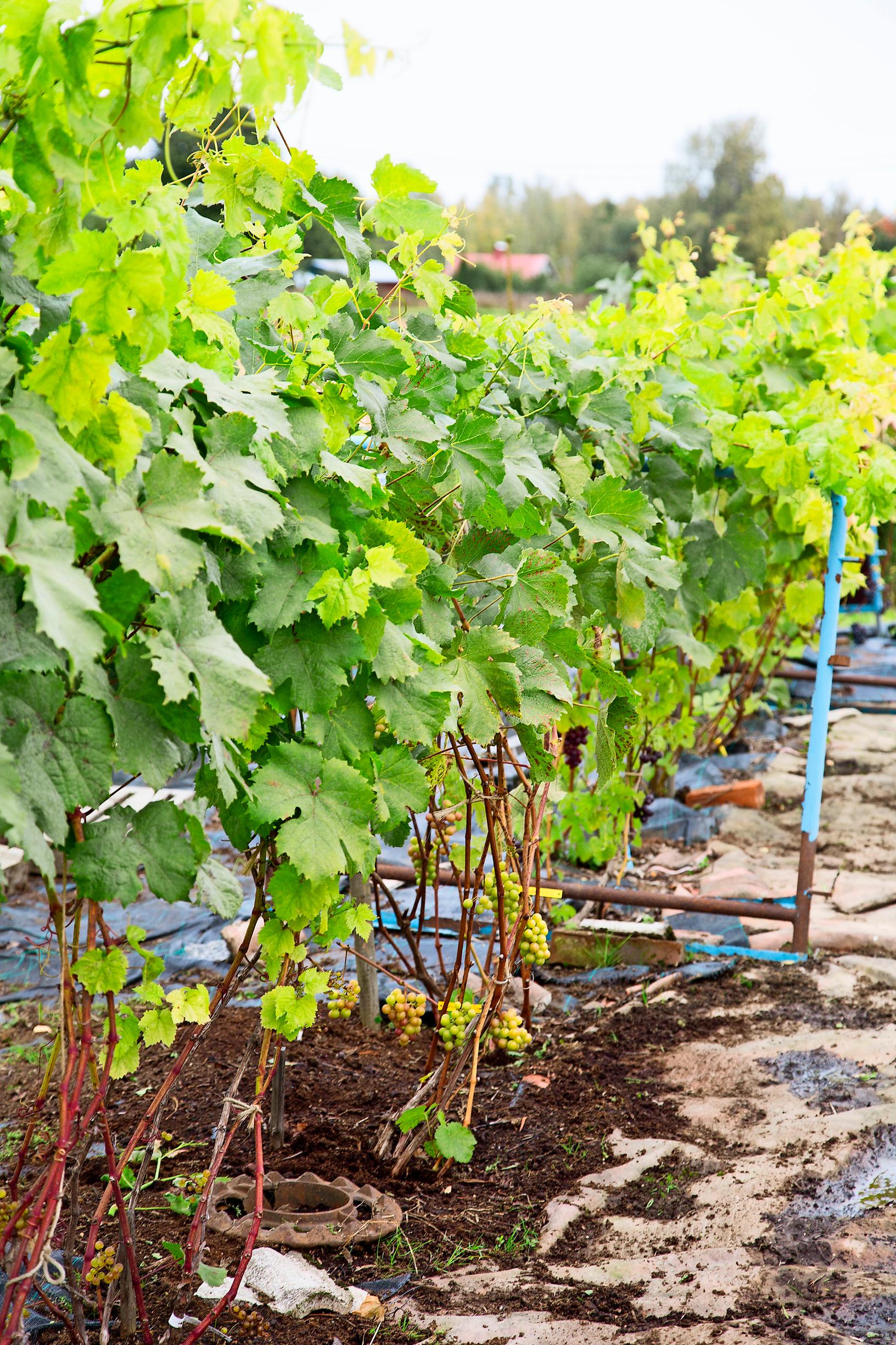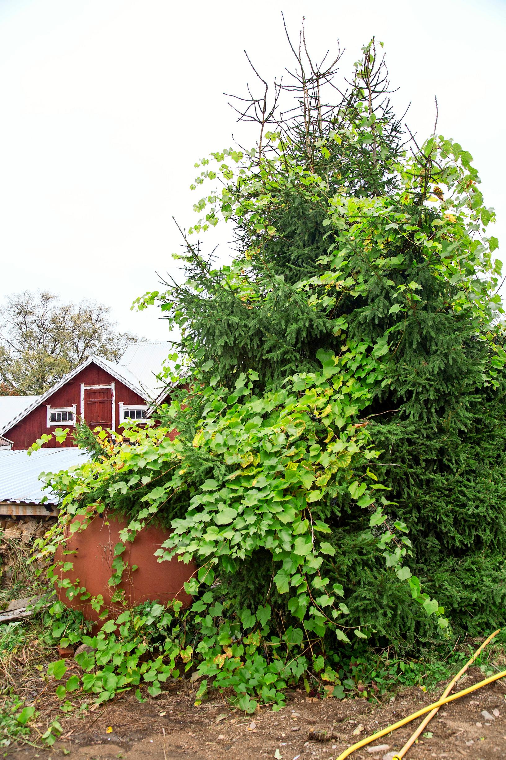Viinirypäleiden viemää! Helenan puutarhassa viiniköynnökset luikertelevat kuusen oksien lomassa