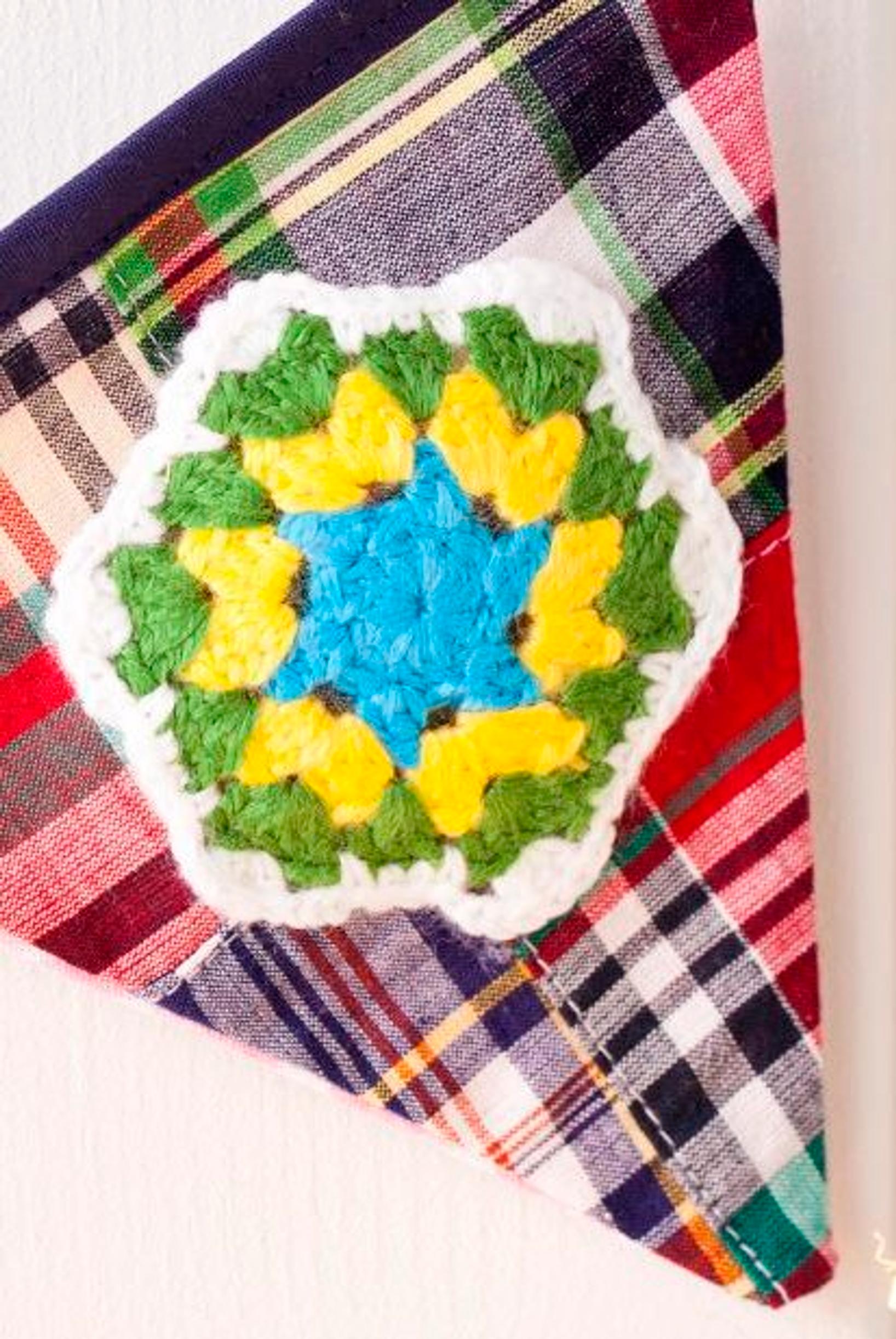 - kerros: vaihda väriä ja virkkaa jokaiseen ketjusilmukkalenkkiin *3 pylvästä, ketjusilmukka ja 3 pylvästä*. toista *_* kerros loppuun.
