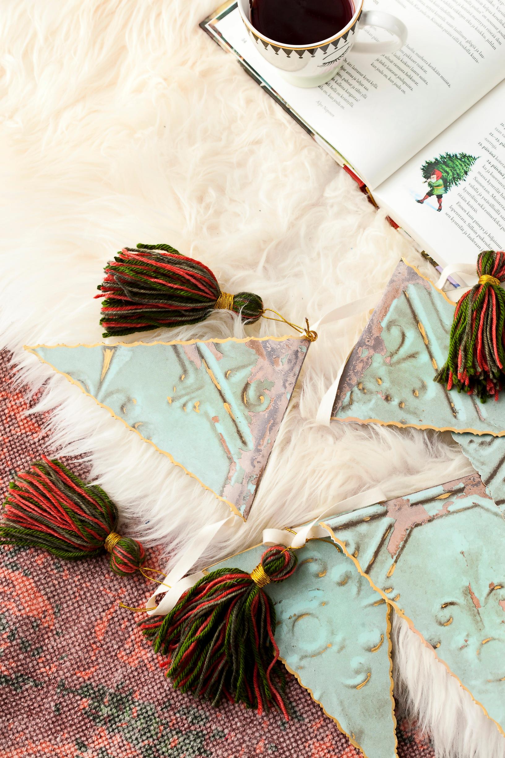 - Taita paperi kahtia ja leikkaa siitä kaksinkertaisia viirikolmioita, niin että taitekohta tulee valmiissa työssä nauhan kohdalle. Kuviosaksilla saat viireihin kauniin reunan.