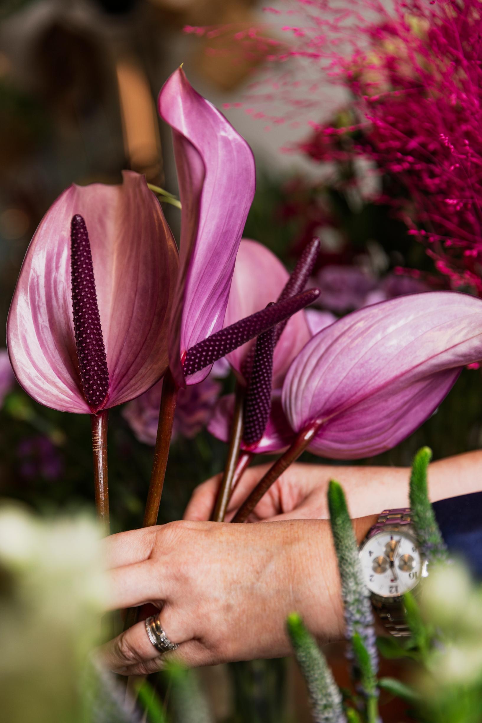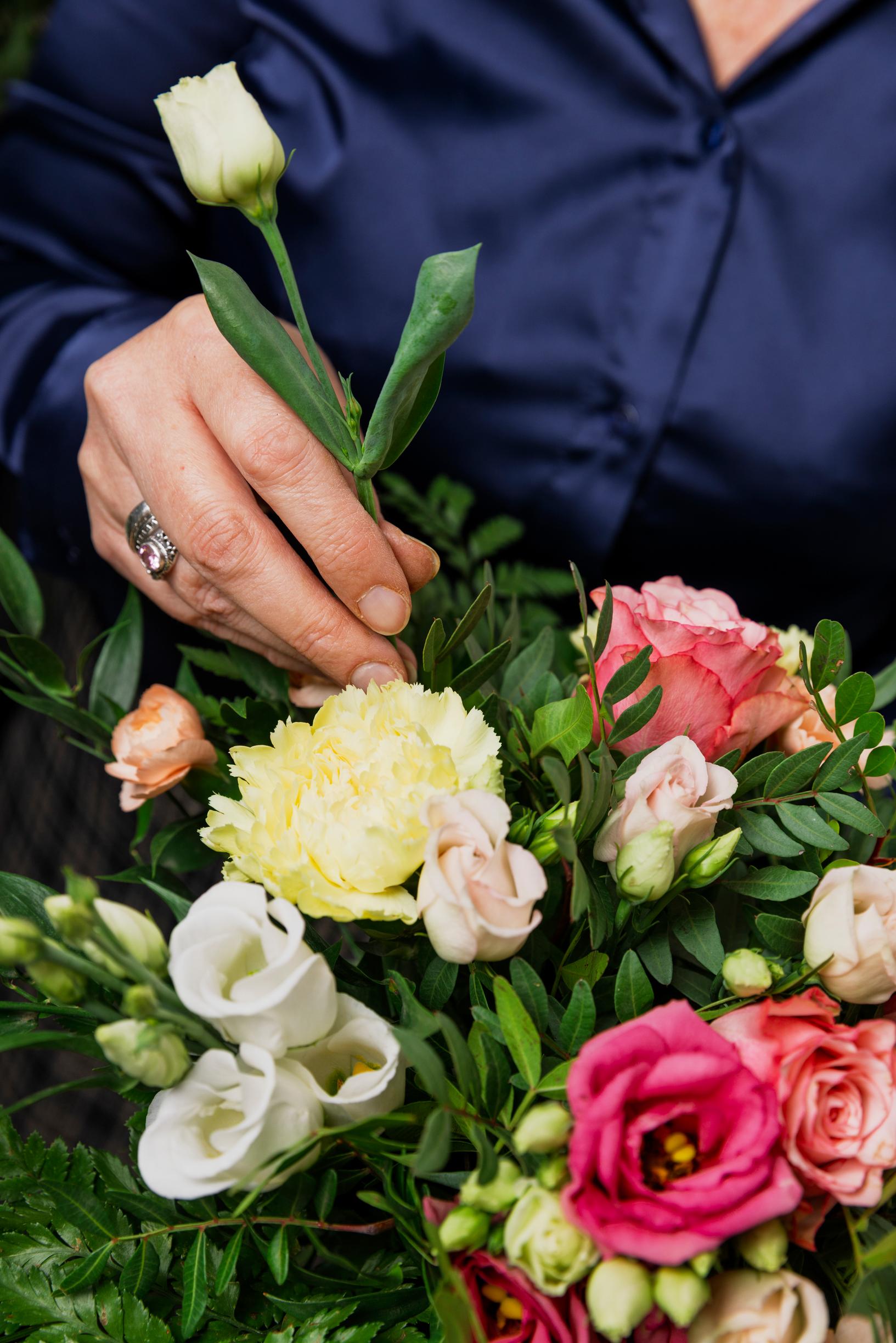 Haastattelun aikana kukkakauppias siistii tukusta hakemiaan leikkokukkia myyntikuntoon. Marin suosikkikukan jaloleinikin kausi on alkamassa. Niitä Marilla oli hääkimpussaan vanhan roosan ja persikan sävyissä, ruusujen rinnalla.