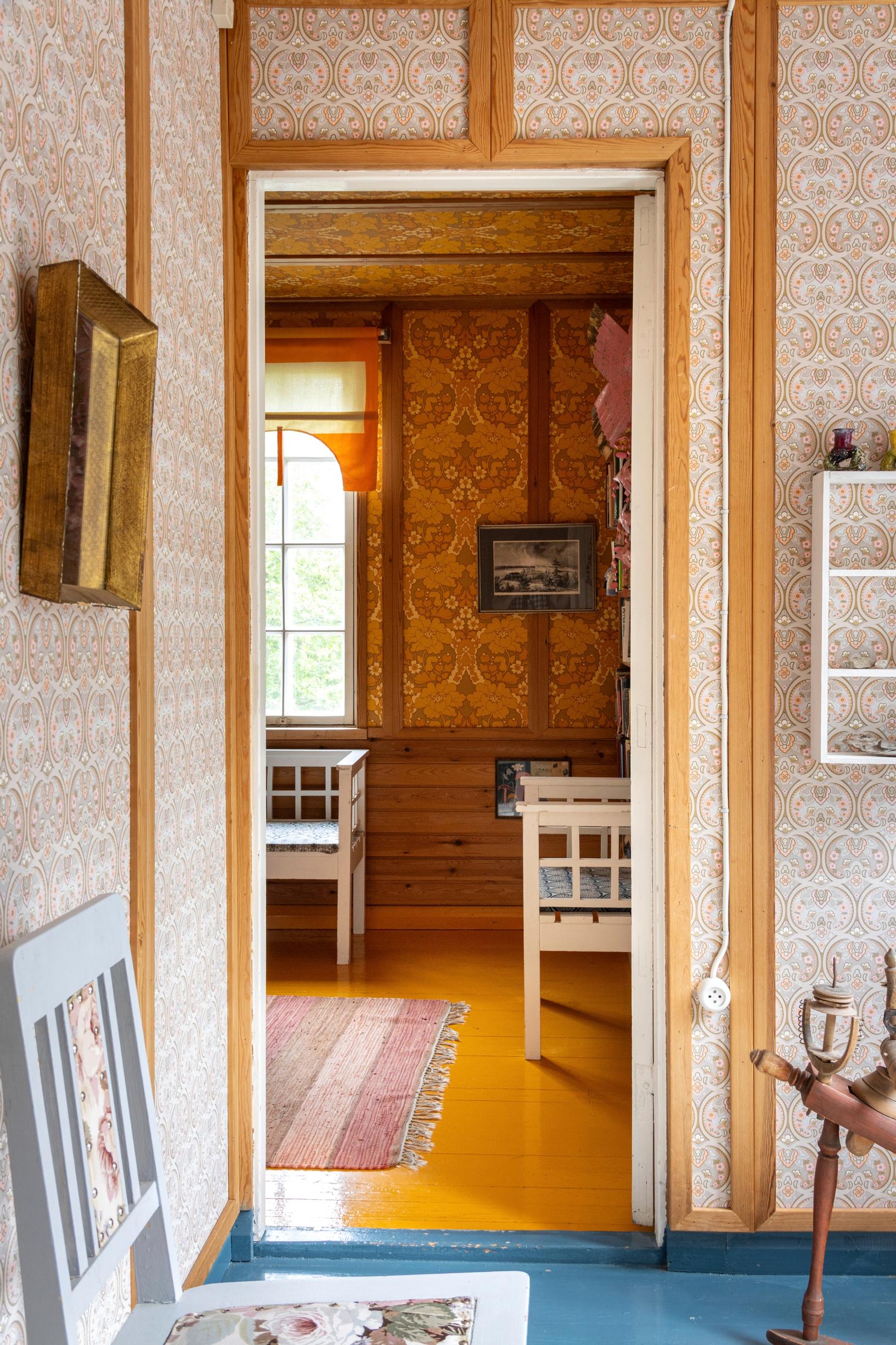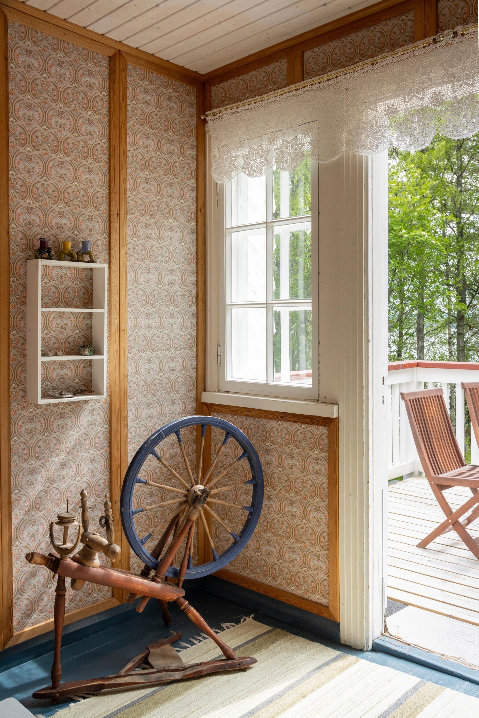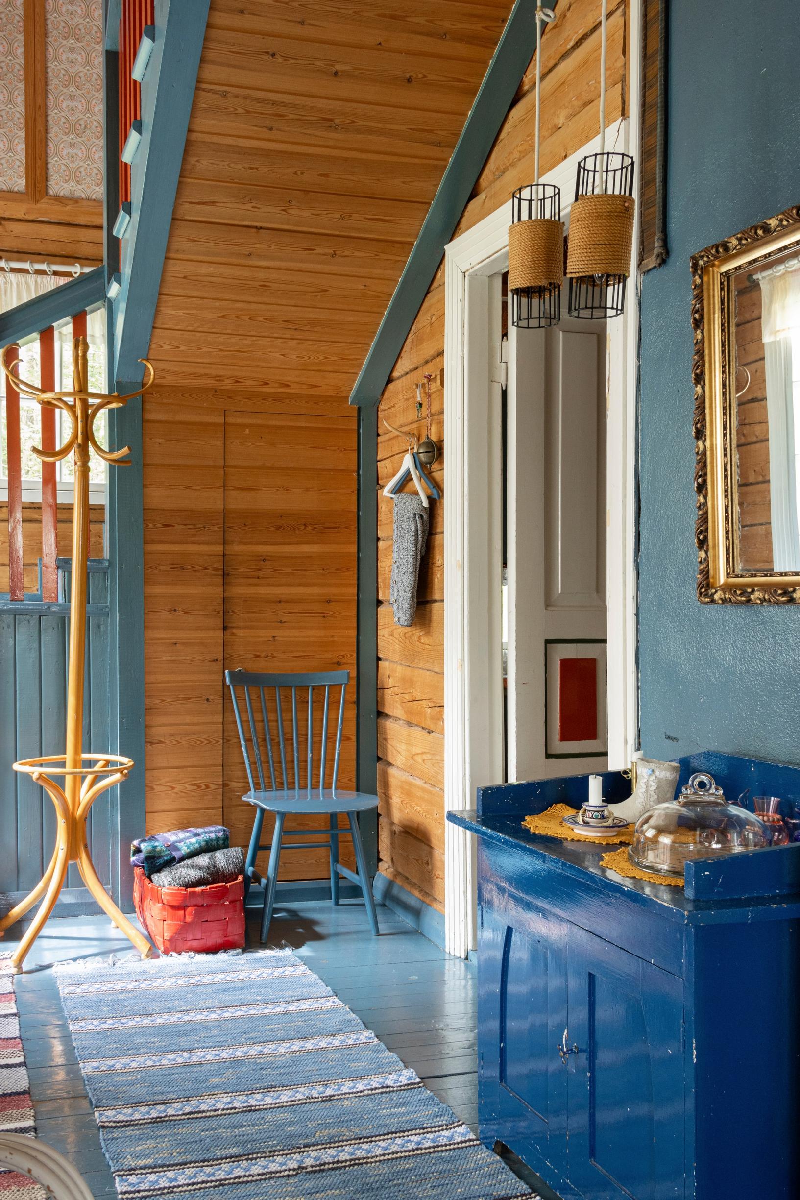 – Kun mietimme, millä värillä maalaisimme kuistin lattian, meille ehdotettiin valkoista. Se olisi tietenkin turvallinen valinta, mutta meidän mielestämme tänne kuuluvat tunnelmaa tuovat värit, Päivi sanoo.