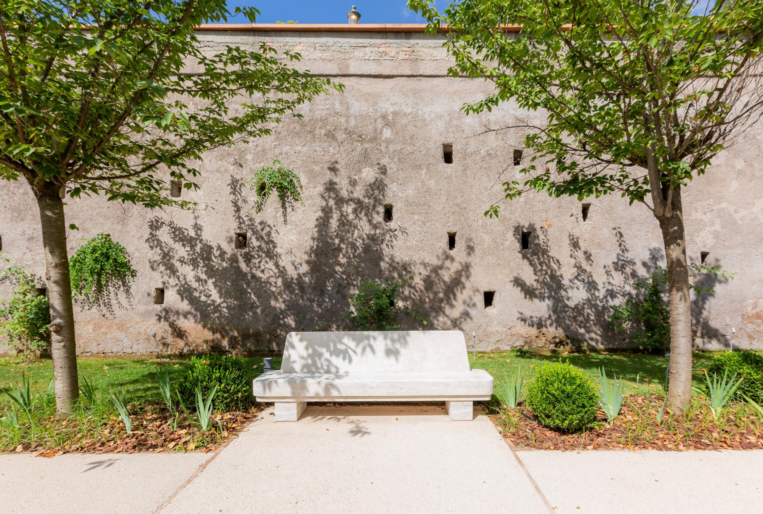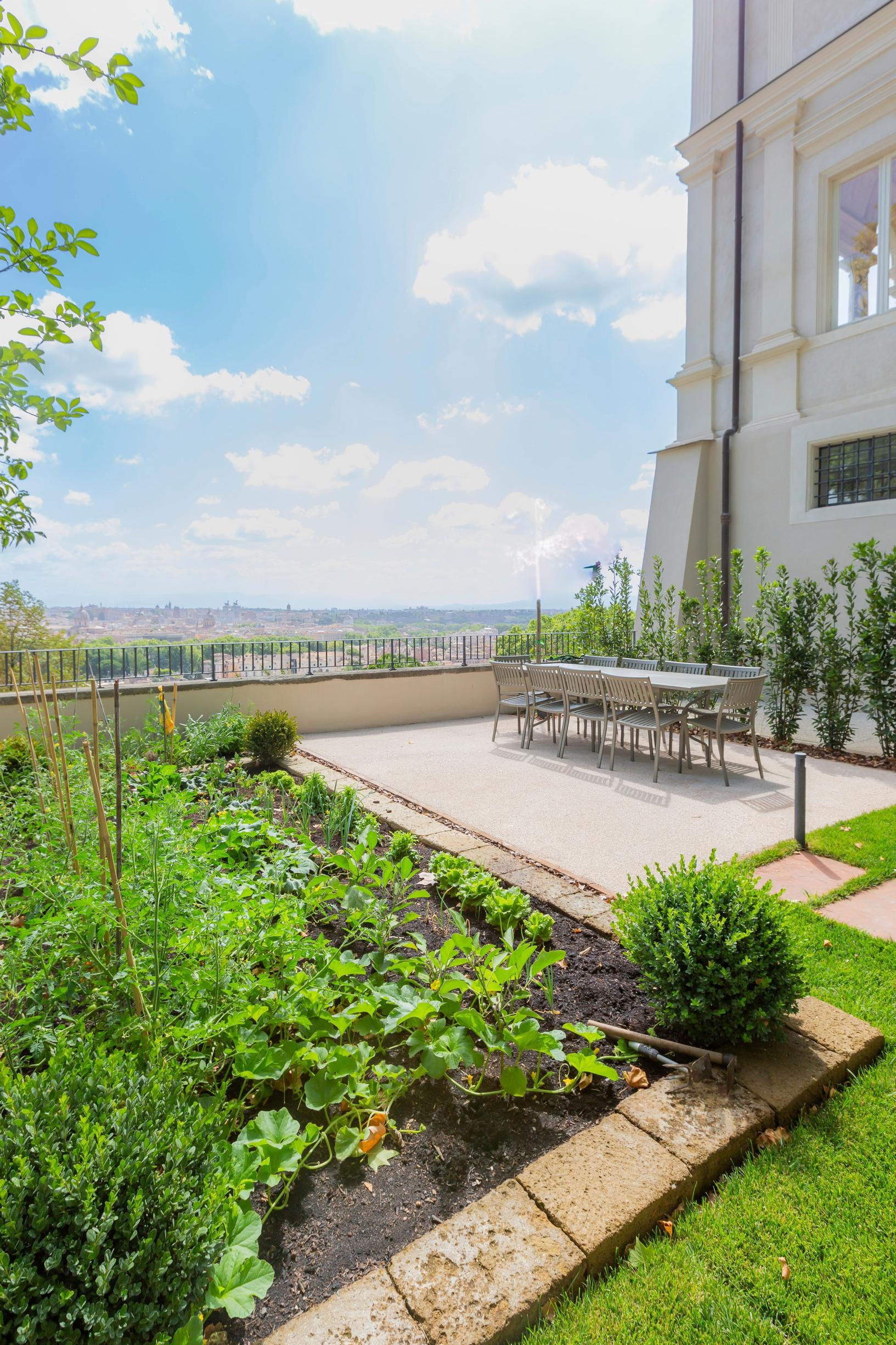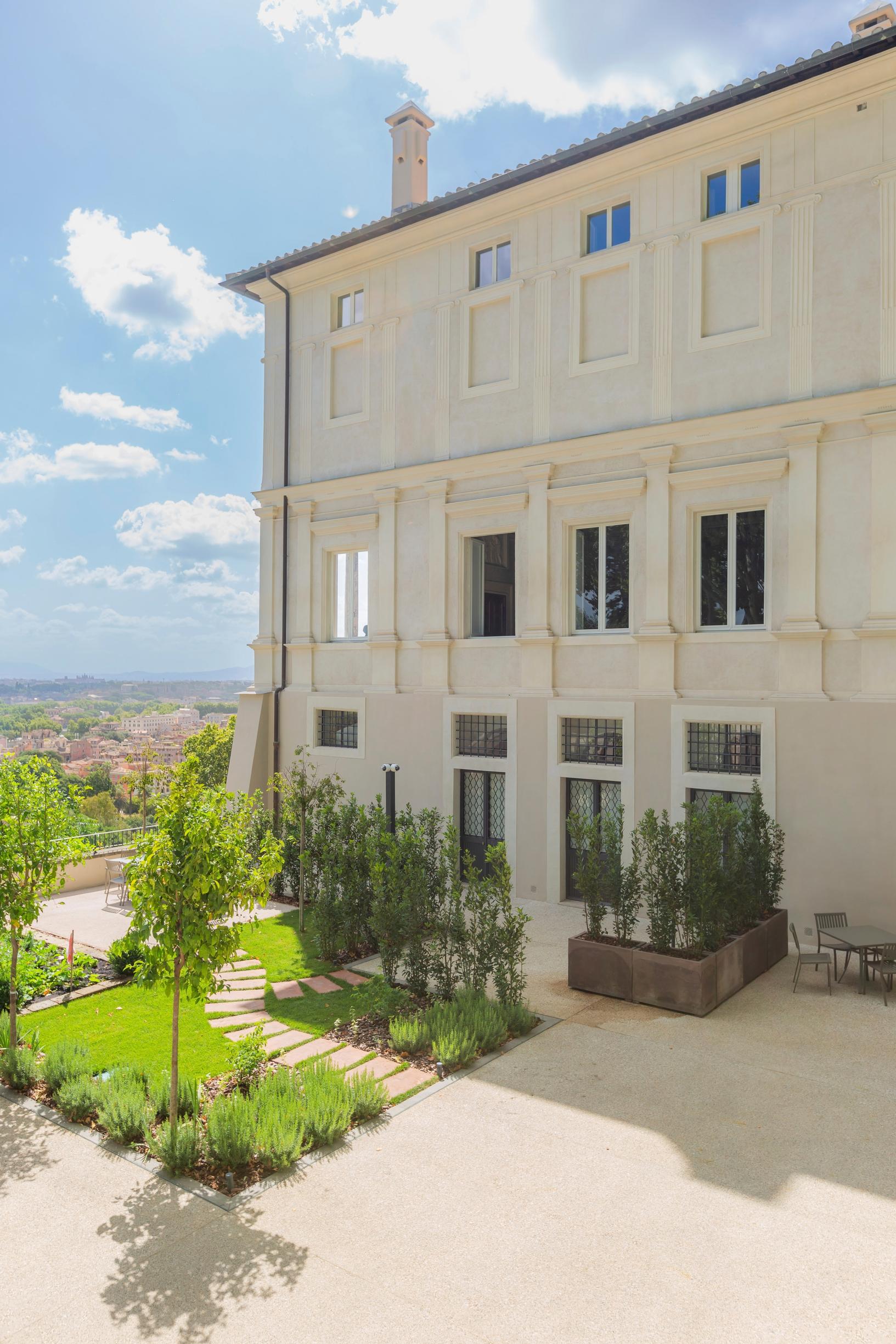 Peruskorjaus ulottui huvilaa ympäröivään puutarhaan. Italialaisen maisema-arkkitehdin johdolla tehty puutarhasuunnitelma jatkaa yhteisöllisyyden teemaa, ja ennen vähällä käytöllä ollut alue on muutettu asukkaille avoimeksi vihreäksi keitaaksi. Johtajan asunnon yhteyteen on rajattu kasvillisuudella yksityinen terassi ja piha, josta avautuu näköala yli Rooman.