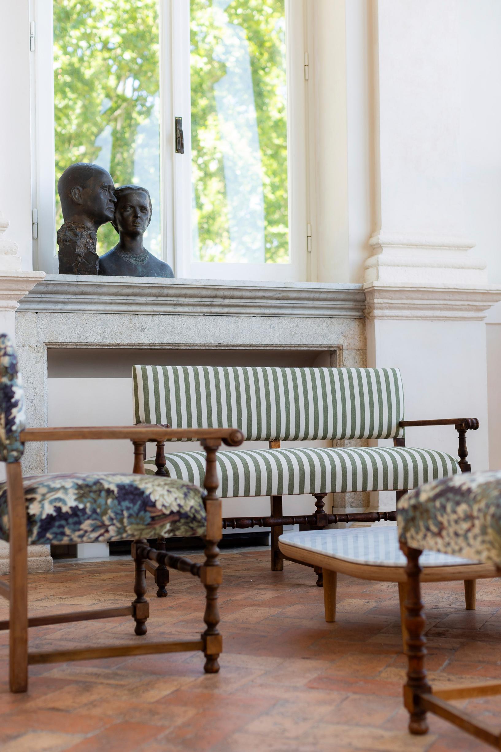 Sisustuksen punaisena lankana toimivat kaksi kuosia, joita on käytetty sekä instituutin perustamisvaiheessa hankittujen antiikkikalusteiden että uusien kalusteiden verhoilussa läpi talon. Annalan kutomon tilaustyönä tehty tasaraitakuosi vie ajatukset Suomeen ja rakennuksen geometrisiin muotoihin. Lauritzonin vapaamuotoinen metsäkuosi taas tuo mukaan orgaanisuutta. Samalla se ohjaa katsetta ulos ikkunoista, huvilaa ympäröiviin vehreisiin puihin.