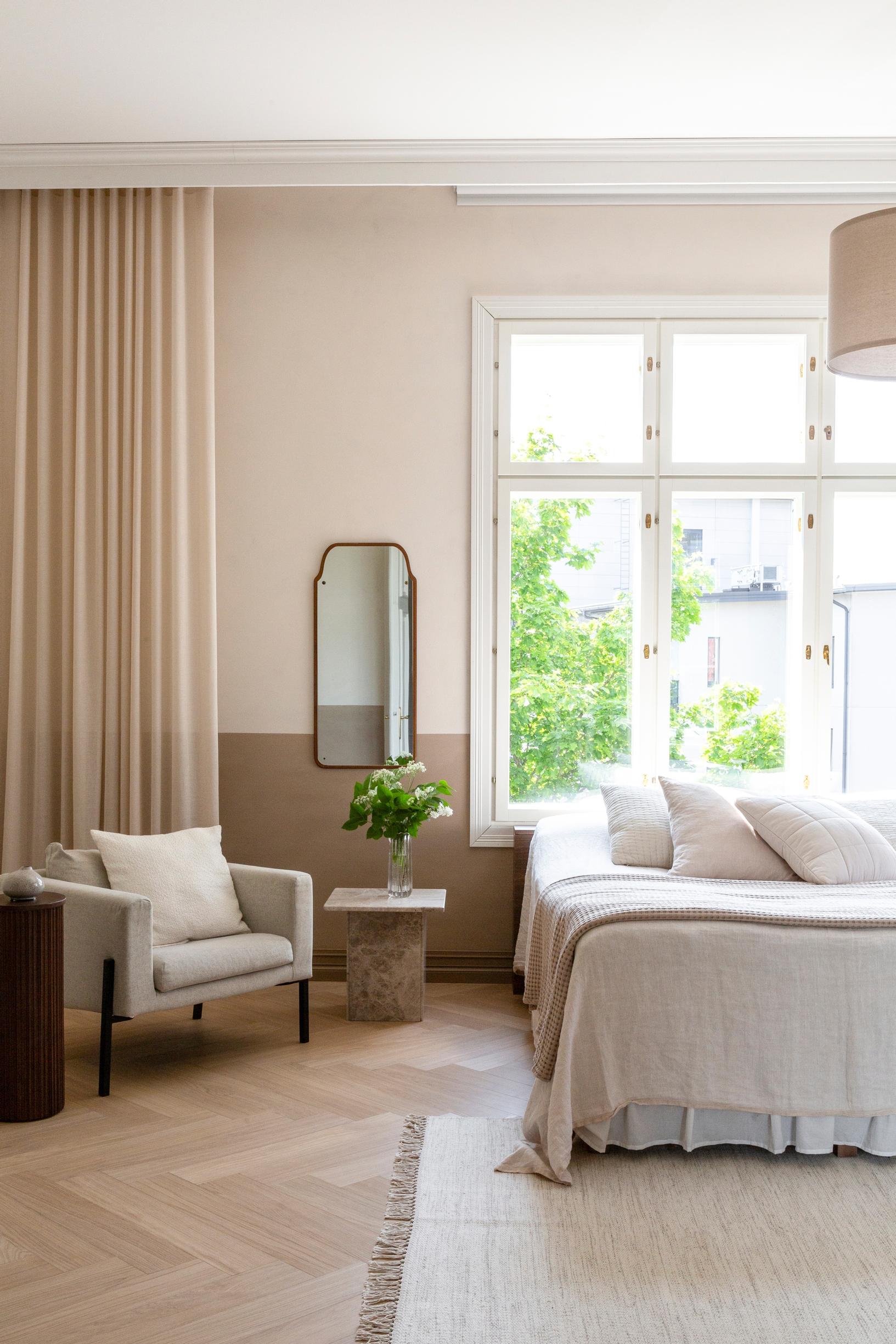 Vanhempien makuuhuoneen seinien sävy on sekoitettu erisävyisistä savimaaleista kuten keittiössäkin. Kaikki asunnon verhot on teetetty Eurokankaassa. Kattolistojen taakse on sijoitettu valonlähde epäsuoralle valolle. Peili on antiikkiliikkeestä. Nojatuoli on ostettu käytettynä.