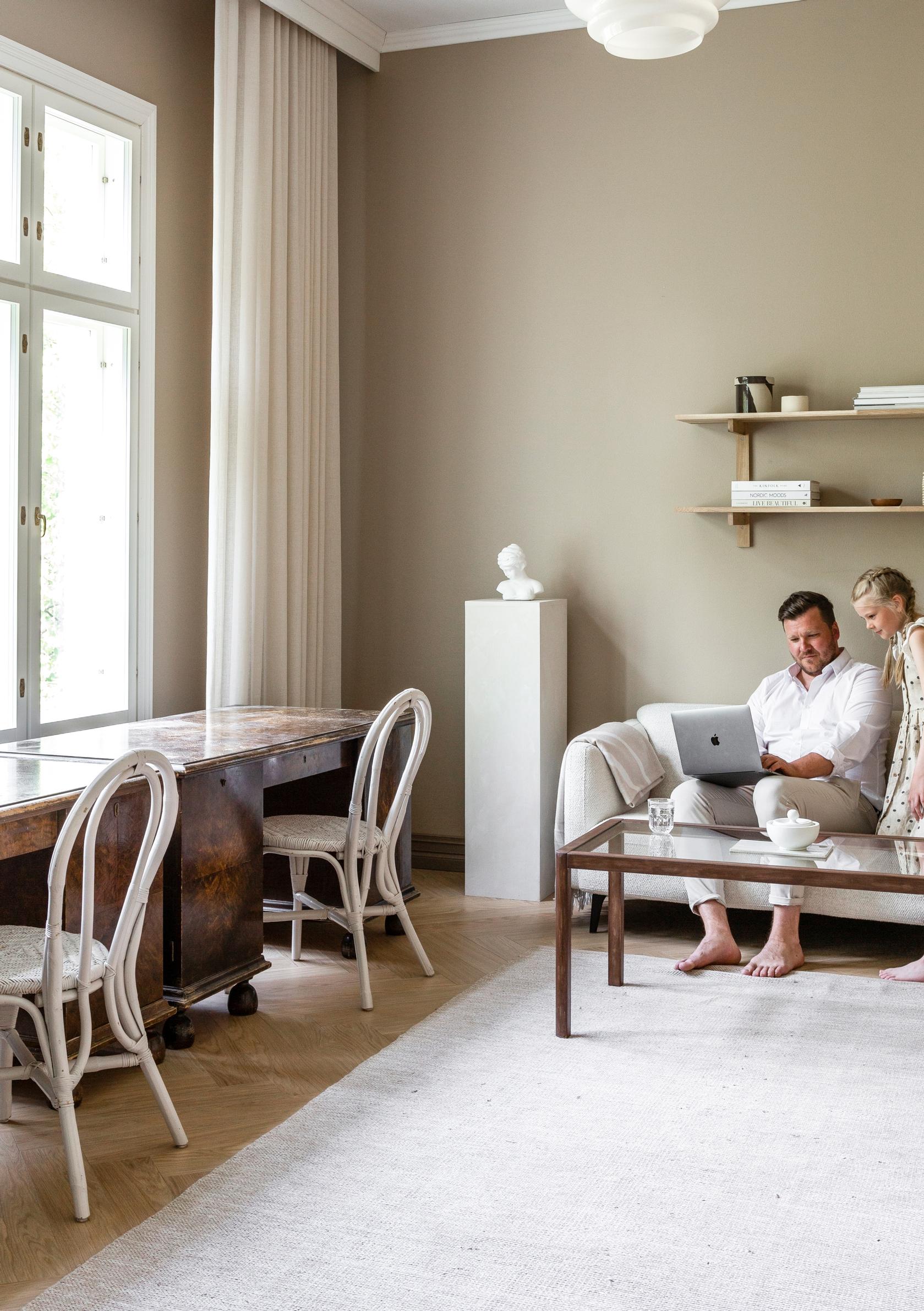 Vuoden kestänyt kunnostusurakka huipentui pintamateriaalien ja värien valintaan. Moona halusi, että vaikutelma on yhtenäinen ja klassisen rauhallinen. Hän on suosinut luonnonmateriaaleja maanläheisissä ja murretuissa sävyissä. Tekstiilejä tarvitaan melko runsaasti, sillä ilman niitä korkeissa huoneissa kaikuisi. Uusia huonekaluja on hankittu sillä ajatuksella, että ne kestävät vuosikymmenien käytön.
