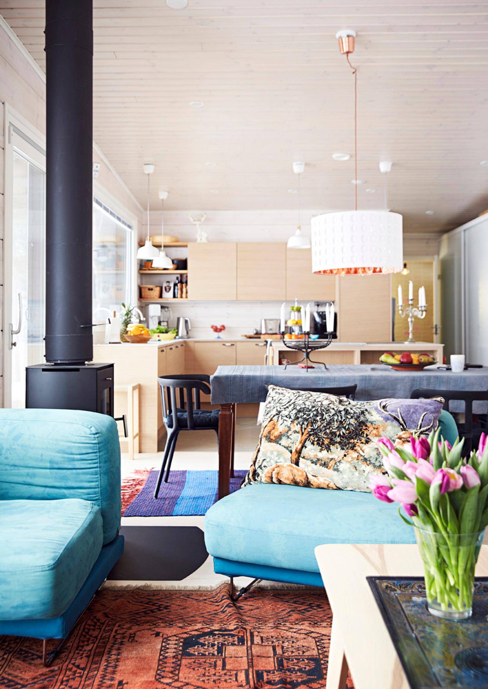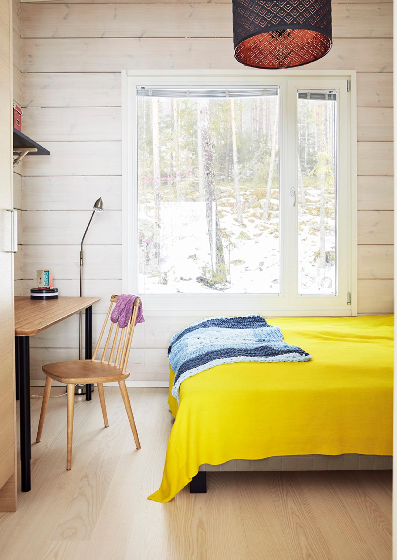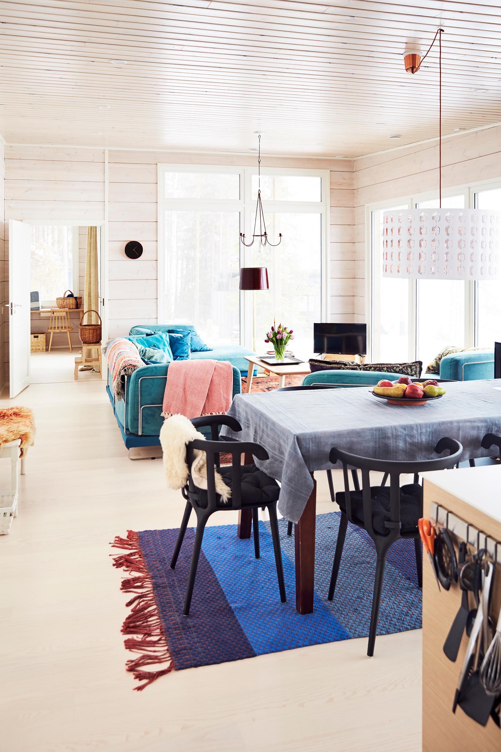 Myös varsinaisen mökin sisustuksen Haapasalot suunnittelivat itse. Pintavärit ovat vaaleita ja kevyitä, ja ne antavat tilaa värikkäille kalusteille. Vaikka Ville on aina pitänyt tummista sävyistä, tänne hän halusi vaaleutta, jotta luonto ja sen värit pääsevät esille ja näkyvät sisälle saakka. Tärkeintä oli saada koko seinän kokoiset ikkunat järvelle.