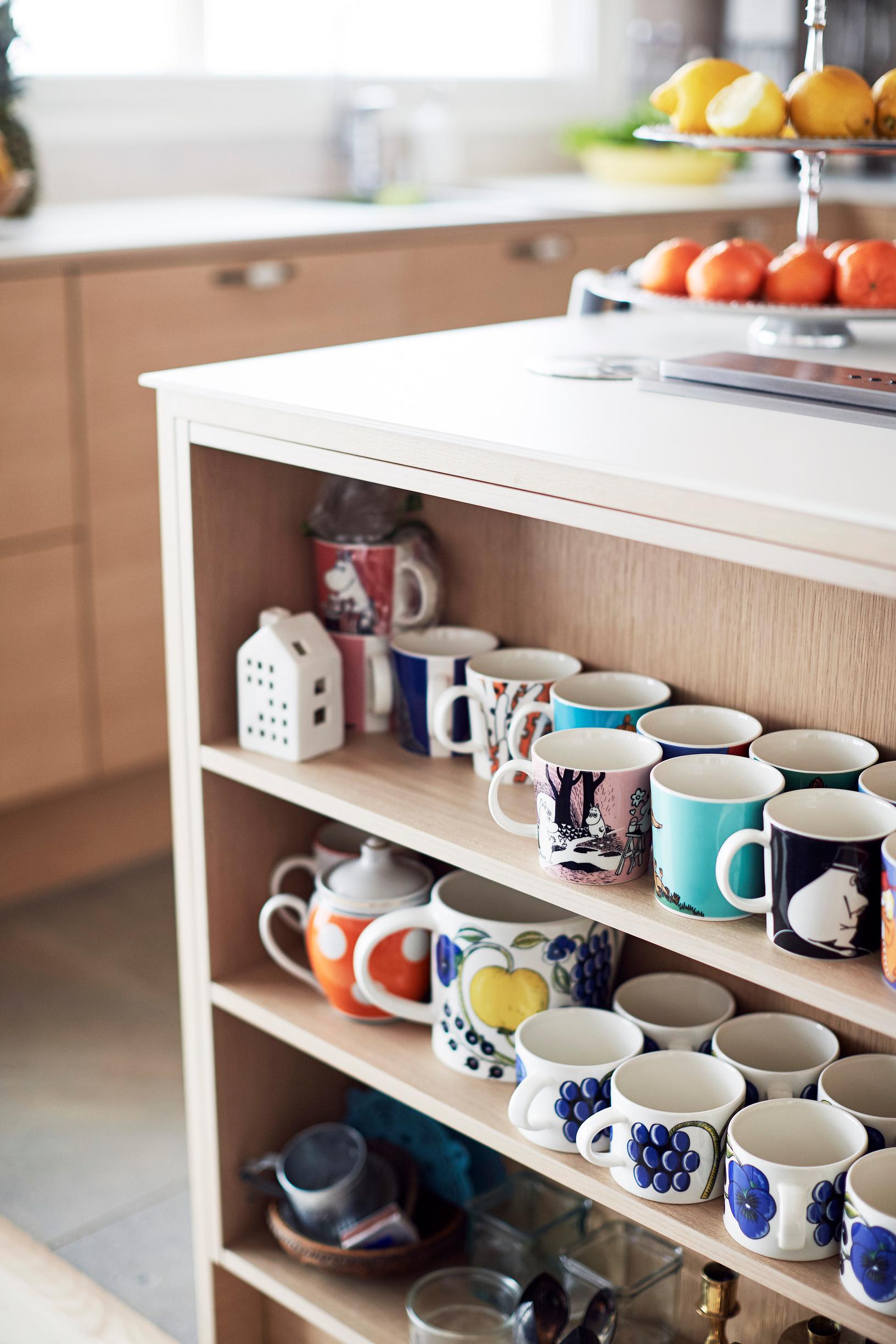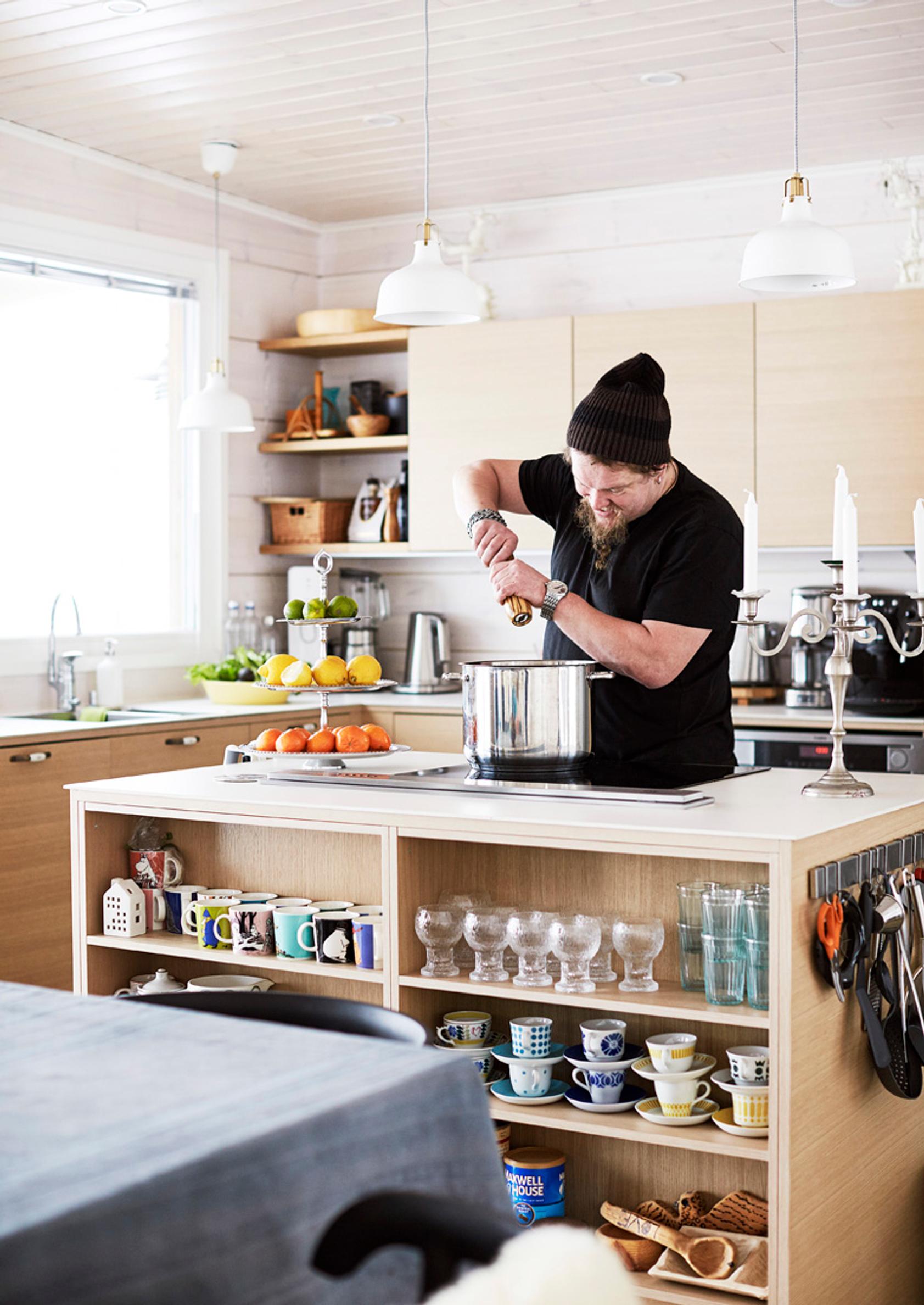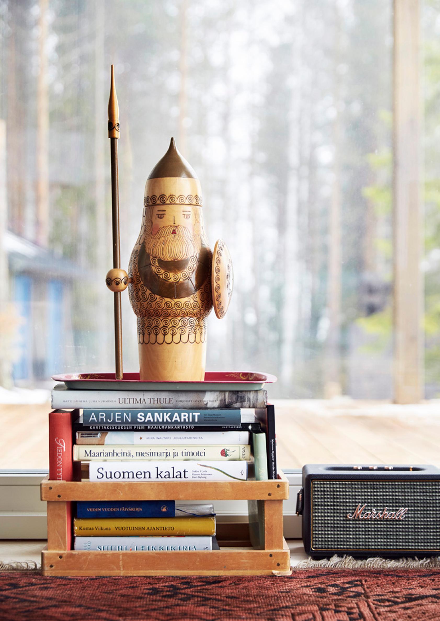 Myös varsinaisen mökin sisustuksen Haapasalot suunnittelivat itse. Pintavärit ovat vaaleita ja kevyitä, ja ne antavat tilaa värikkäille kalusteille. Vaikka Ville on aina pitänyt tummista sävyistä, tänne hän halusi vaaleutta, jotta luonto ja sen värit pääsevät esille ja näkyvät sisälle saakka. Tärkeintä oli saada koko seinän kokoiset ikkunat järvelle.
