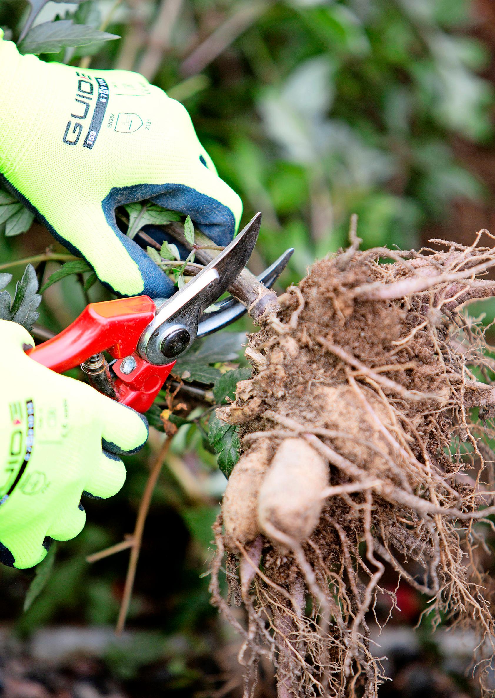 3. Katkaise varsi sekatööreillä eli oksasaksilla pari senttiä juurenniskan yläpuolelta, jolloin juurakkoon jää lyhyt tappi.