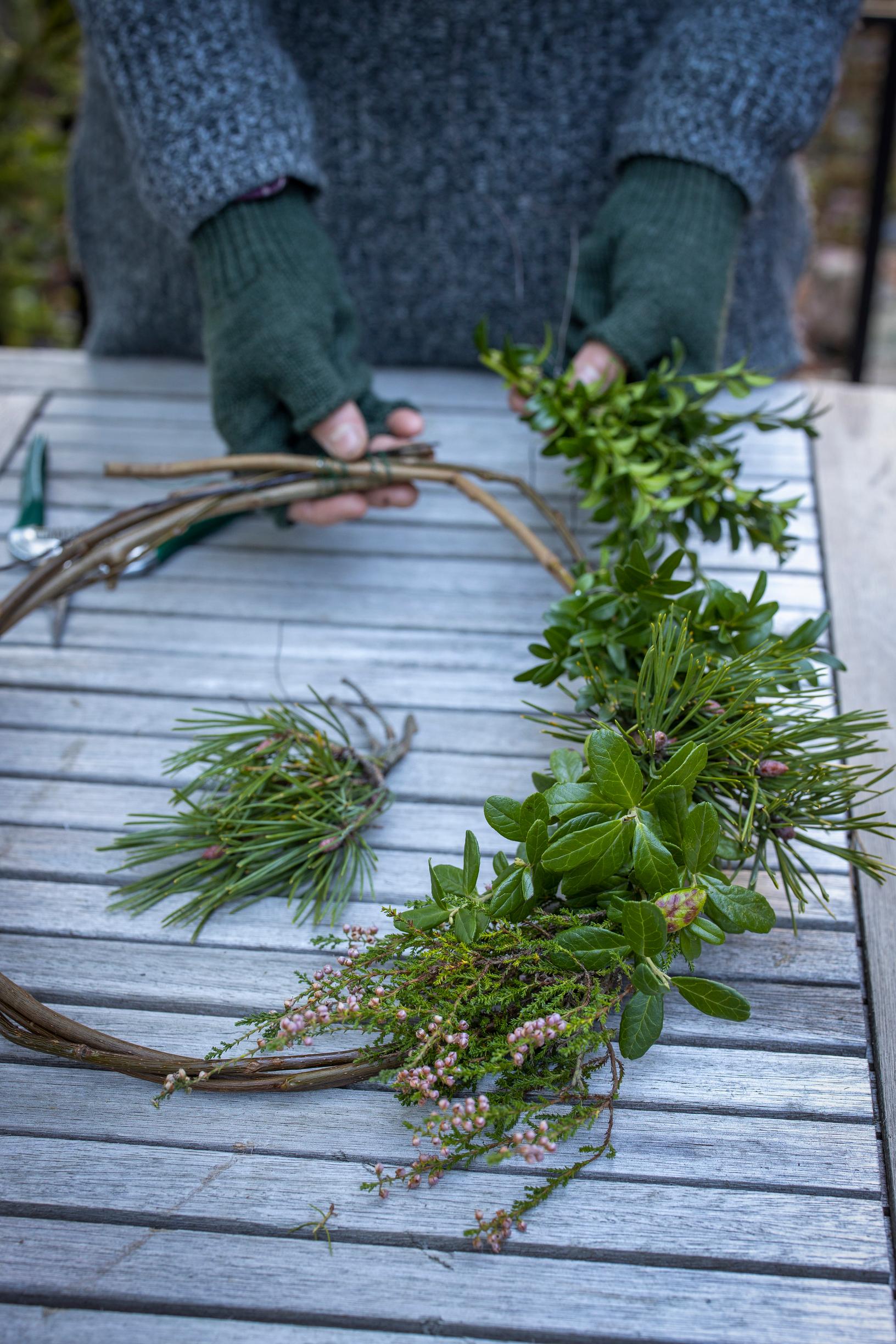 Luonnonmukainen kranssi syntyy helposti oman pihan ja lähiluonnon aineksista. Jos haluat kranssiin havuja, leikkaa syystalvella versoja vain kestävistä lajeista.