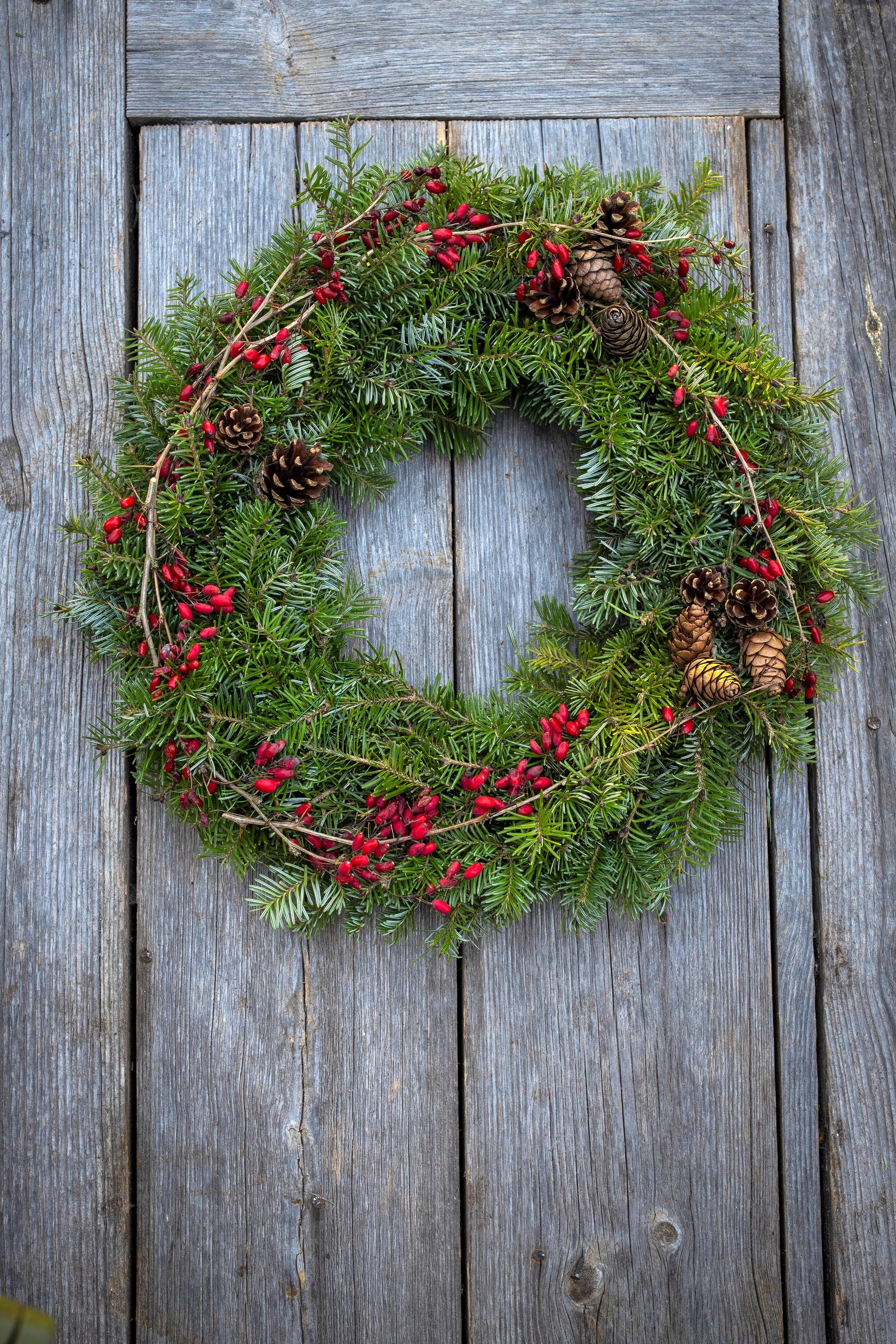 Ehosta kranssia talven mittaan kävyillä ja marjoilla. Esimerkiksi happomarjan rennot marjovat versot on helppo taivutella kranssin muotoon.