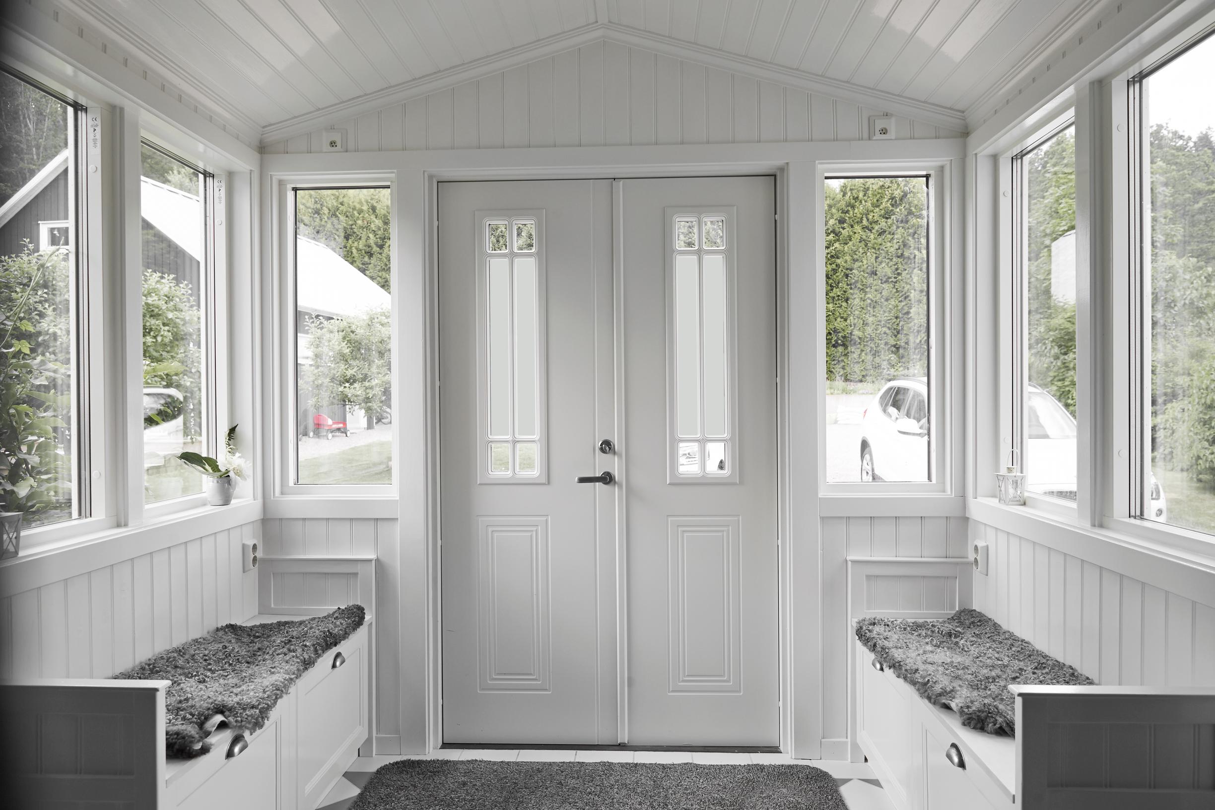 Lasitettu ovi tuo valoa eteiseen ja antaa näköyhteyden ulos. Näköyhteyttä voi myös rajoittaa valitsemalla ulko-oveen satiini- tai kuviolasin.