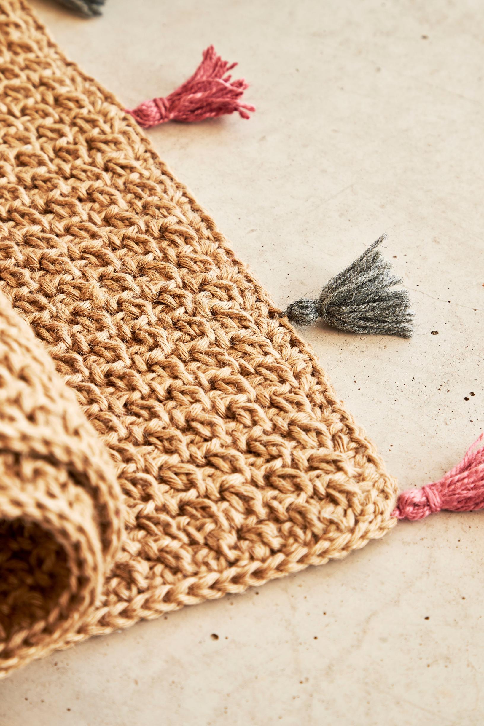 Virkattu juuttimatto sopii mainiosti parvekkeelle tai terassille, mutta myös sisälle esimerkiksi kynnysmatoksi. Matto virkataan luonnollisesta neutraalin värisestä juuttinarusta ja viimeistellään värikkäillä tasselitupsuilla.