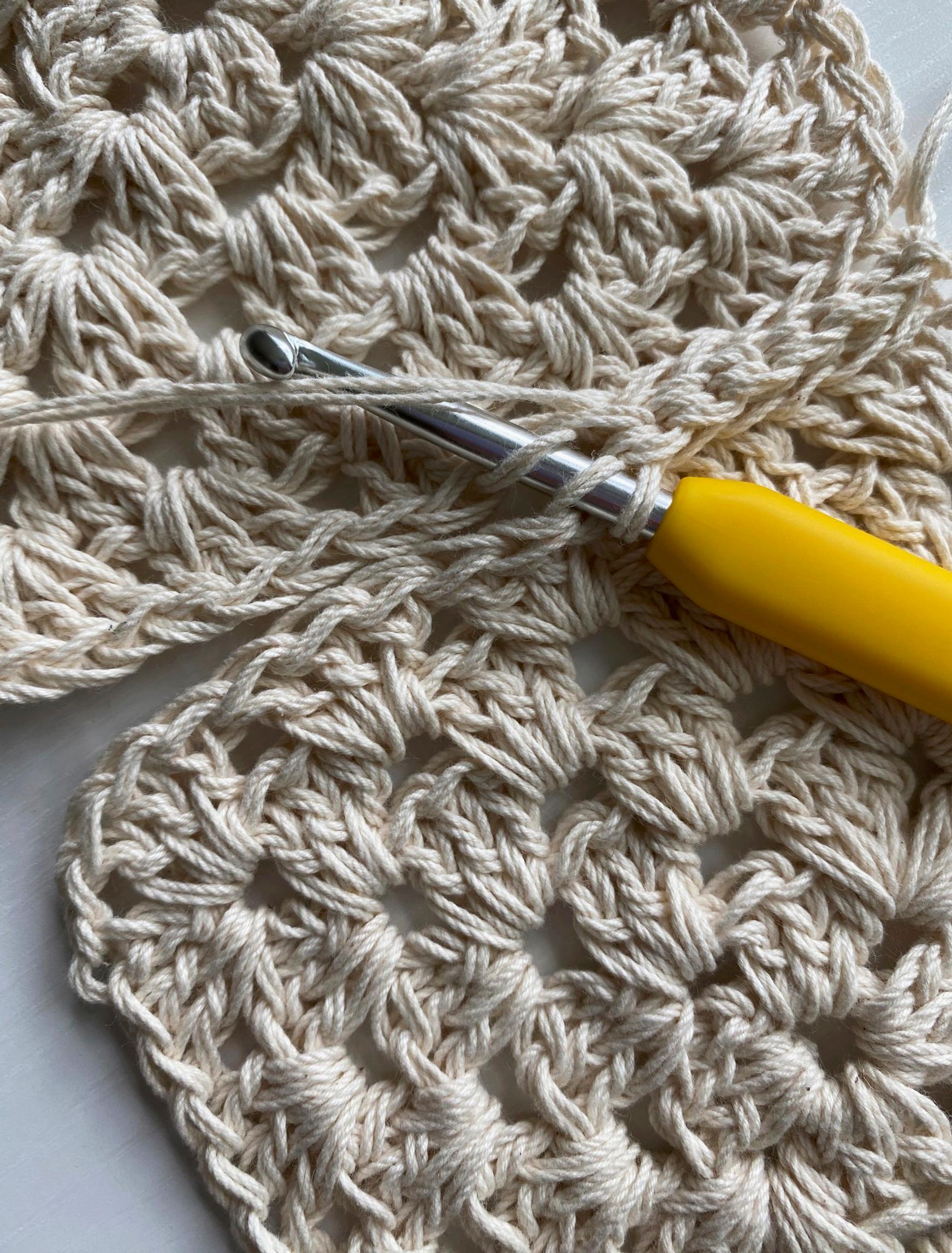 3. krs: Virkkaa 2 kjs, virkkaa 2 p aloituskulmaan. *Virkkaa 3 p väliin, virkkaa 3 p kulmaan, tee 1 kjs, virkkaa 3 p vielä samaan kulmaan. Toista *–* vielä 2 kertaa. Virkkaa 3 p aloituskulmaan, tee 1 kjs ja sulje kerros ps:llä toiseen kjs:aan krs:n alusta.
