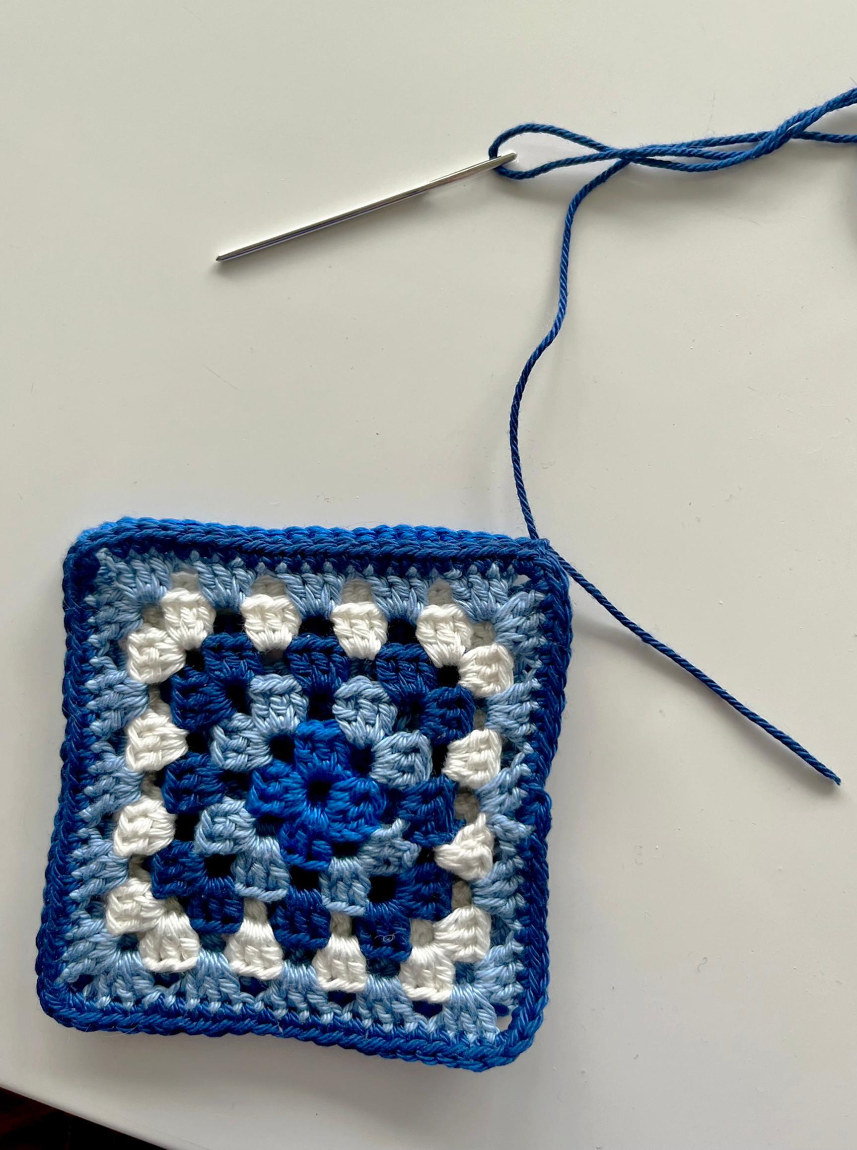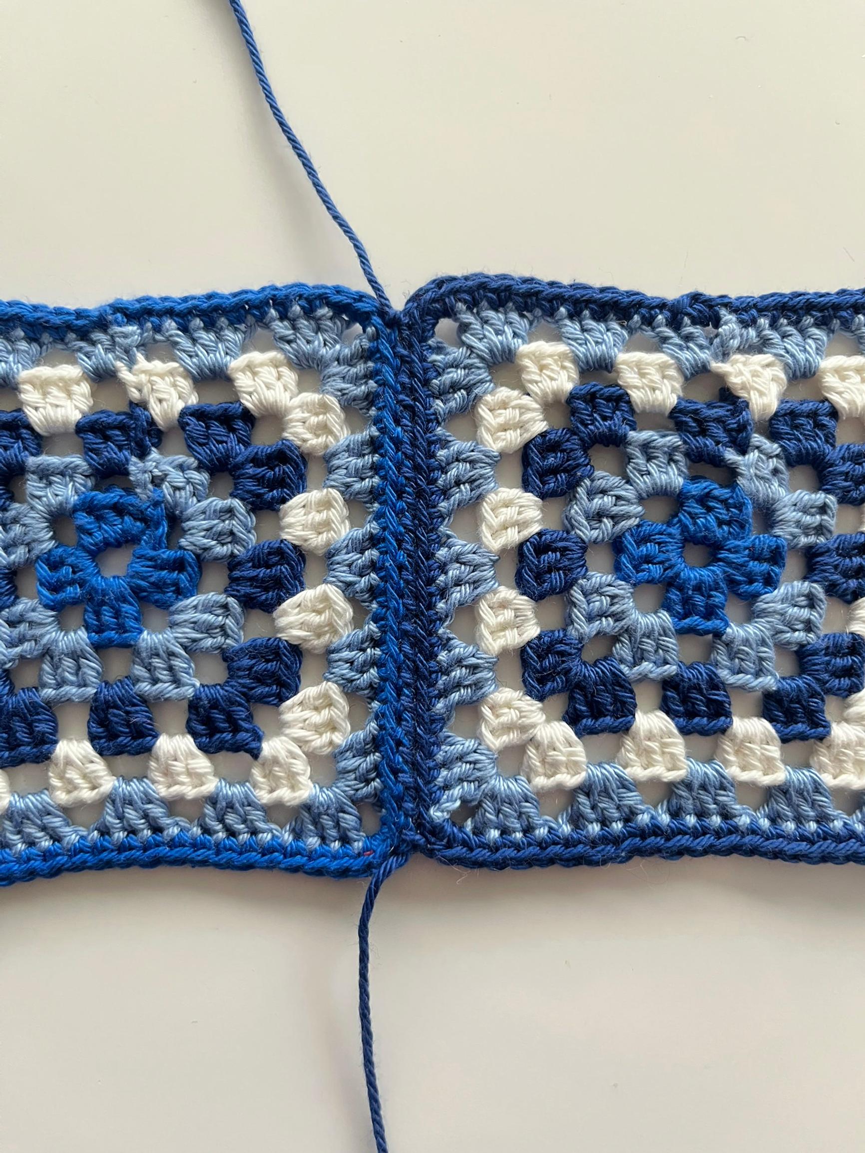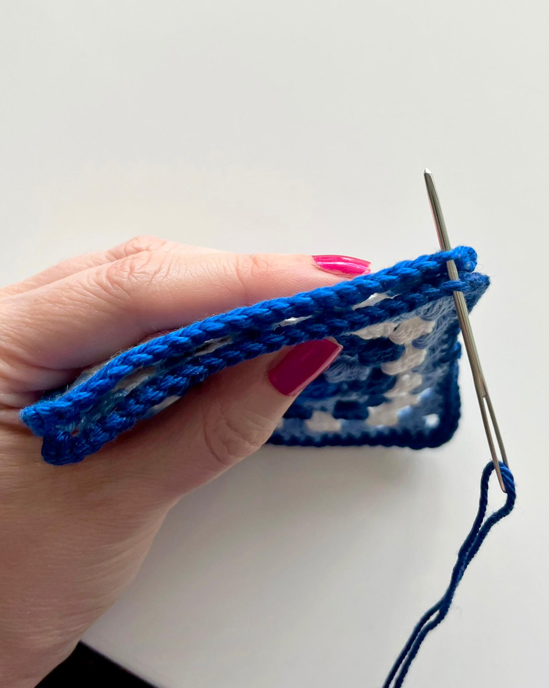 3. Yhdistä isoäidinneliöt ompelemalla ne vuoropistoilla yhteen. Tarvitset reunojen väriin sointuvaa lankaa ja tylppäpäisen päättelyneulan.
