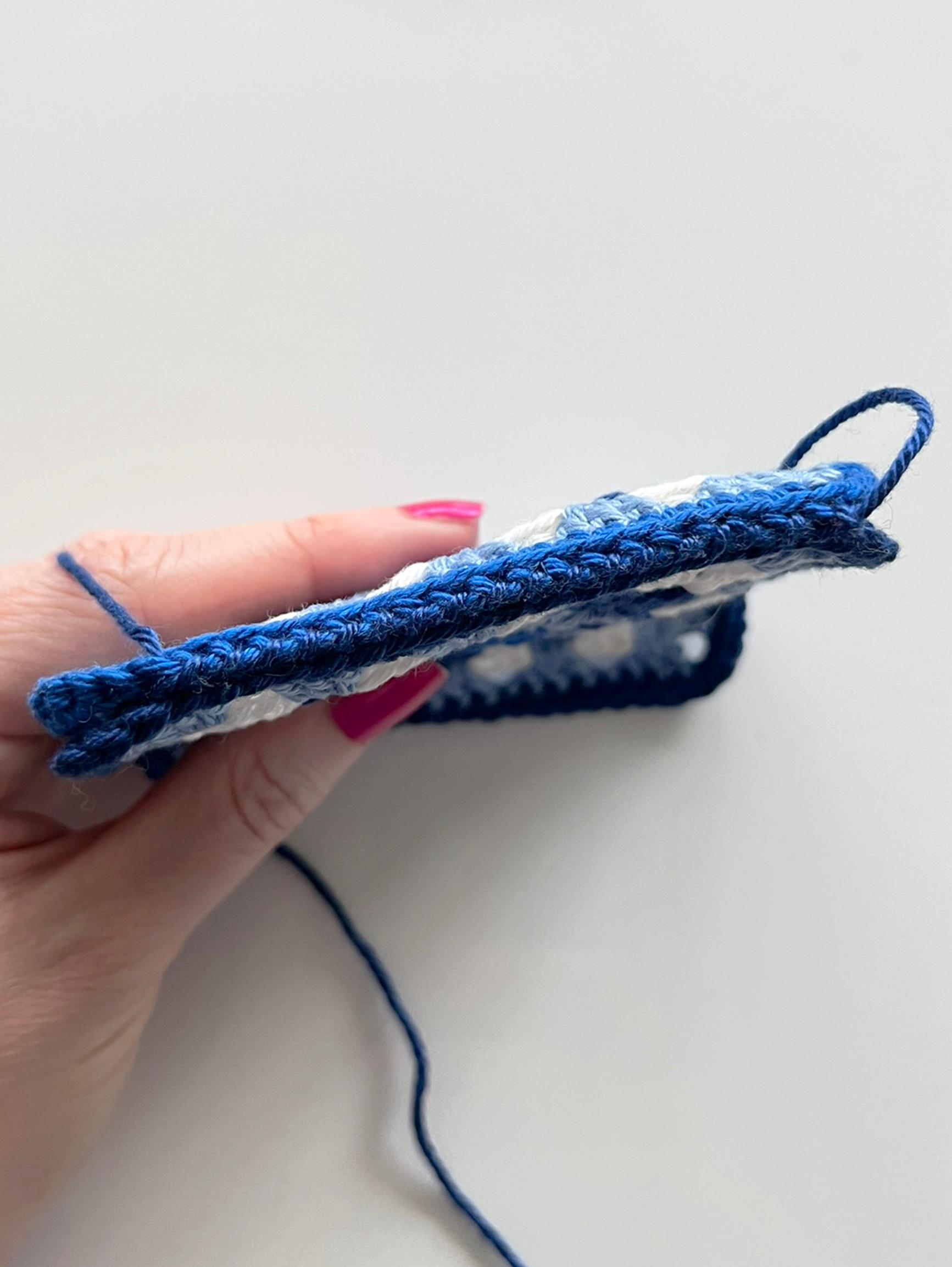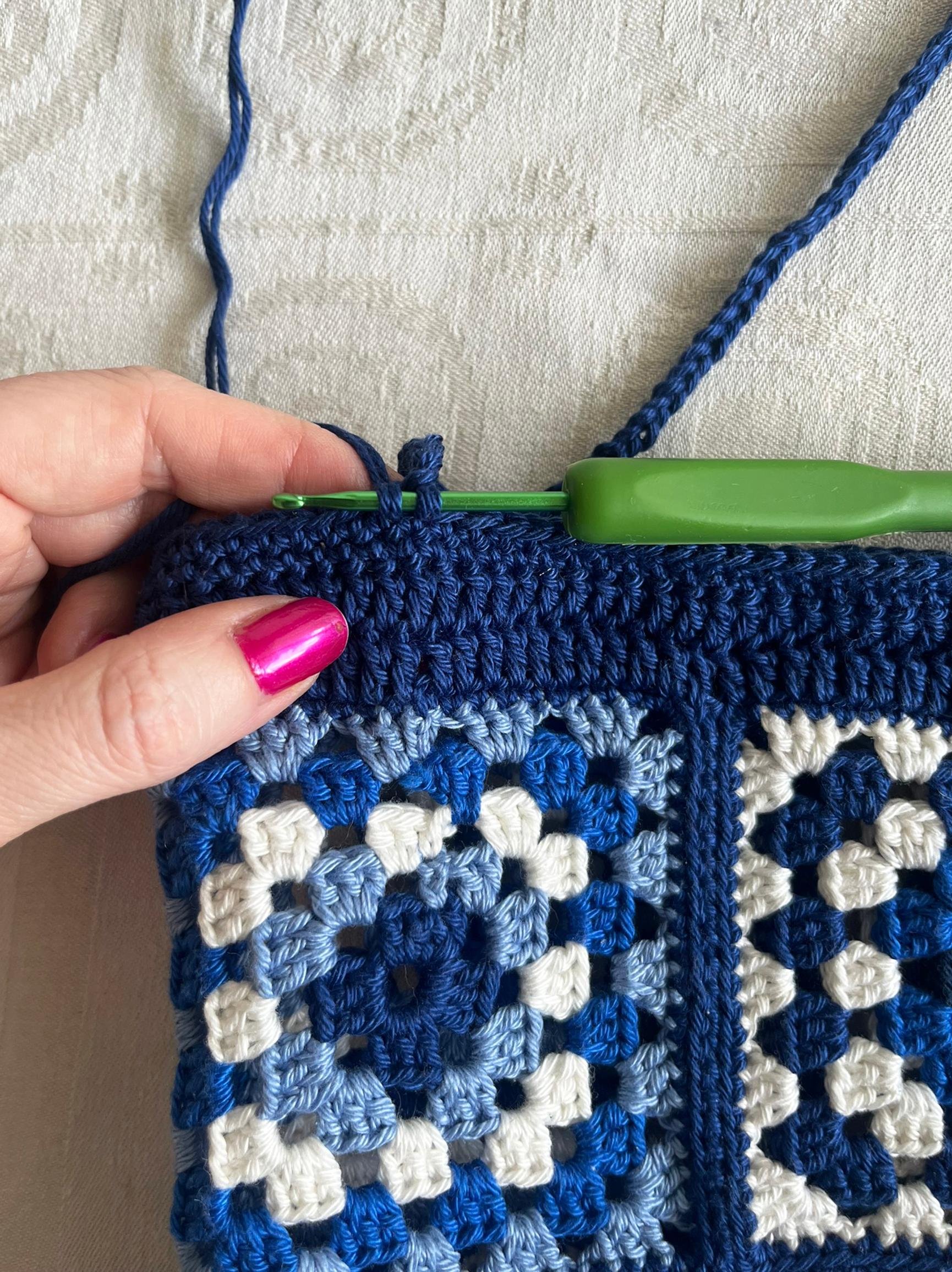 4. Virkkaa laukun yläreunaan 2 krs pylväitä värillä Midnight. Virkkaa pylväs jokaiseen reunan kiinteään silmukkaan. Jatka samalla värillä ja virkkaa 2 krs kiinteitä silmukoita. Kiinteät silmukat tukevat reunaa ja antavat siihen ryhtiä. Veltostumista ja venymistä vähentää myös tiivis virkkuujälki.