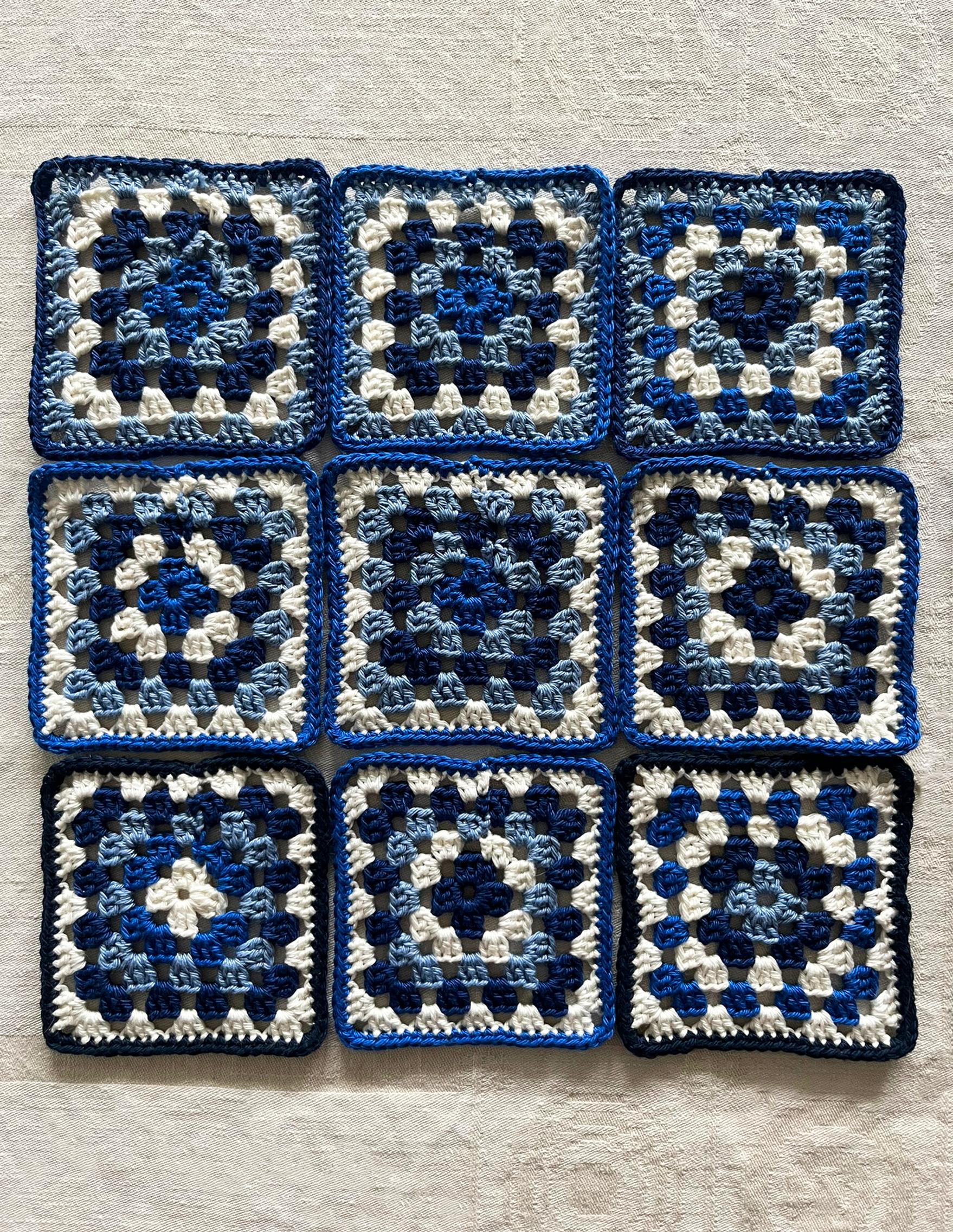 1. Virkkaa ensin isoäidinneliöt valmiiksi. Kassin neliöissä on 6 krs eli 5 pylväskerrosta + viimeistelykerros kiinteillä silmukoilla. Yhden palan koko on noin 9 × 9 cm. Mallikassissa värien järjestys vaihtelee, mutta halutessasi voit virkata jokaisesta isoäidinneliöstä samanlaisen.