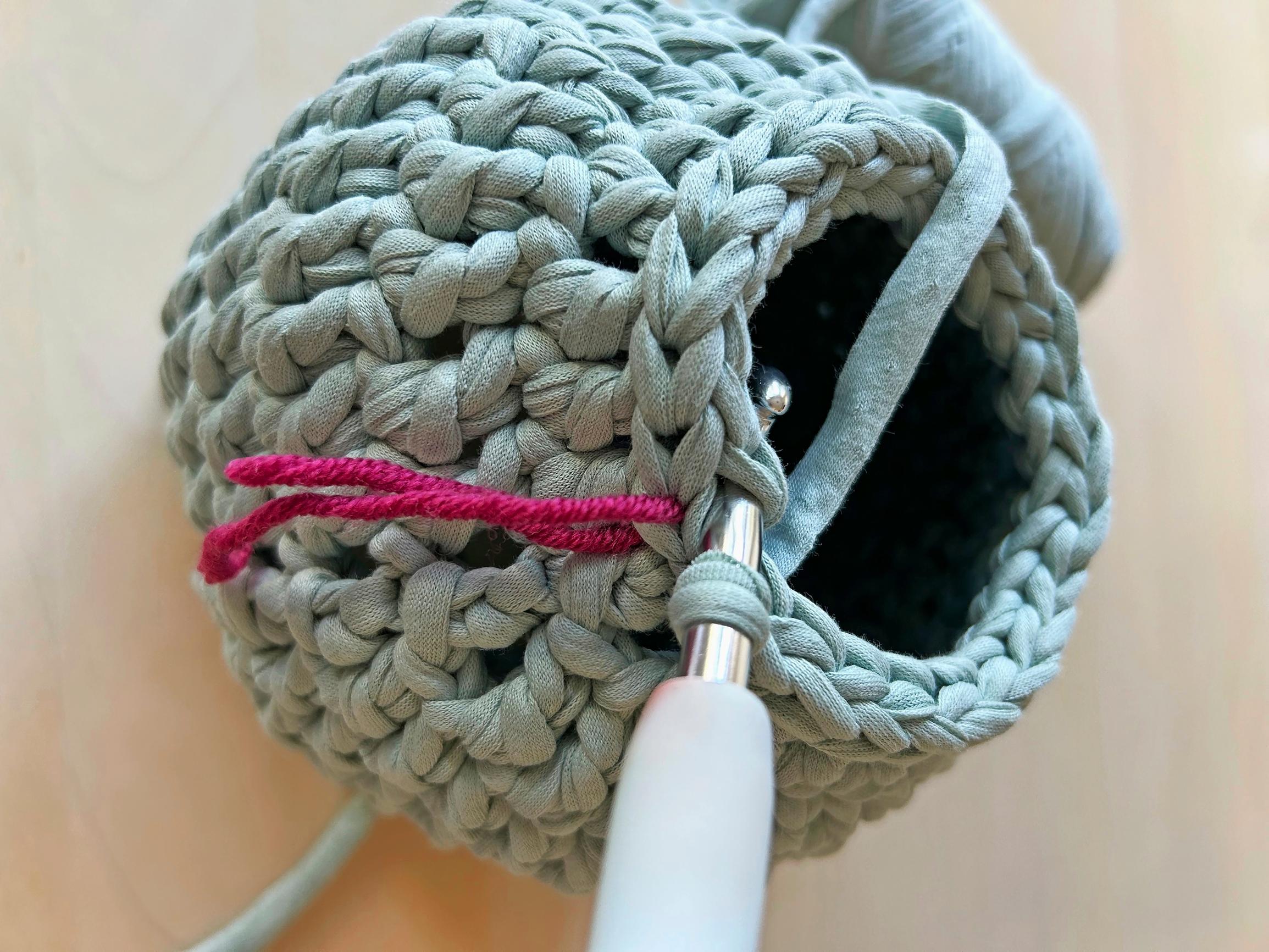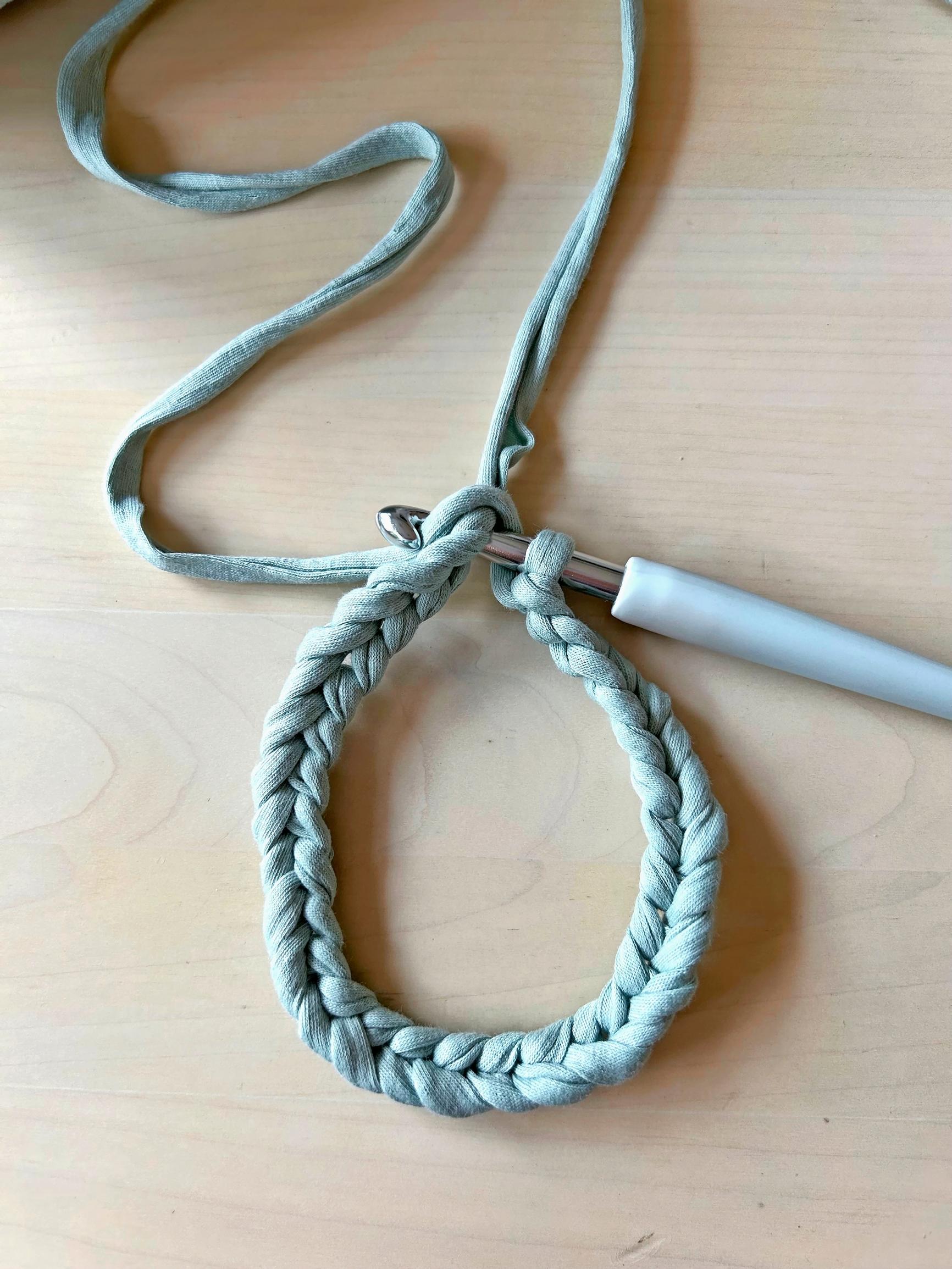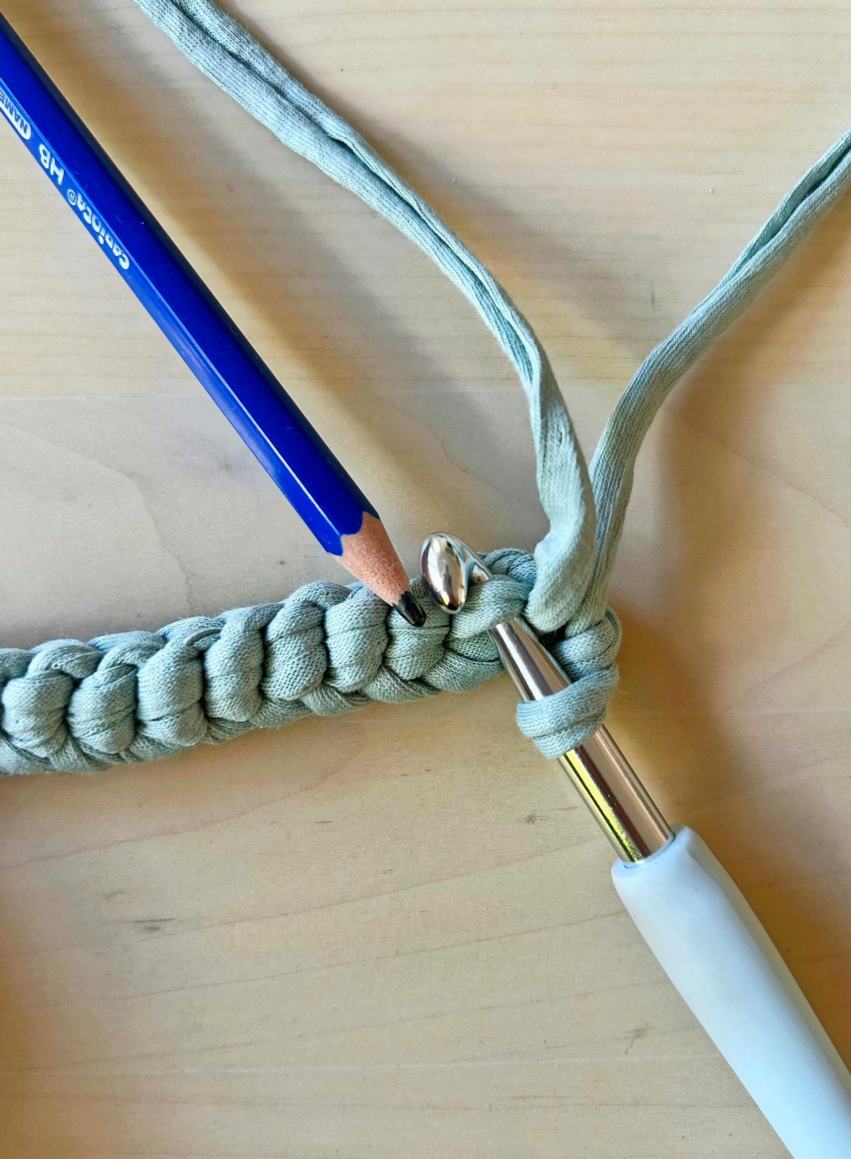 Virkkaa 14 kjs. Jätä aloituslanka pitkäksi, sillä se toimii myöhemmin kahvan kiinnityslankana.