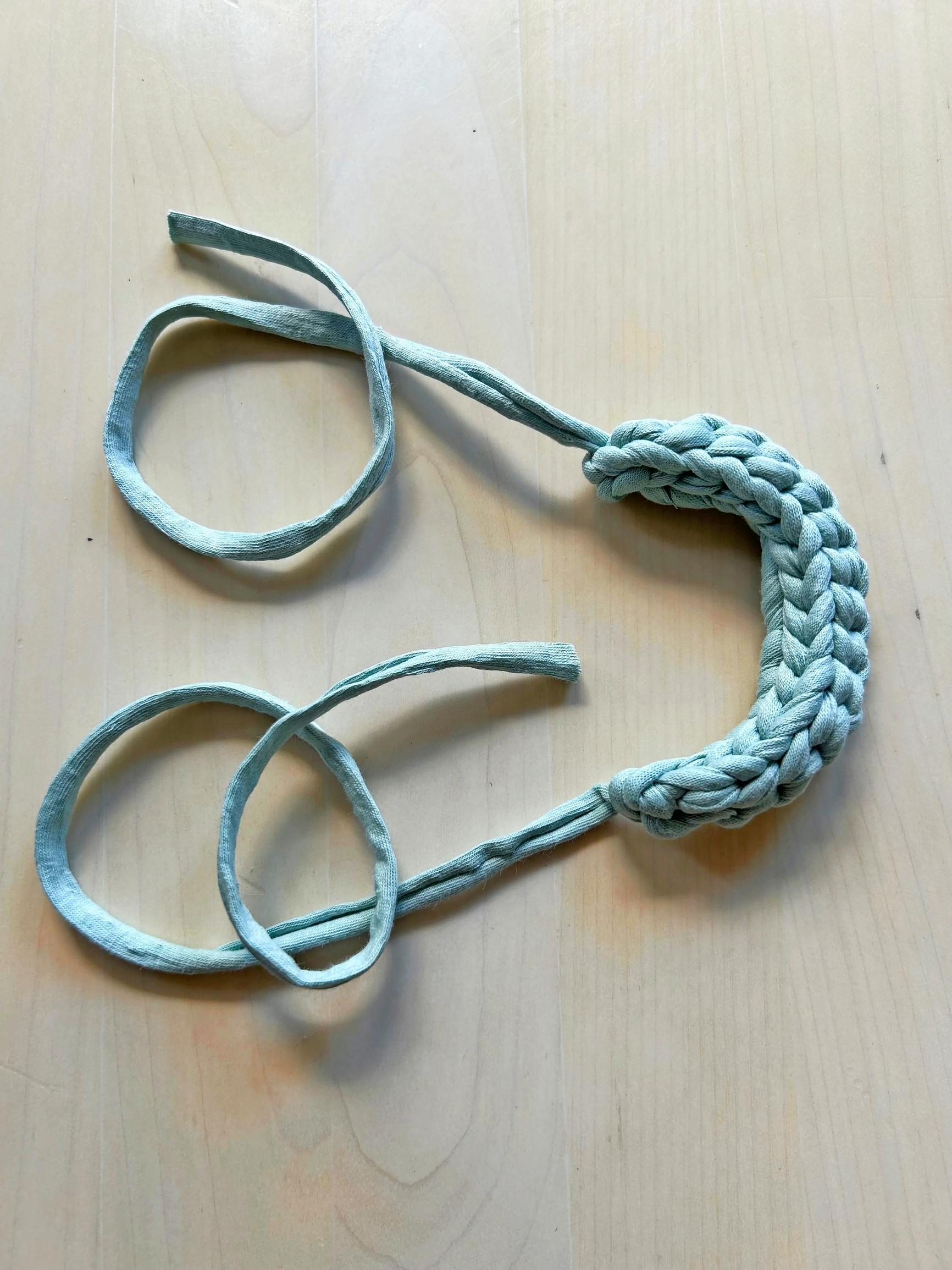 Virkkaa ps koukusta laskien toiseen s:aan. Virkkaa ps jokaiseen aloitusketjun s:aan sekä myös aloitussolmun läpi. Virkkaa tämän jälkeen 2 kjs. Käännä nauha ympäri ja virkkaa ps kunkin kääntöpuolella olevan lenkin läpi (ks. kuva). Päätä. Jätä myös lopetuslanka riittävän pitkäksi, sillä se toimii myöhemmin kahvan toisena kiinnityslankana (ks. kuva).