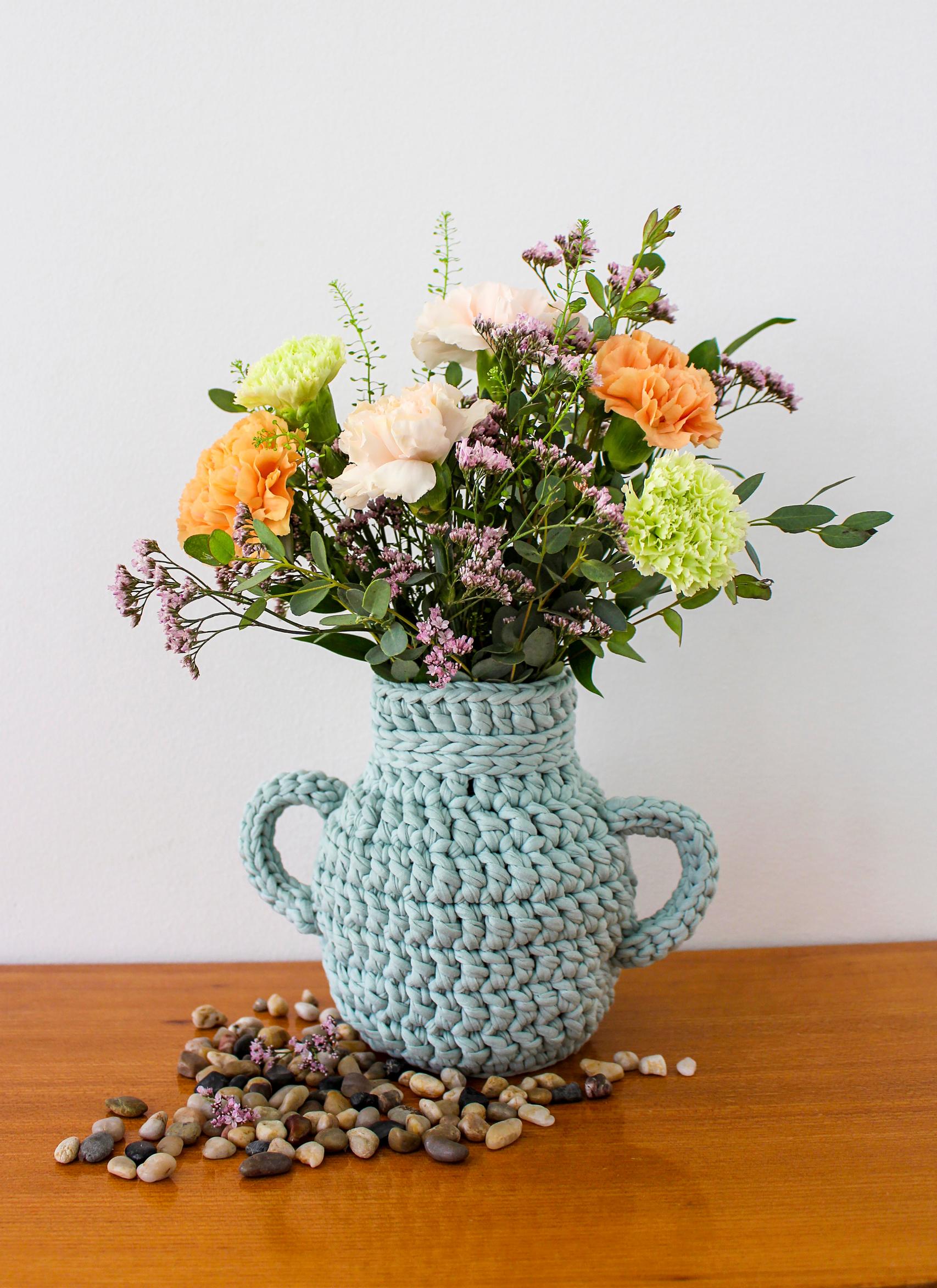Maljakon uudet vaatteet! Virkkaa irrotettava suojus ja sujauta kukkavaasi piiloon