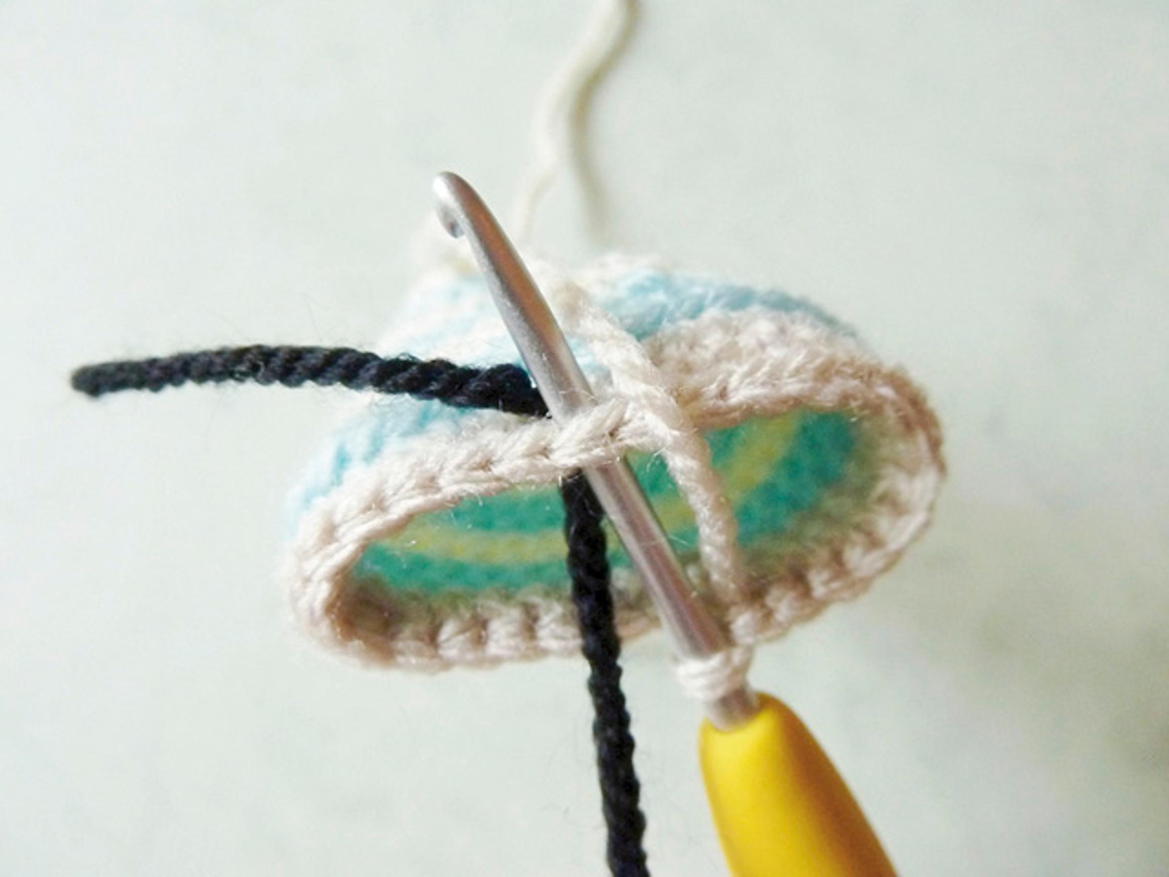 2. krs: Virkkaa ketjuun 2 ks ja katkaise lanka. Kiinnitä antenni langalla baskerin laelle.