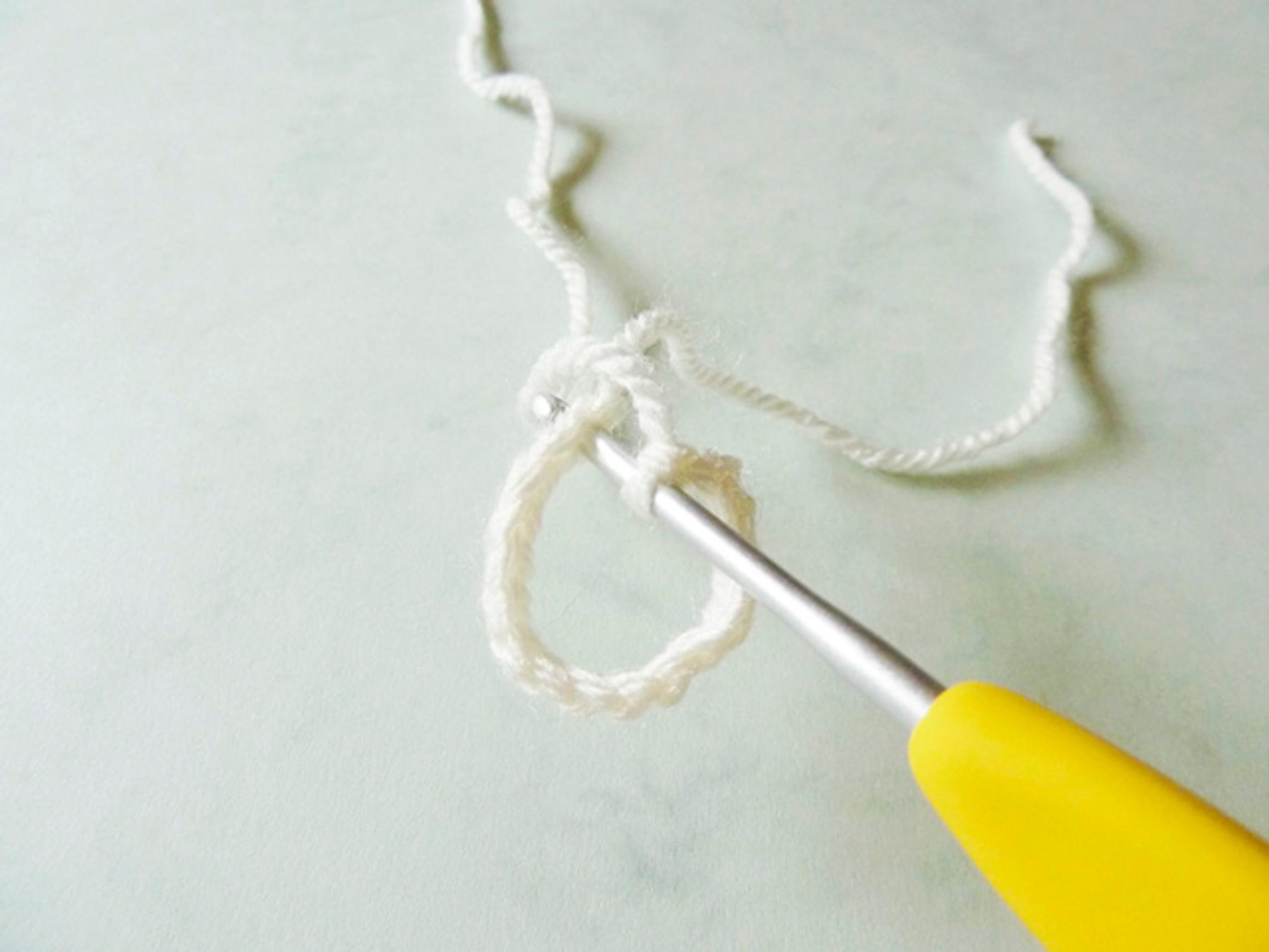 8. krs: Virkkaa 2 ks yhteen, toista tätä 18 kertaa = 18 s. Katkaise lanka ja jätä pitkä langanpää ompelua varten.