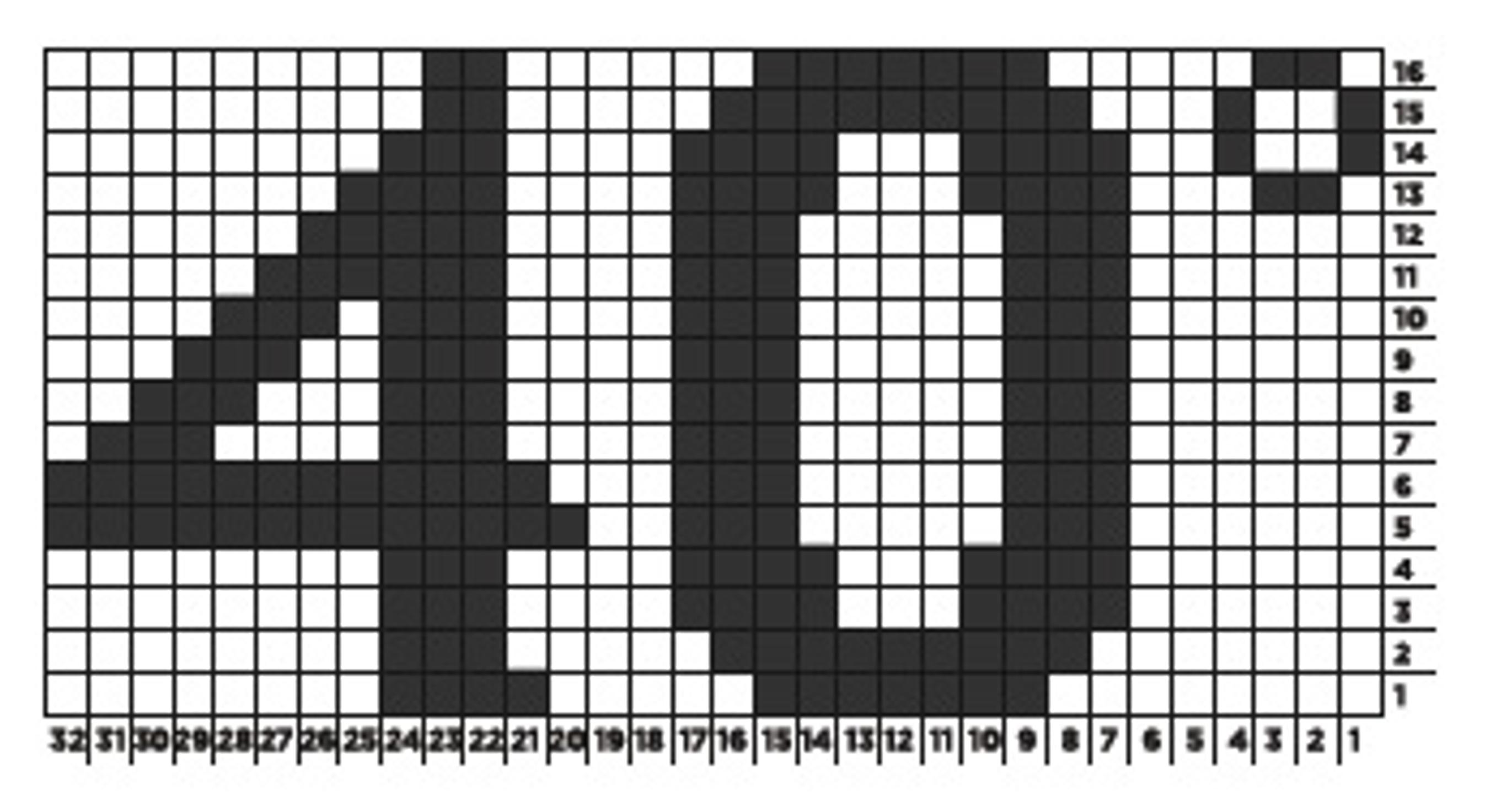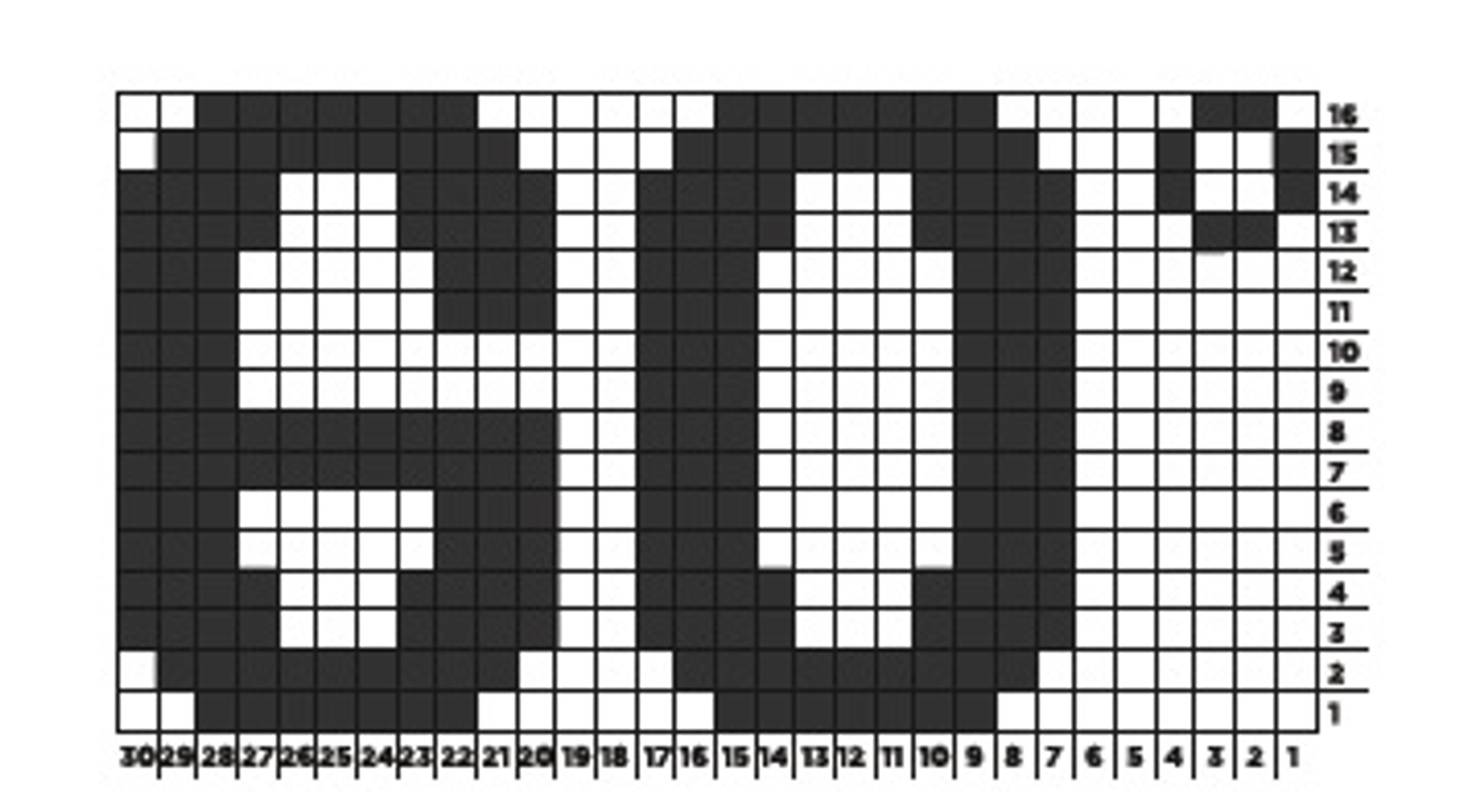 40°-ruutupiirros, 1. krs: tee 7 ks värillä A = musta, värinvaihto, 6 ks värillä B = valkoinen, värinvaihto, 5 ks värillä A, värinvaihto, 3 ks värillä B = valkoinen. Jatka kuten ruutupiirroksessa 60°.