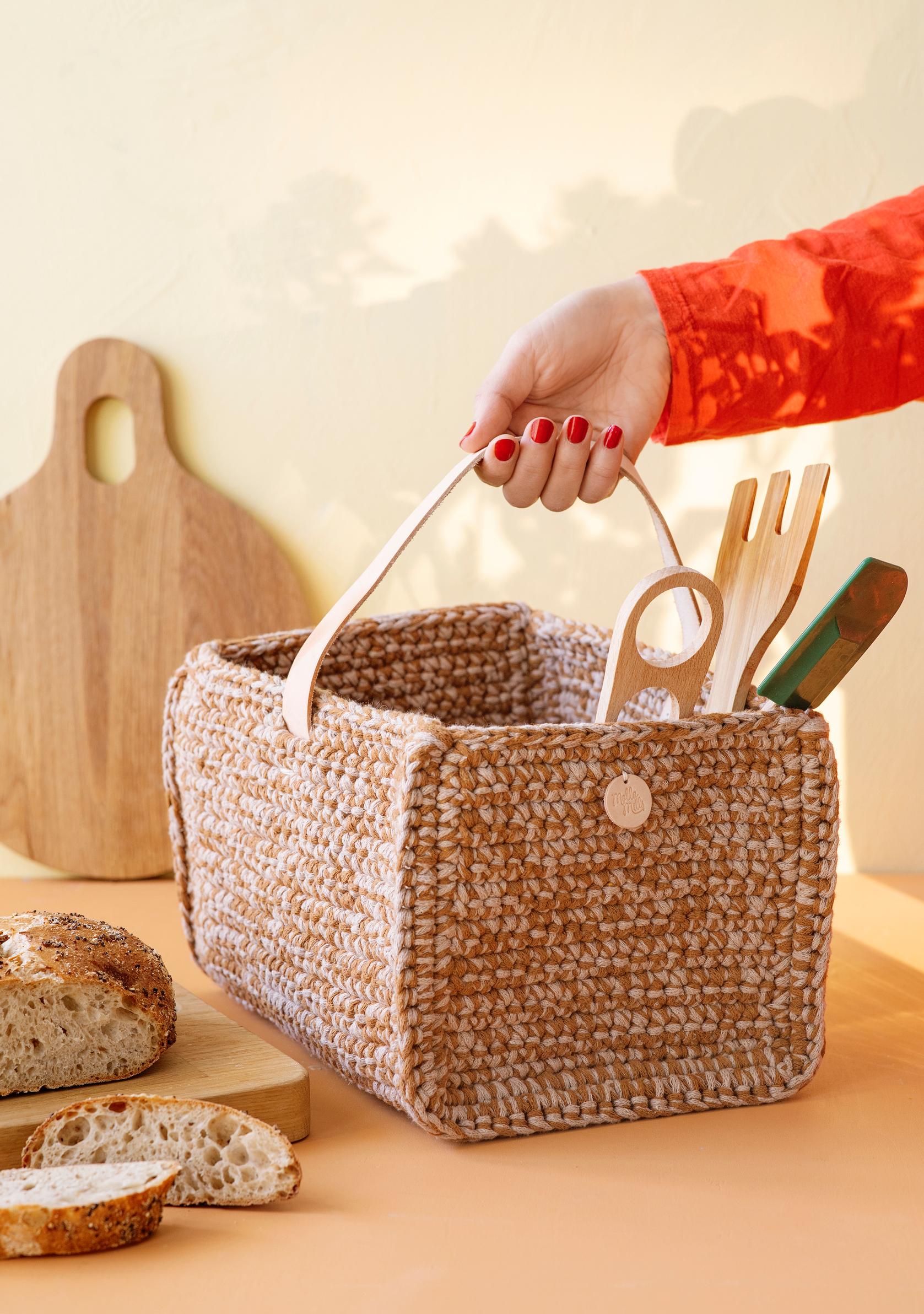 Virkattu sienikori sopii syksyn metsäretkille, mutta löytää paikkansa myös kotona säilytyskorina. Paloista kootun korin rakenne on jämäkkä ja helppo toteuttaa. Materiaali kestää tarvittaessa pesua.