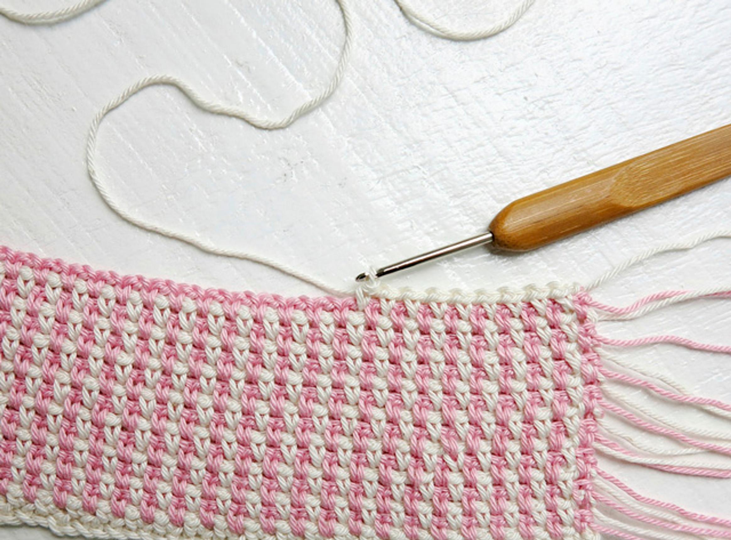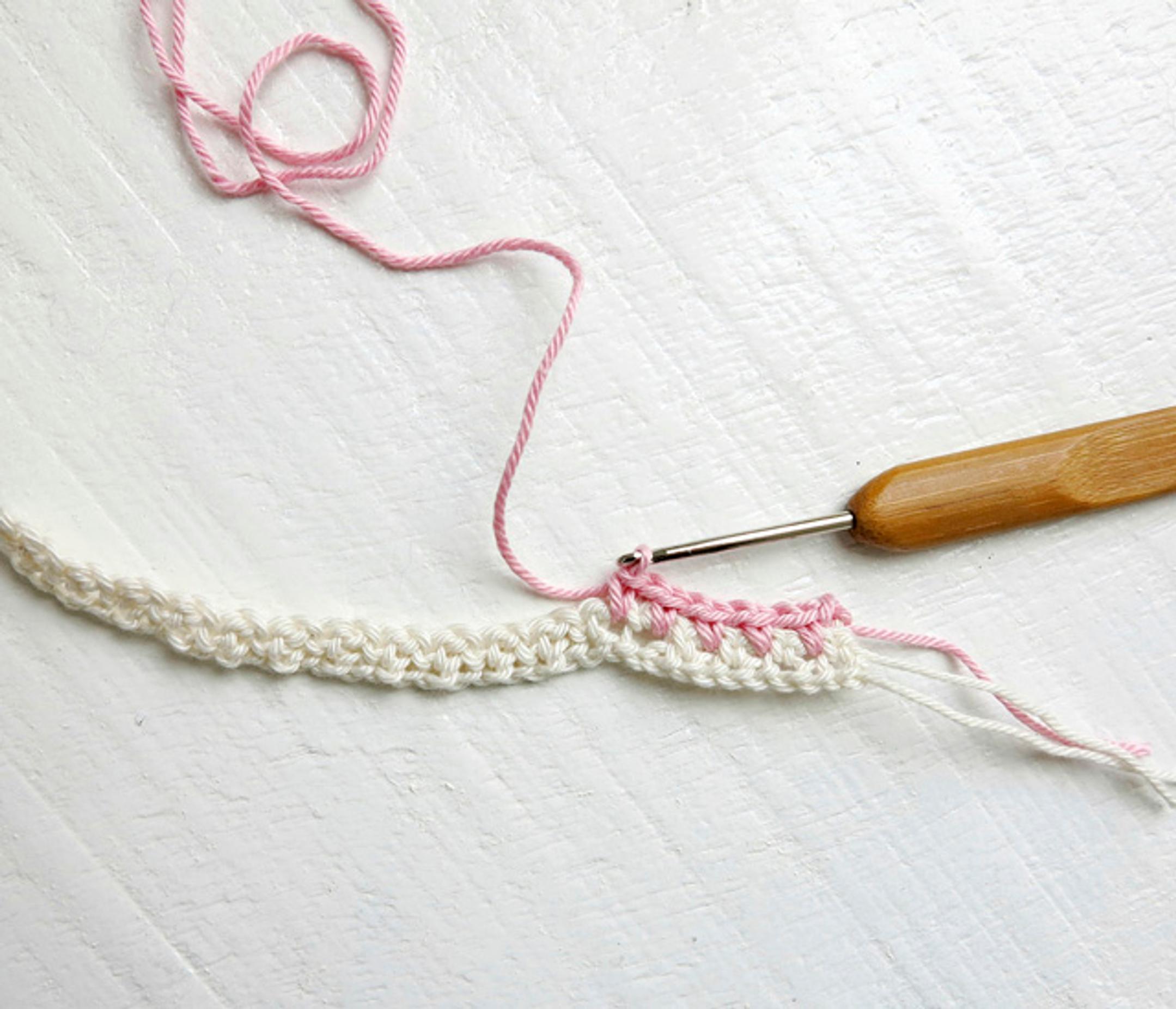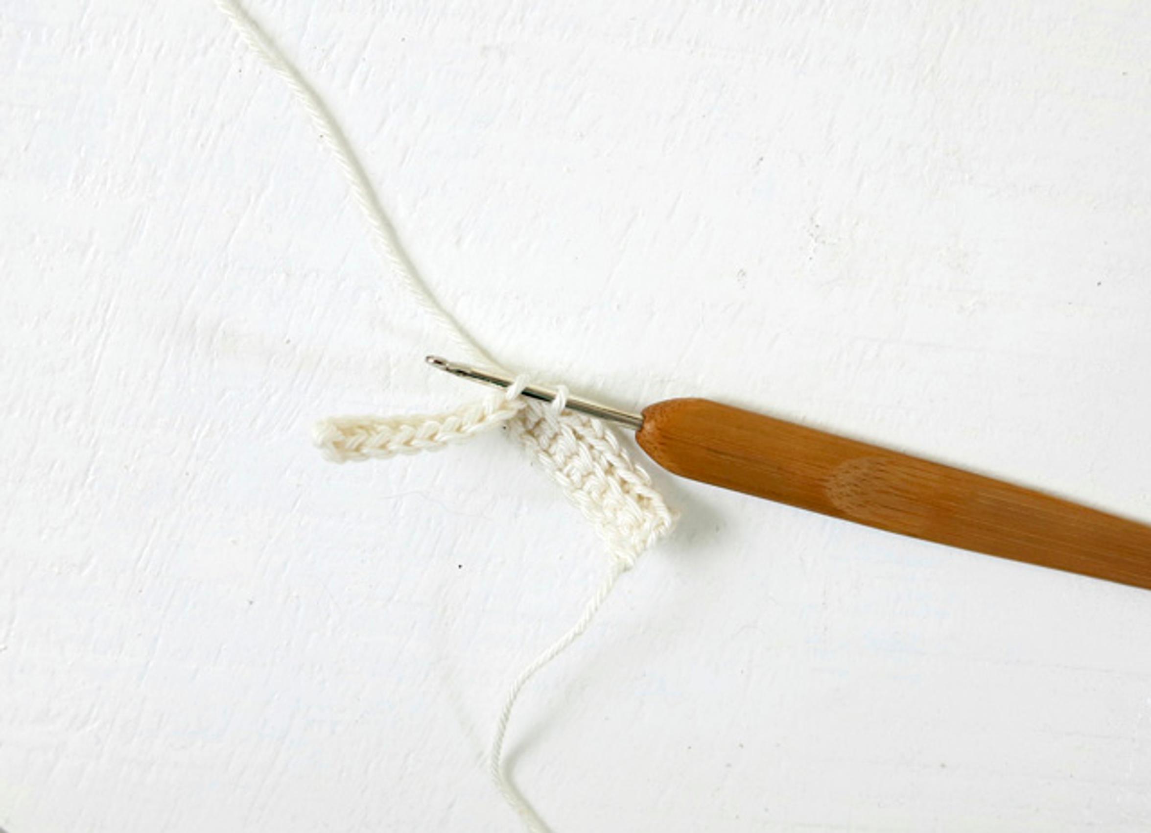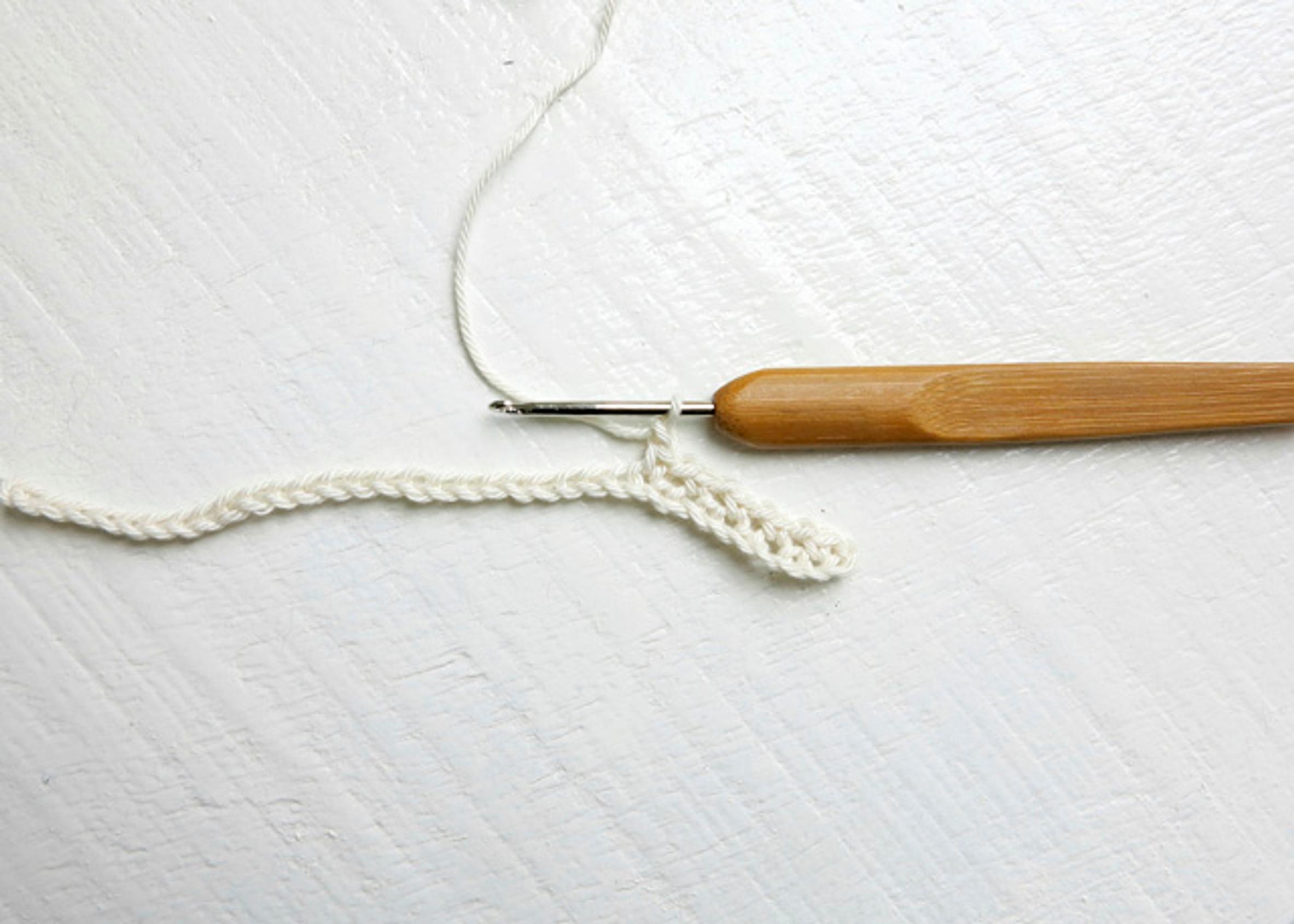 1. Virkkaa värillä A: 1 ks 3. s:aan koukusta laskien, *1 kjs, jätä 1 s väliin (= hyppää yli), 1 ks seuraavaan s:aan*, toista *–* krs loppuun. Tarkista, että nauha on riittävän pitkä henkariisi. Jos se on liian lyhyt, arvioi montako silmukkaa tarvitset lisää ja aloita uudelleen alusta. Käännä työ.