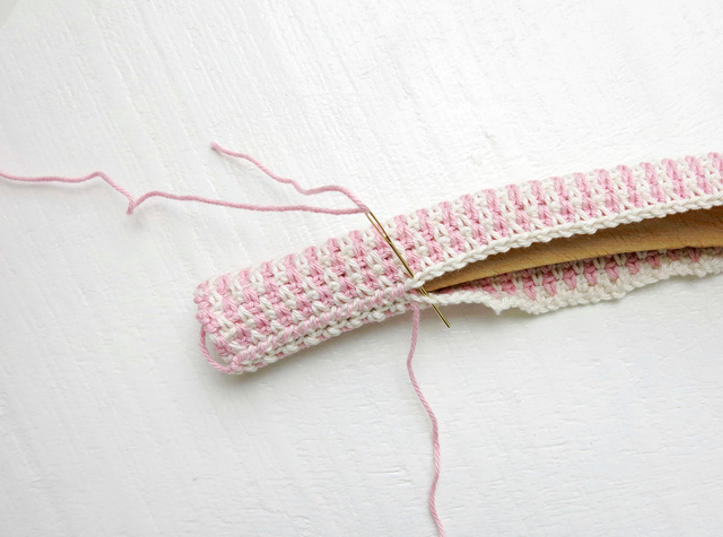 5. Laita nauhat nurjat puolet vastakkain ja virkkaa alareunat yhteen kiinteillä silmukoilla. Virkkaa sitten lyhyet päät yhteen ks:lla ja jatka päälliosan yhdistämistä puoleenväliin saakka. Pujota henkari paikoilleen ja jatka päälliosan yhdistämistä valmiiksi ja virkkaa lopuksi toiset lyhyet päät yhteen. Henkari on nyt kokonaan päällystetty.
