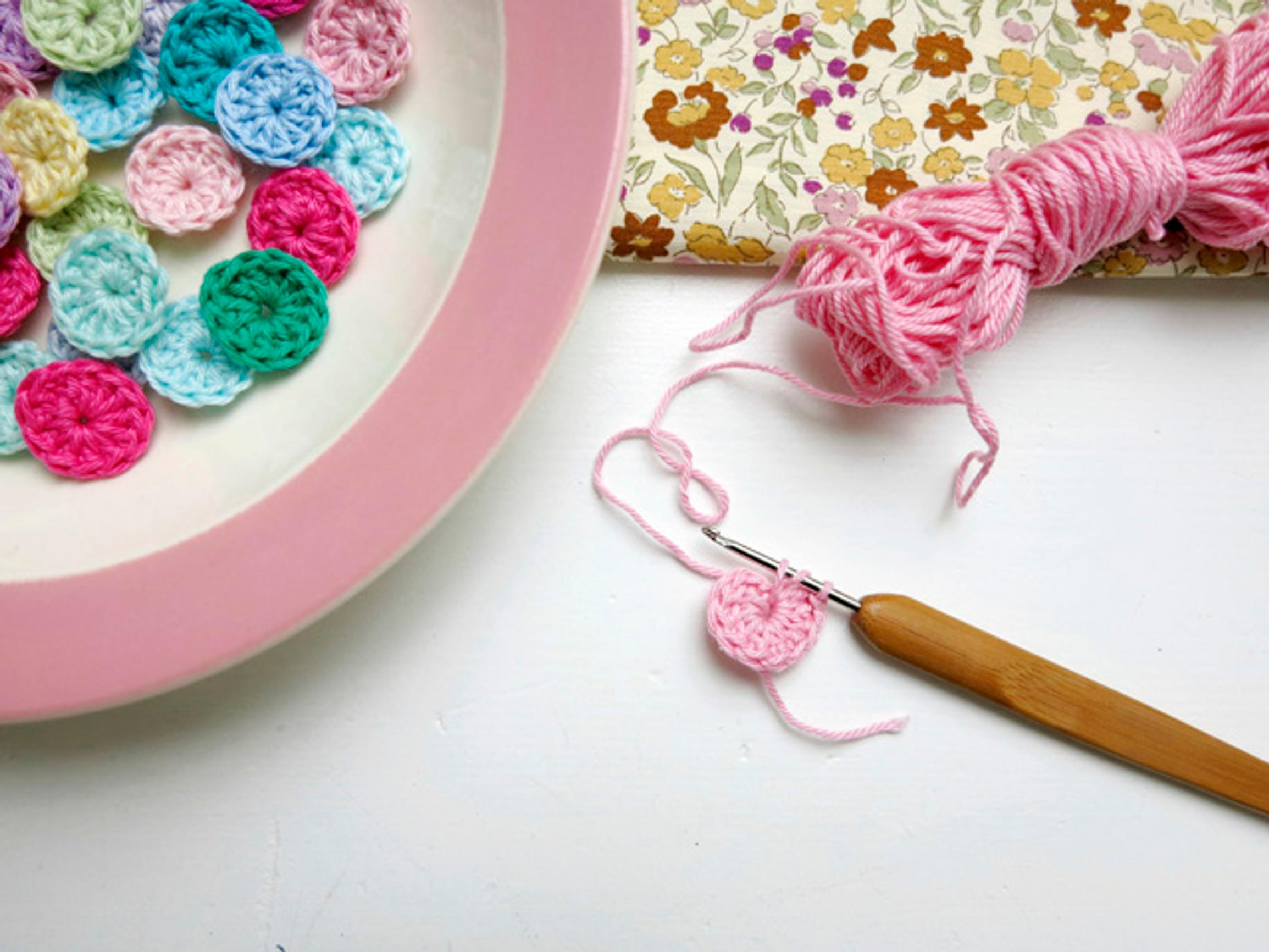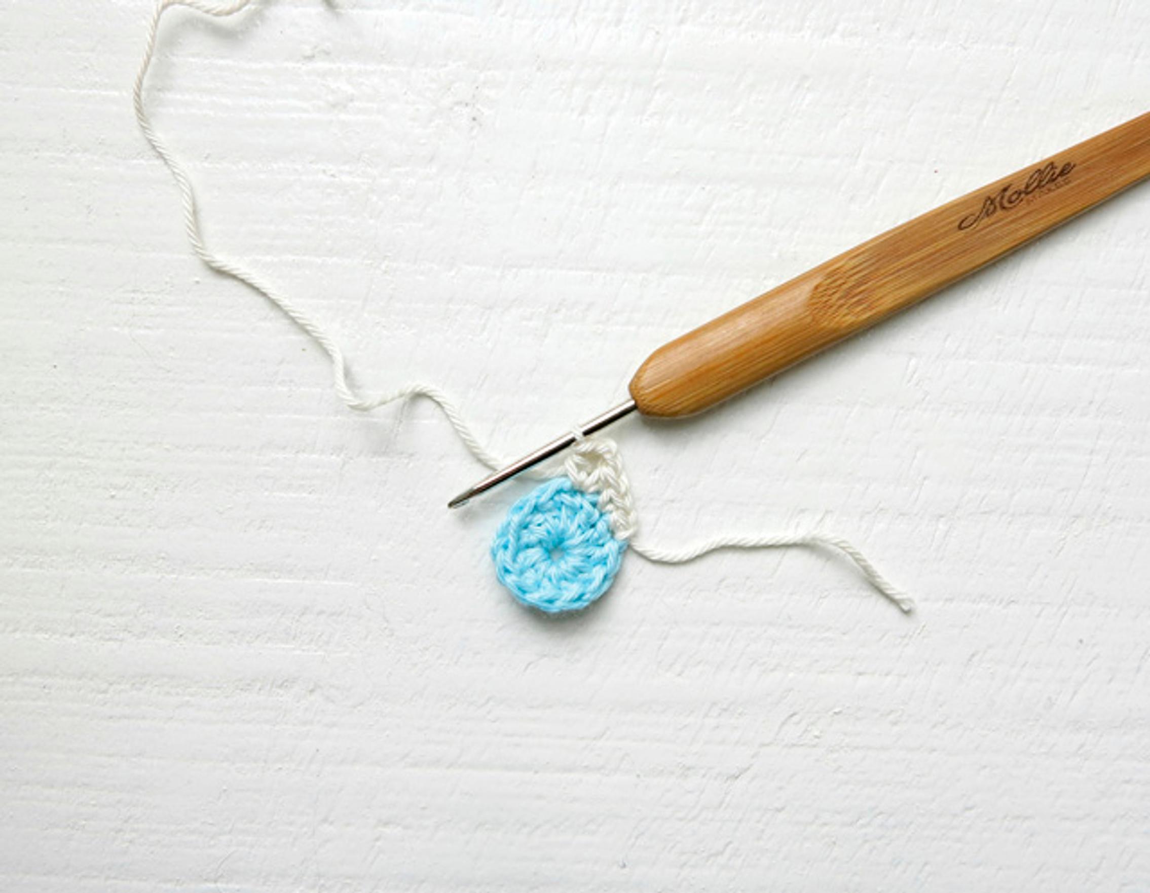 1. Virkkaa pyörylä. Virkkaa ensimmäisellä värillä 4 kjs ja yhdistä s:t renkaaksi 1 ps:lla. Virkkaa 2 kjs (vastaa kerroksen ensimmäistä p), 11 p renkaaseen, sulje krs 1 ps:lla alun 2. kjs:aan. Katkaise lanka.