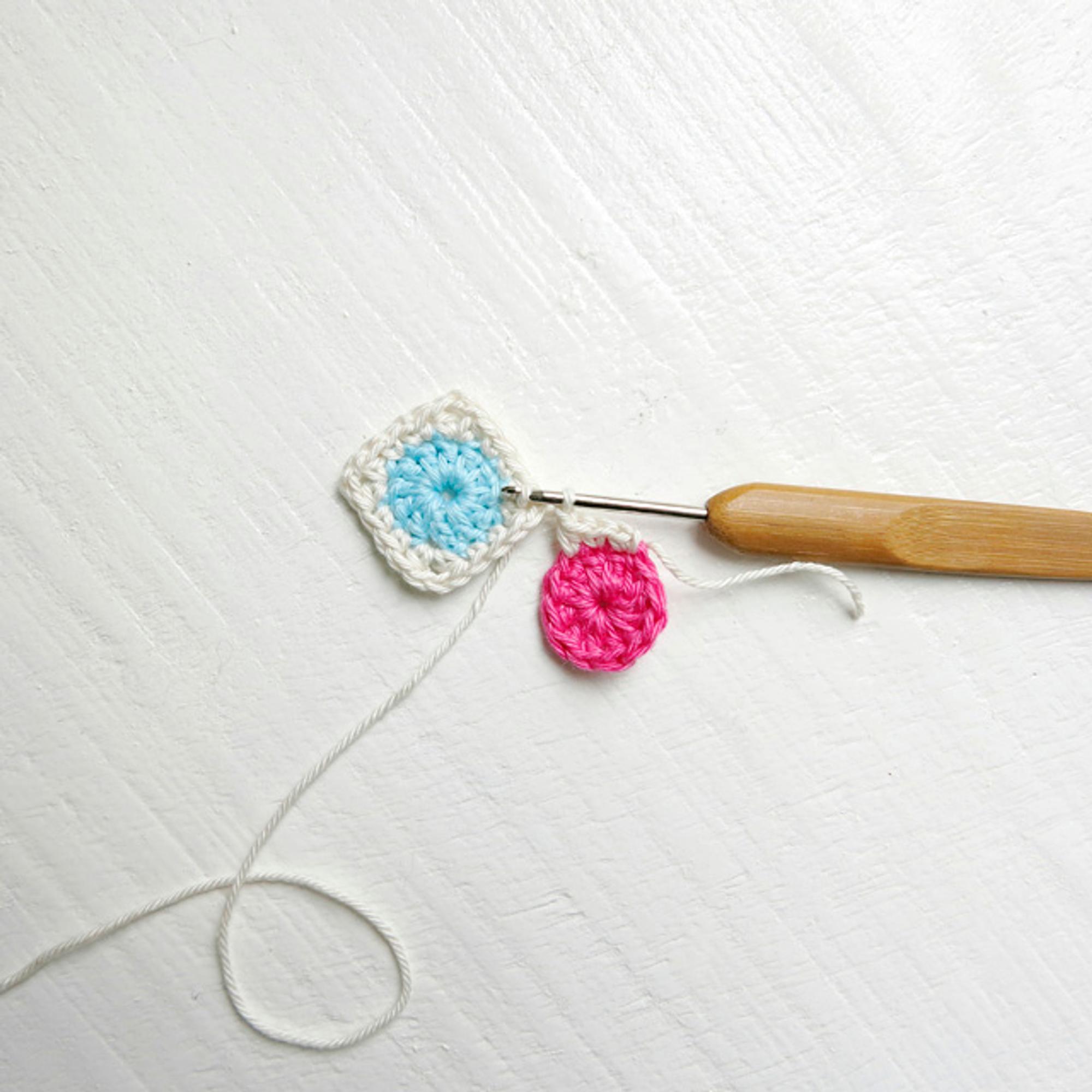 2. Virkkaa neliöksi: kiinnitä valkoinen lanka 1 ps:lla johonkin p:een (tätä ei lasketa silmukaksi), *1 ks kumpaankin seuraavaan 2 silmukkaan, (½ p, 2 kjs, ½ p) seuraavaan s:aan*, toista *–* vielä 3 kertaa. Katkaise lanka ja päätä langanpäät.