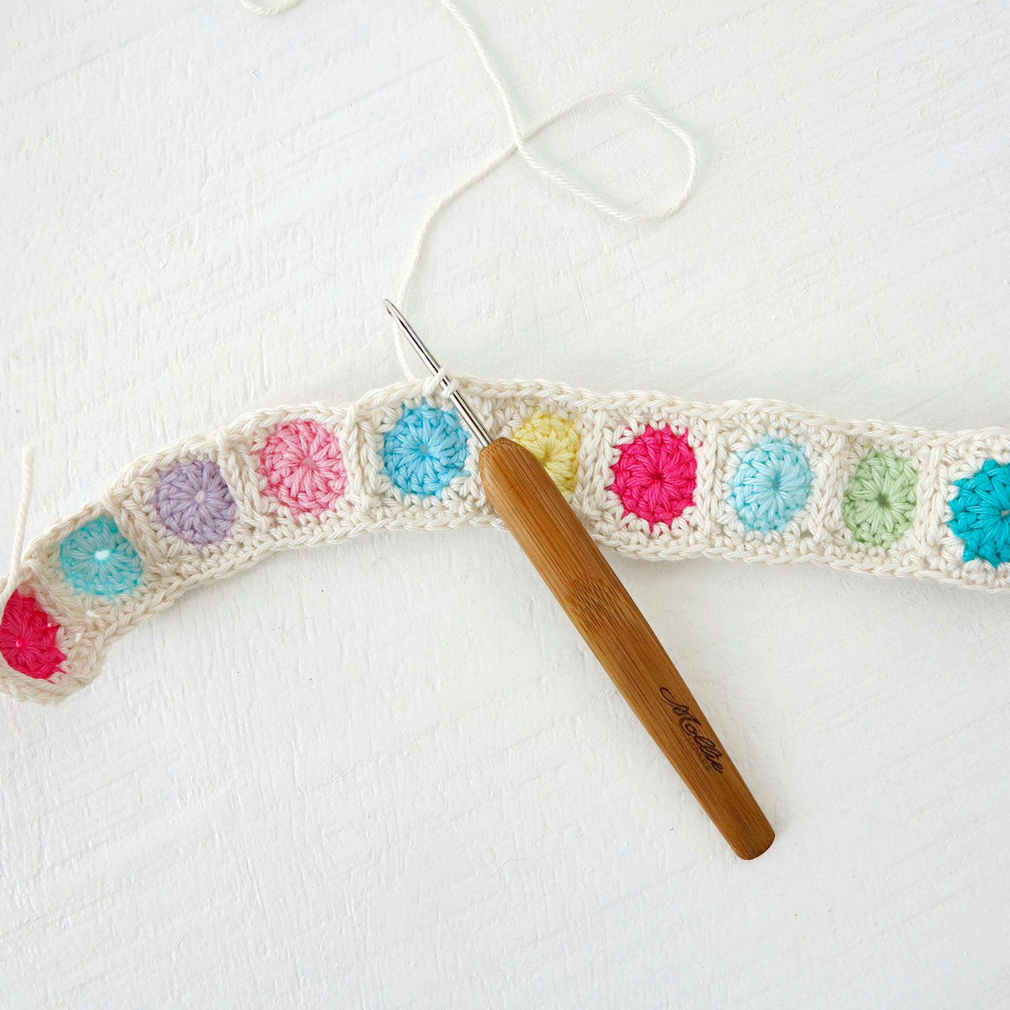 Tämä malli virkataan poikittain. Värinvaihtoja on vain muutama, joten päätettäviä langanpäitä ei tule montaa. Aloita ensimmäisellä värillä ja luo niin pitkä kjs-ketju, että se riittää henkarin ympäri. Tässä virkattiin 18 kjs, mutta silmukkamäärä riippuu henkaristasi.