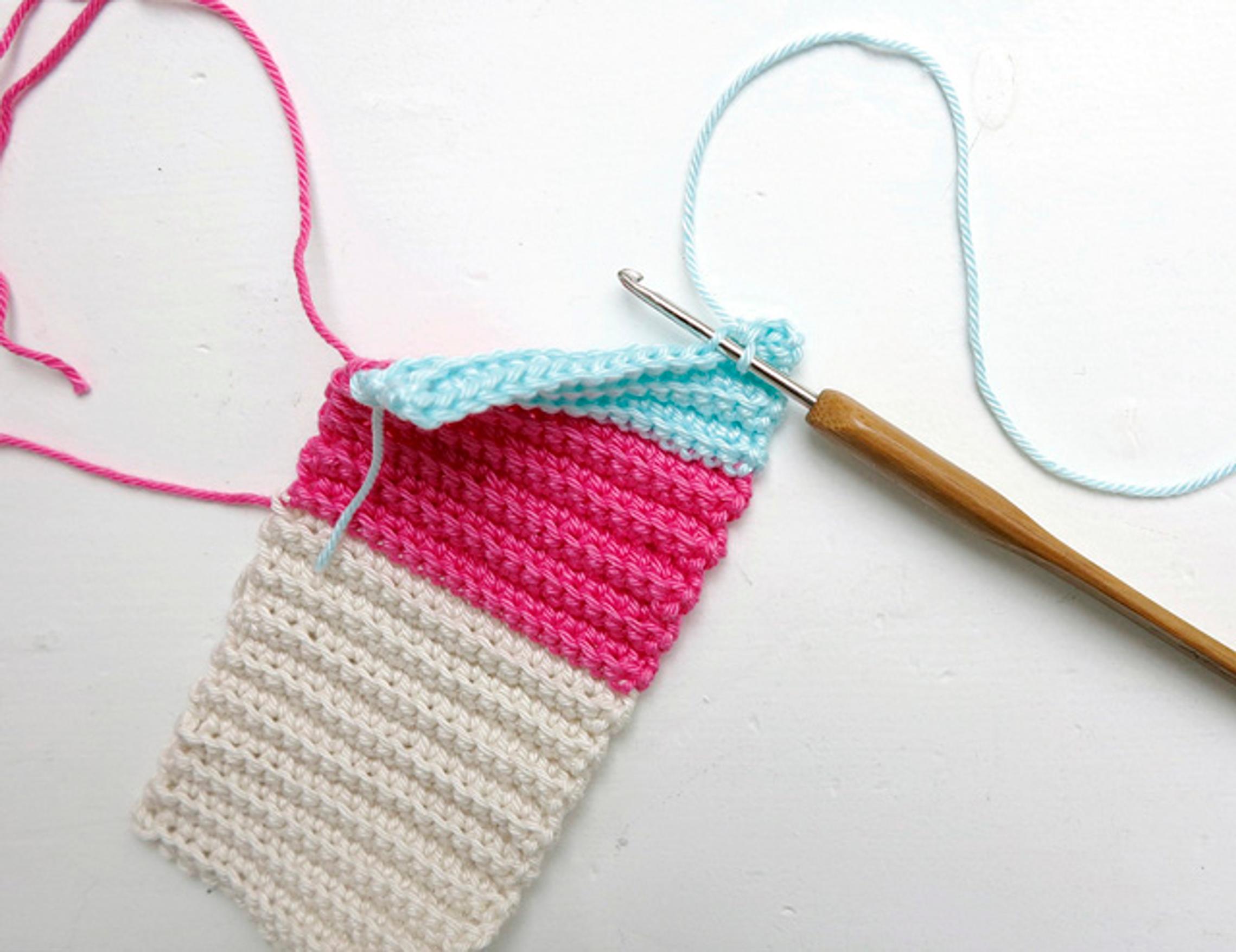 3. Vuorottele värejä A ja B ja virkkaa kuten 2. krs niin kauan, että kaitale ylettyy peittämään henkarin. Päätä langanpäät.