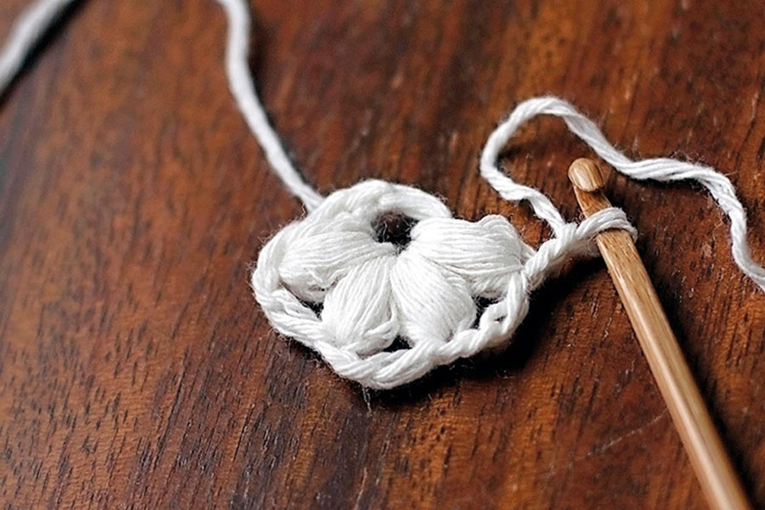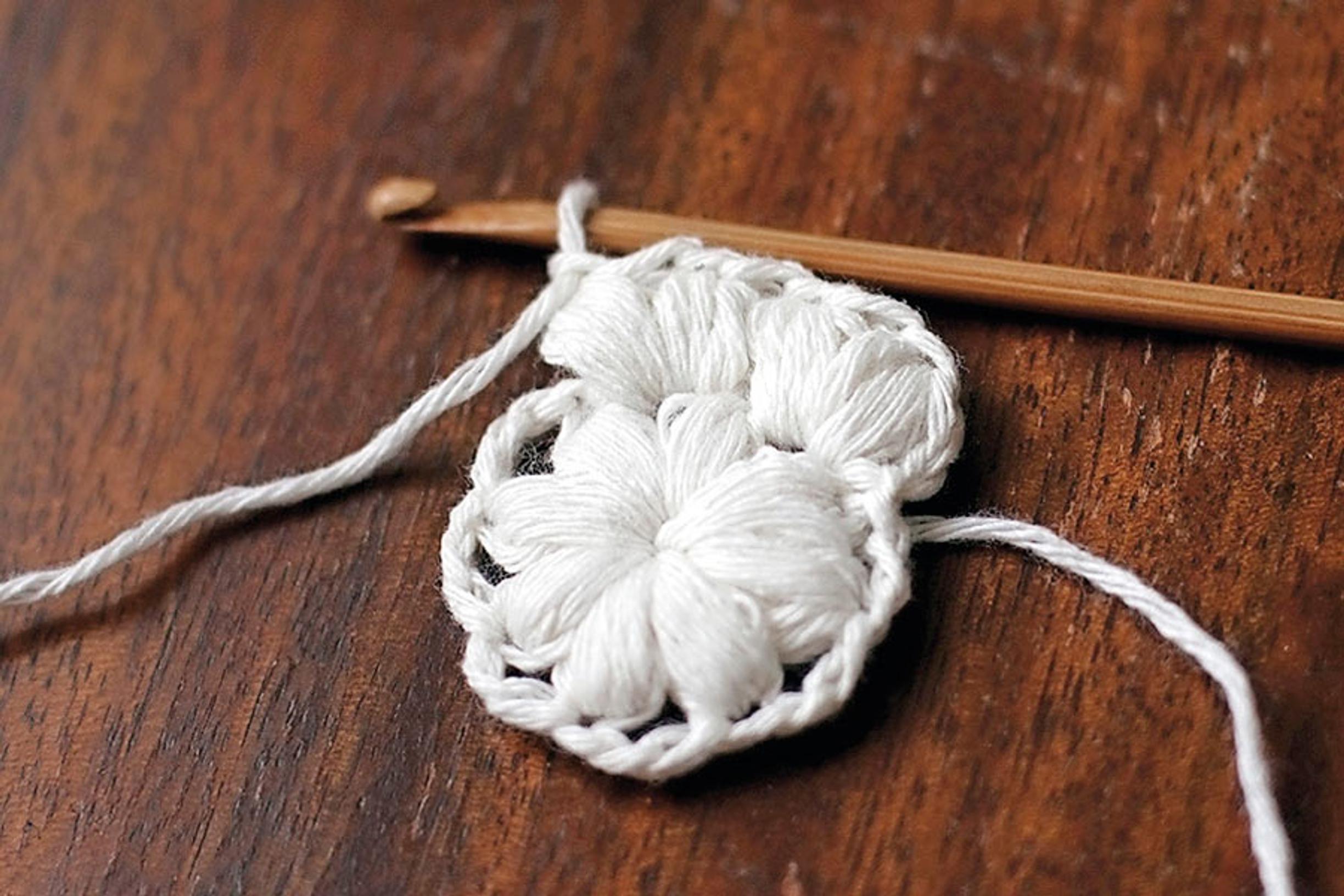 pallo = * 1 langankierto koukulle, pistä koukku s:aan, ota lanka koukulle ja venytä pylvään korkuiseksi (= noin 1 cm korkeaksi) *, toista *–* vielä 4 kertaa, ota sitten lanka koukulle ja vedä kerralla kaikkien 11 lankas:n läpi, sulje palloksi yhdellä ketjusilmukalla.