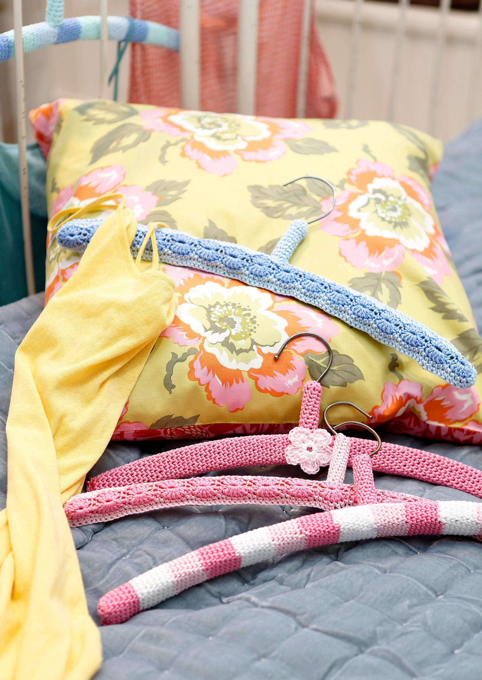 4. Virkkaa tuubien toinen pää umpeen piilosilmukoilla. Vedä tuubit henkarin päälle ja ompele kiinni toisiinsa.