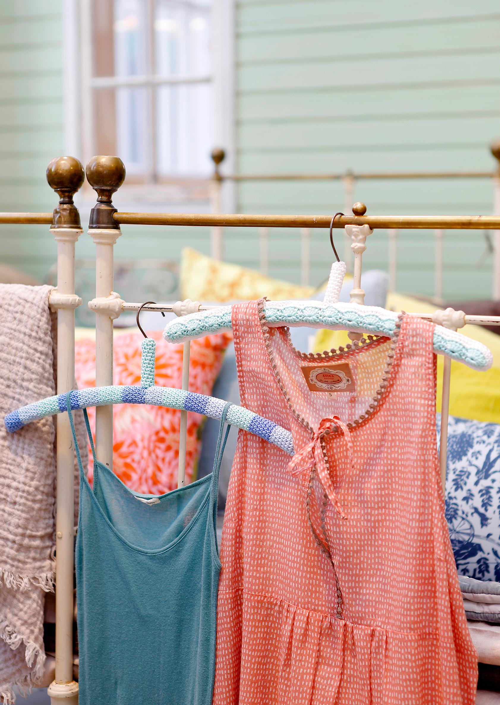 Saat puuhenkareita muutamalla kymmenellä sentillä kirpparilta, jos sinulla ei satu olemaan niitä omasta takaa. Vaatepuiden pituus ja paksuus vaihtelevat, joten tee ensin mallivirkkaus ja laske tarvittava silmukkamäärä. Merseroidulla puuvillalangalla syntyy mukavan tuntuista pintaa, jota on joutuisa virkata.
